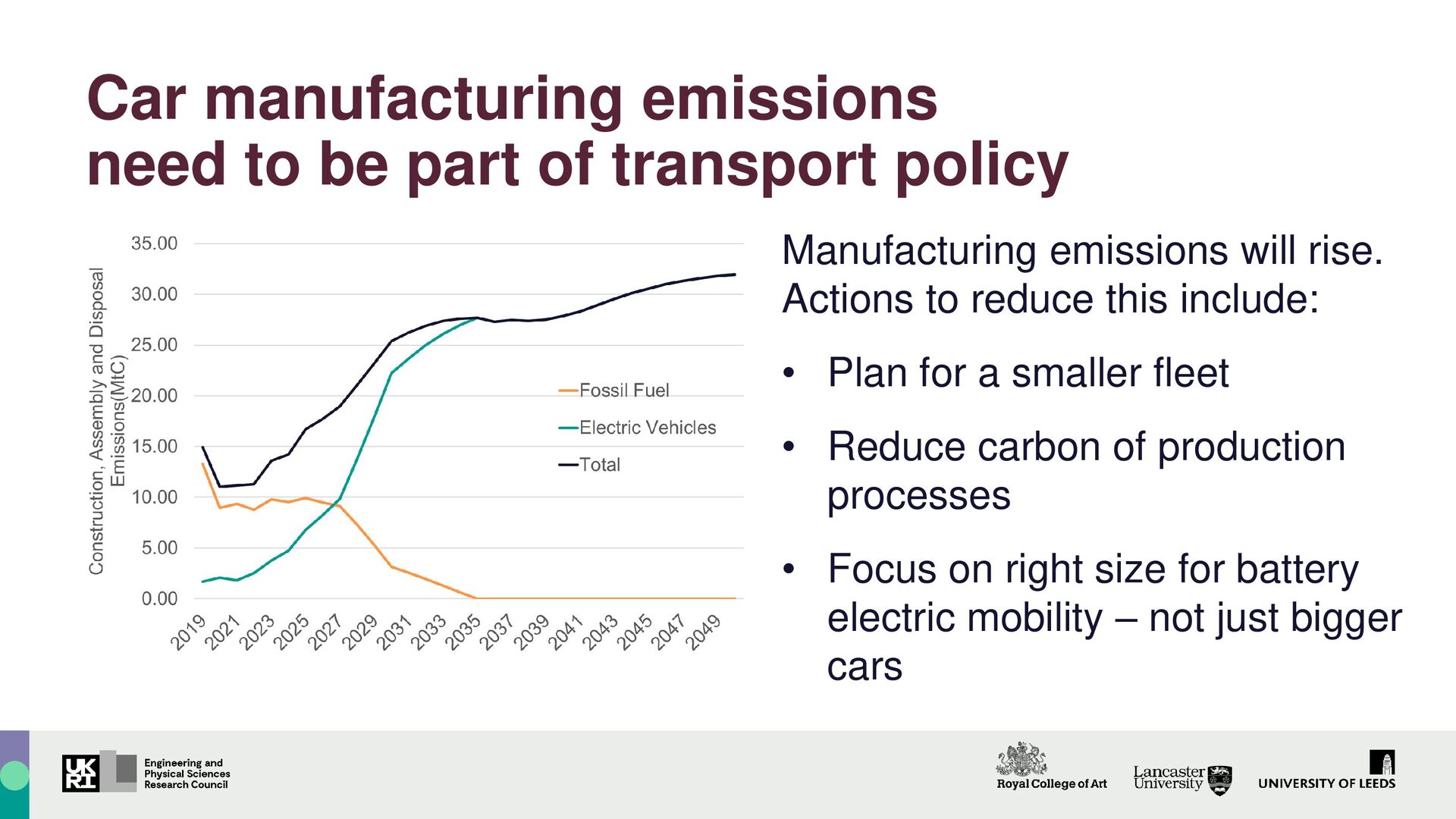 Plan for a smaller fleet • Reduce carbon of production processes • Focus on right size for battery electric mobility – not just bigger cars Car manufacturing emissions need to be part of transport policy