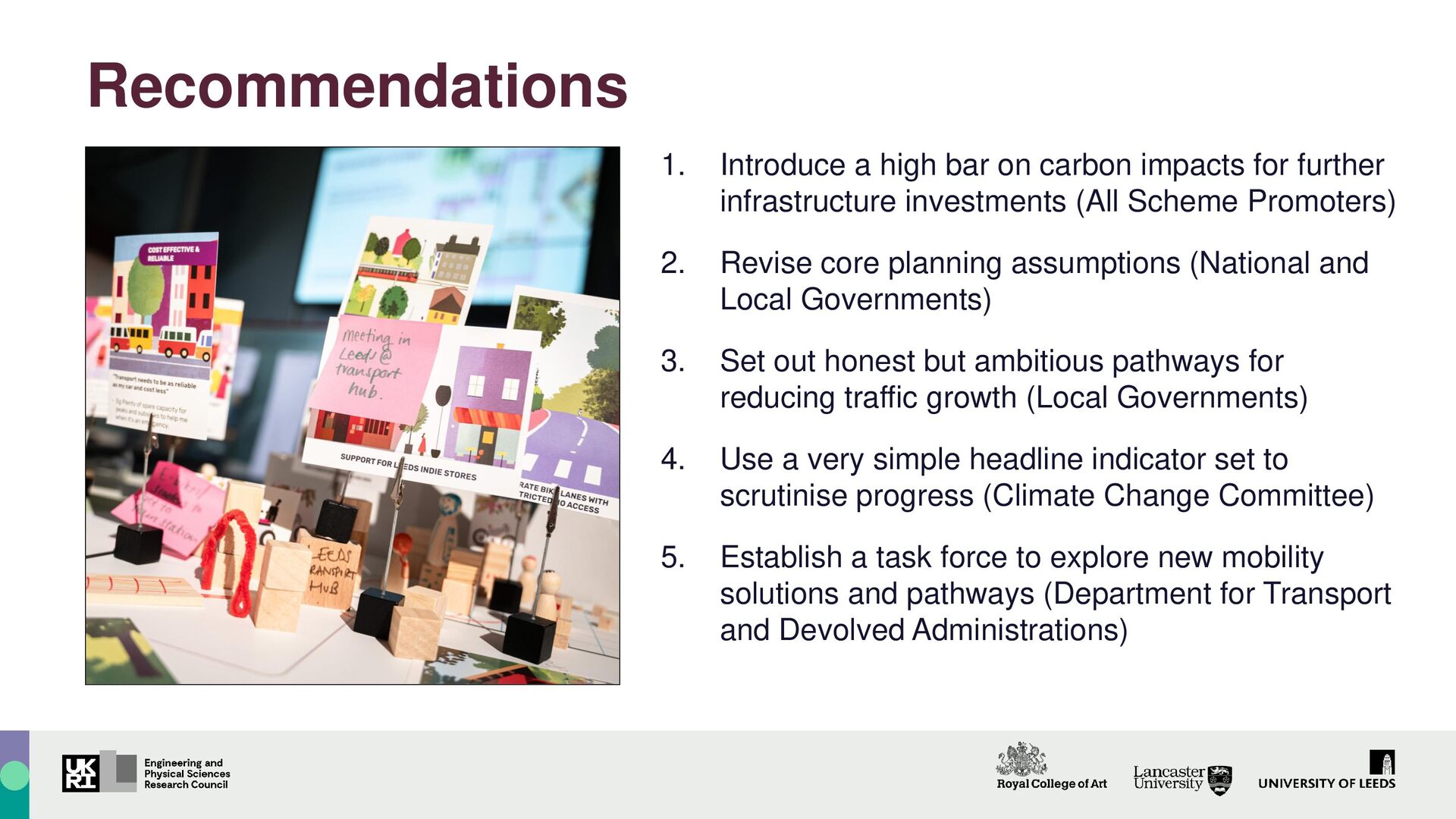 infrastructure investments (All Scheme Promoters) 2. Revise core planning assumptions (National and Local Governments) 3. Set out honest but ambitious pathways for reducing traffic growth (Local Governments) 4. Use a very simple headline indicator set to scrutinise progress (Climate Change Committee) 5. Establish a task force to explore new mobility solutions and pathways (Department for Transport and Devolved Administrations) Recommendations