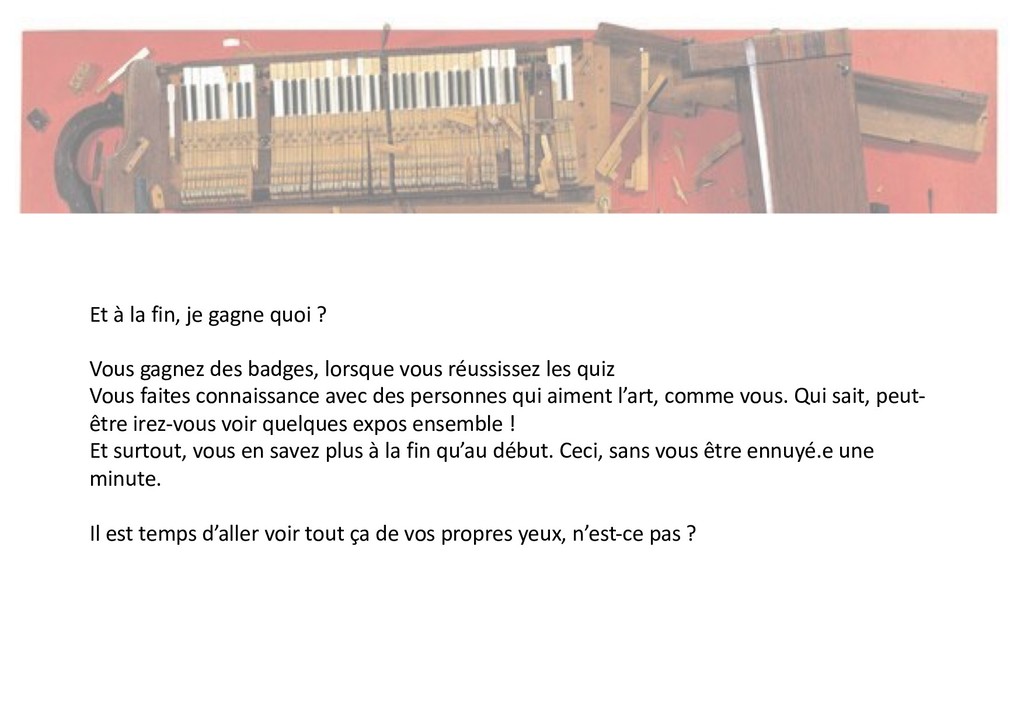 des badges, lorsque vous réussissez les quiz Vous faites connaissance avec des personnes qui aiment l’art, comme vous. Qui sait, peut- être irez-vous voir quelques expos ensemble ! Et surtout, vous en savez plus à la fin qu’au début. Ceci, sans vous être ennuyé.e une minute. Il est temps d’aller voir tout ça de vos propres yeux, n’est-ce pas ?