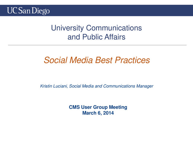 of tools available to help manage multiple social networks, schedule messages, track mentions and measure your social networks: • HootSuite - https://hootsuite.com/ • TweetDeck - https://about.twitter.com/products/tweetdeck • Sprout Social - http://sproutsocial.com/ • Klout - http://klout.com/home • Measured Voice - http://measuredvoice.com/ • Contest Tools: • A few examples of tools available to help you run a contest on social media: • WishPond - http://blog.wishpond.com/ • Votigo - http://www.votigo.com/ • ShortStack - http://www.shortstack.com/ • Statigram - http://statigr.am/instagram-contest-toolkit • UC San Diego social media mailing list: https://mailman.ucsd.edu/mailman/listinfo/social-media-ucsd-l • UC San Diego social media website: http://ucpa.ucsd.edu//resources/social