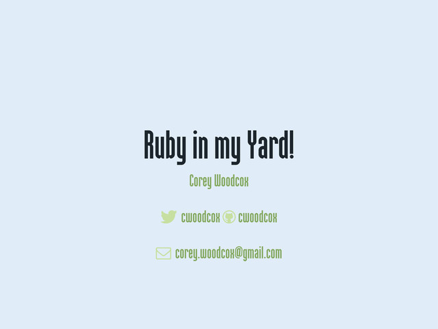 We thought we could do better, and we thought Ruby could help us. With the awesomeness of things like the Raspberry Pi and maybe a little Arduino, who's to say I can't use Ruby to water my lawn, remind me to fertilize, or let me know where I could save a little water?