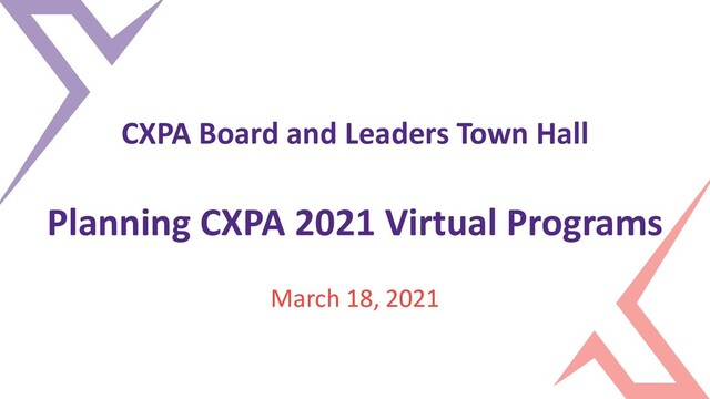 Guidance for 2021 virtual programs • Feedback from participants (survey results) Greg Melia CAE, CXPA CEO • Discussion between leaders (breakout room discussions) All • Sharing plans (Zoom Chat) All • Open conversation: what additional support is needed? All Open mic for Q & A All Closing comments Agenda CXPA Virtual Programs Listening and Engagement Session