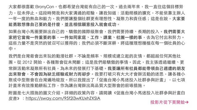 團。從 2012 開始,各種聚會從未間斷;這是我們最驕傲的事情。因此,我主張透過繼續、更 常辦活動來凝聚所有社員,為未來的發展打下基礎。我要讓所有社員都能帶領⾃⼰週遭的朋友 出來聚會,不會因為缺乏經驗或財⼒⽽卻步。我要打破只有⼤⼤才會辦活動的迷思,讓各種⼩ 聚或中型聚會在台灣遍地綻放。所以我提出了「促進台灣⼩⾺迷投⼊社群參與計畫」,以七項 計畫來有效推動耕耘⼯作,作為讓台灣辦出⾼品質⼤型聚會的前導措施。 附圖是七⼤措施的圖⽂介紹。詳細的政策內容,請閱讀《促進台灣⼩⾺迷投⼊社群參與計畫⽩ ⽪書》:https://sway.com/95f2i3wKUxhZXSlA 投影⽚從下⾴開始➔