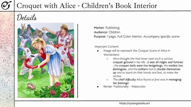 Queen Quotes: Alice thought she had never seen such a curious croquet-ground in her life : it was all ridges and furrows ; the croquet-balls were live hedgehogs, the mallets live flamingoes, and the soldiers had to double themselves up and to stand on their hands and feet, to make the arches. The chief difficulty Alice found at first was in managing her flamingo : she succeeded in getting its body tucked away, comfortably enough, under her arm, with its legs hanging down, but generally, just as she had got its neck nicely straightened out, and was going to give the hedgehog a blow with its head, it would twist itself round and look up into her face, with such a puzzled expression that she could not help bursting out laughing: and when she had got its head down, and was going to begin again, it was very provoking to find that the hedgehog had unrolled itself, and was in the act of crawling away: besides all this, there was generally a ridge or furrow in the way wherever she wanted to send the hedgehog to, and, as the doubled-up soldiers were always getting up and walking off to other parts of the ground, Alice soon came to the conclusion that it was a very difficult game indeed. The players all played at once without waiting for turns, quarreling all the while, and fighting for the hedgehogs; and in a very short time the Queen was in a furious passion, and went stamping about, and shouting, “Off with his head!” or “Off with her head!” about once a minute. …….. She was looking about for some way of escape, and wondering whether she could get away without being seen, when she noticed a curious appearance in the air : it puzzled her very much at first, but after watching it a minute or two she made it out to be a grin, and she said to herself, “ It’s the Cheshire Cat: now I shall have somebody to talk to.” “ How are you getting on ?” said the Cat, as soon as there was mouth enough for it to speak with Thoughts: Rolling Hills Near a castle Rose Bushes Cards/Soldiers Red Queen - Card? King - Card White Rabbit Cheshire Cat head - SMILE Flamingo hedgehog Girl (Alice) - Flailing/ manhandling the flamingo - Layers of activity - Erratic - Strange