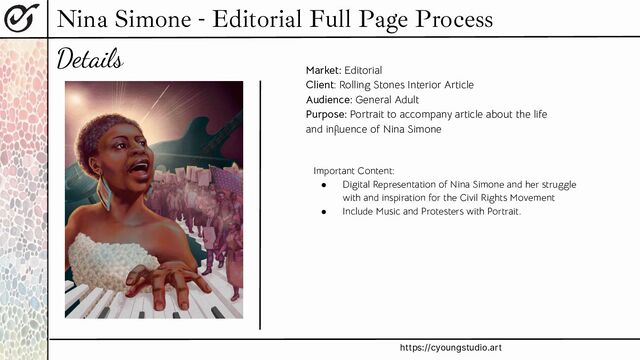 Editorial Client: Rolling Stones Interior Article Audience: General Adult Purpose: Portrait to accompany article about the life and influence of Nina Simone Important Content: • Digital Representation of Nina Simone and her struggle with and inspiration for the Civil Rights Movement • Include Music and Protesters with Portrait.