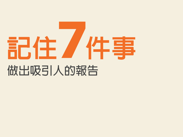 從 “7 Core Ideas To Deliver Interesting Presentations” 精簡出來並翻譯成中文,用 15 分鐘講解給國中生聽的版本,所以比較簡陋。完整的版本可以參閱 https://drive.google.com/open?id=0B2lXqptH_JRPcFhjOV9SMjhwMVk