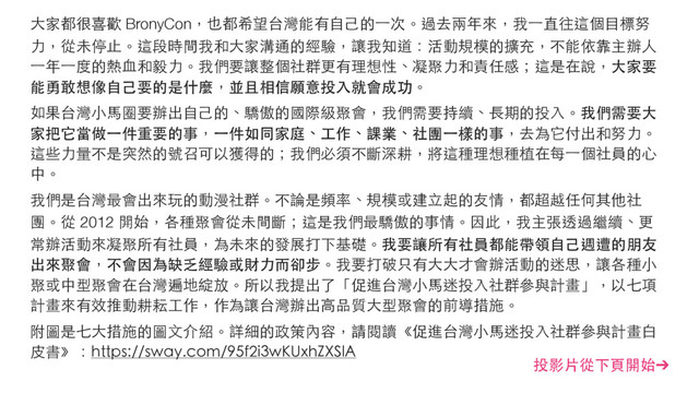 團。從 2012 開始,各種聚會從未間斷;這是我們最驕傲的事情。因此,我主張透過繼續、更 常辦活動來凝聚所有社員,為未來的發展打下基礎。我要讓所有社員都能帶領⾃⼰週遭的朋友 出來聚會,不會因為缺乏經驗或財⼒⽽卻步。我要打破只有⼤⼤才會辦活動的迷思,讓各種⼩ 聚或中型聚會在台灣遍地綻放。所以我提出了「促進台灣⼩⾺迷投⼊社群參與計畫」,以七項 計畫來有效推動耕耘⼯作,作為讓台灣辦出⾼品質⼤型聚會的前導措施。 附圖是七⼤措施的圖⽂介紹。詳細的政策內容,請閱讀《促進台灣⼩⾺迷投⼊社群參與計畫⽩ ⽪書》:https://sway.com/95f2i3wKUxhZXSlA 投影⽚從下⾴開始➔