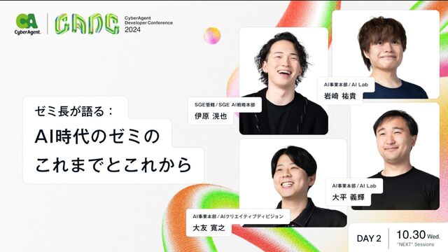 サイバーエージェントでは「ゼミ制度」が設けられており、自身の興味のある技術や研究などのスキルアップを目的として活動が支援されています。本セッションでは特にAIを活用しているゼミのゼミ長らを招き、それぞれのゼミの活動内容やAIをどのように扱っているかについてご紹介します。また、AIとの向き合い方がどのように変わってきたか、変わっていくかについてお話しします。