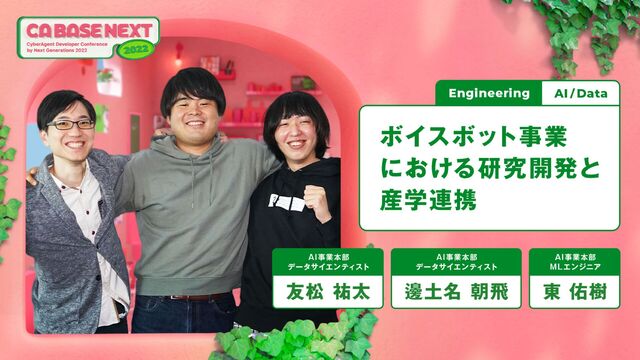 本セッションでは,実際に研究開発および共同研究に携わっているAIチームリーダーと若手2名が,これまでのボイスボットの研究開発の取り組みと今後の展望について紹介します。