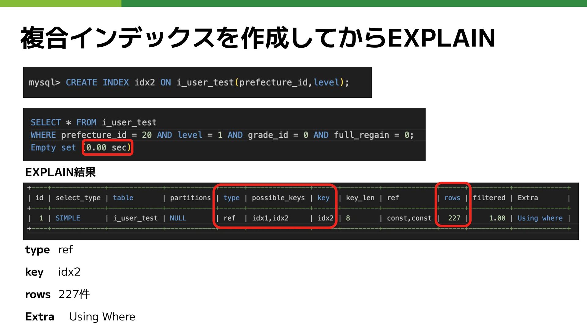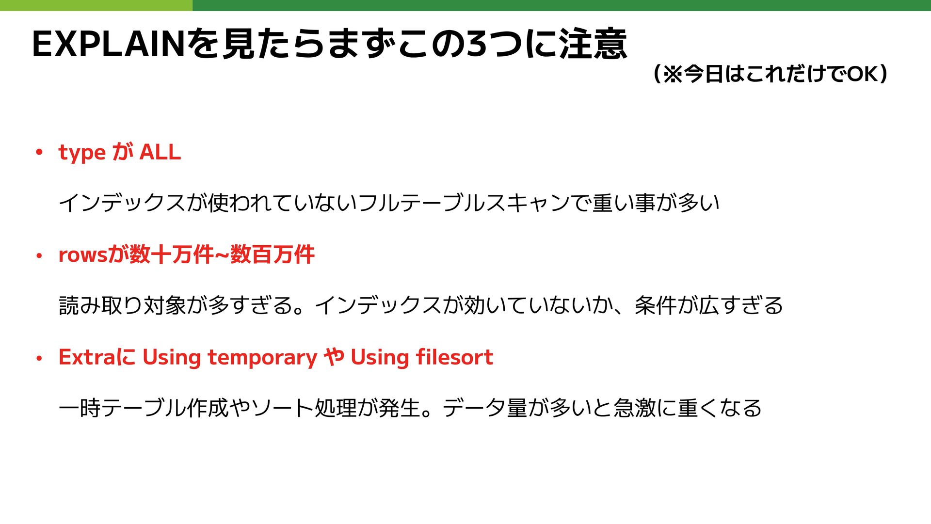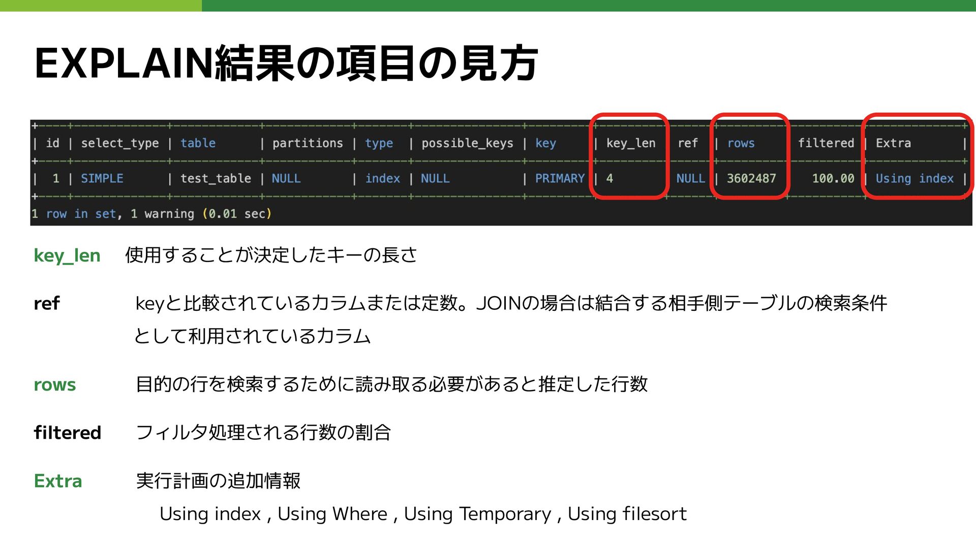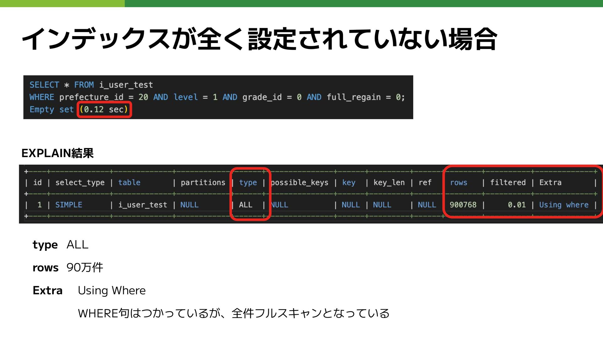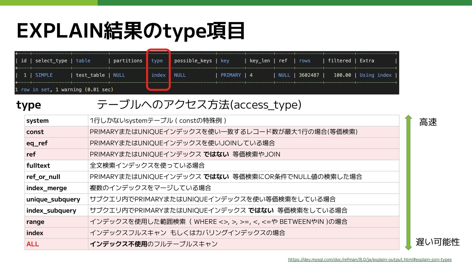const PRIMARYまたはUNIQUEインデックスを使い一致するレコード数が最大1行の場合(等価検索) eq_ref PRIMARYまたはUNIQUEインデックスを使いJOINしている場合 ref PRIMARYまたはUNIQUEインデックス ではない 等価検索やJOIN fulltext 全文検索インデックスを使っている場合 ref_or_null PRIMARYまたはUNIQUEインデックス ではない 等価検索にOR条件でNULL値の検索した場合 index_merge 複数のインデックスをマージしている場合 unique_subquery サブクエリ内でPRIMARYまたはUNIQUEインデックスを使い等価検索をしている場合 index_subquery サブクエリ内でPRIMARYまたはUNIQUEインデックス ではない 等価検索をしている場合 range インデックスを使用した範囲検索( WHERE <>, >, >=, <, <=や BETWEENやIN )の場合 index インデックスフルスキャン もしくはカバリングインデックスの場合 ALL インデックス不使用のフルテーブルスキャン https://dev.mysql.com/doc/refman/8.0/ja/explain-output.html#explain-join-types 遅い可能性 高速
