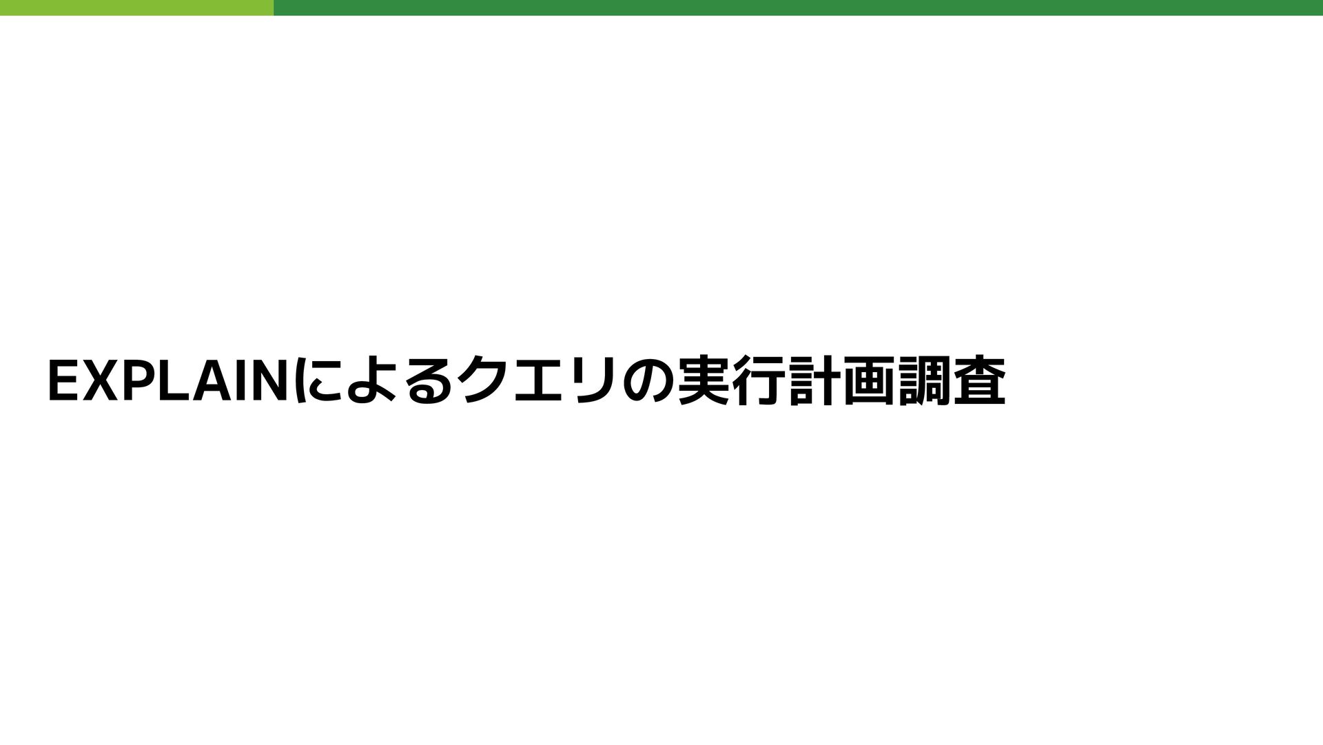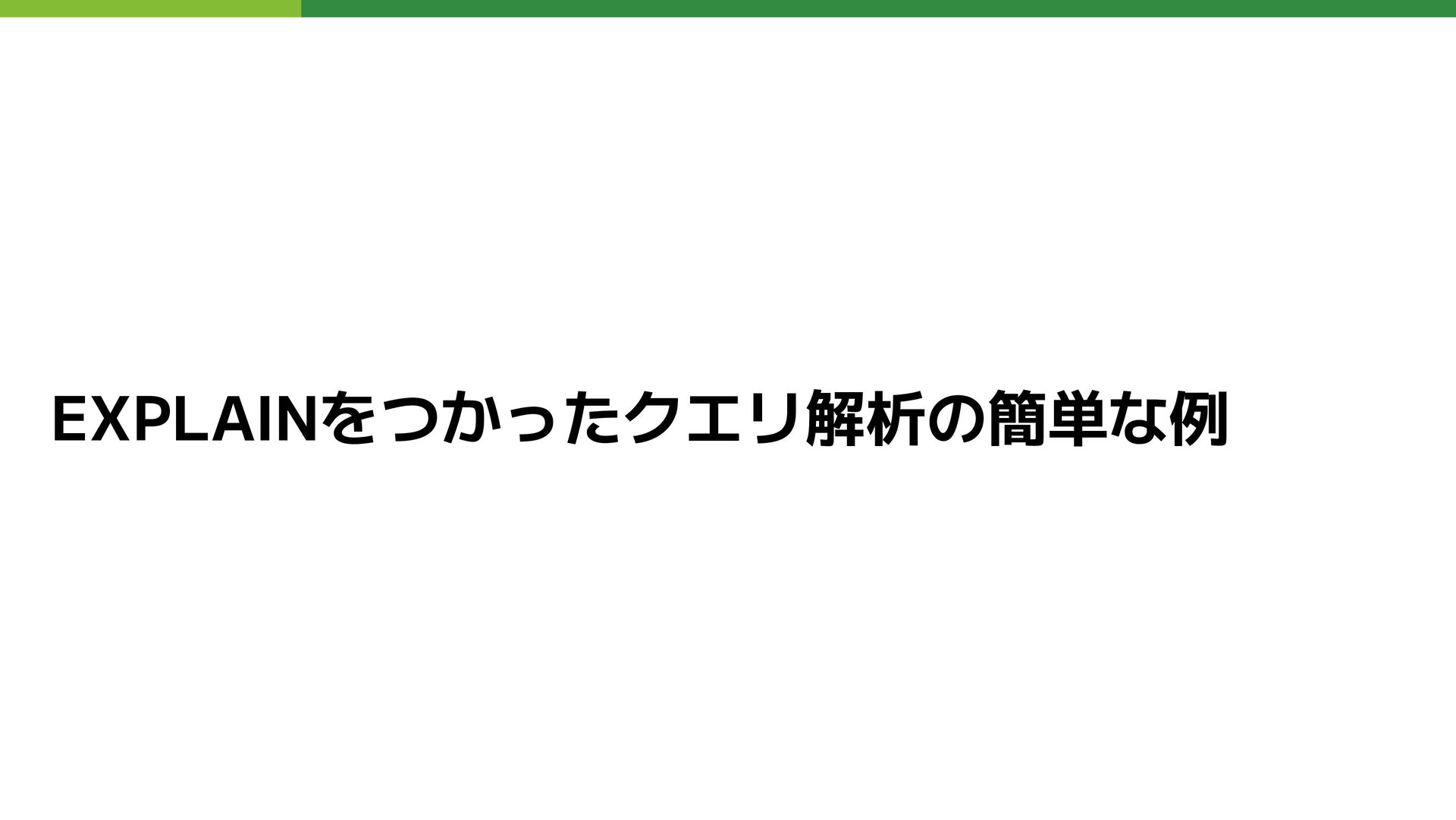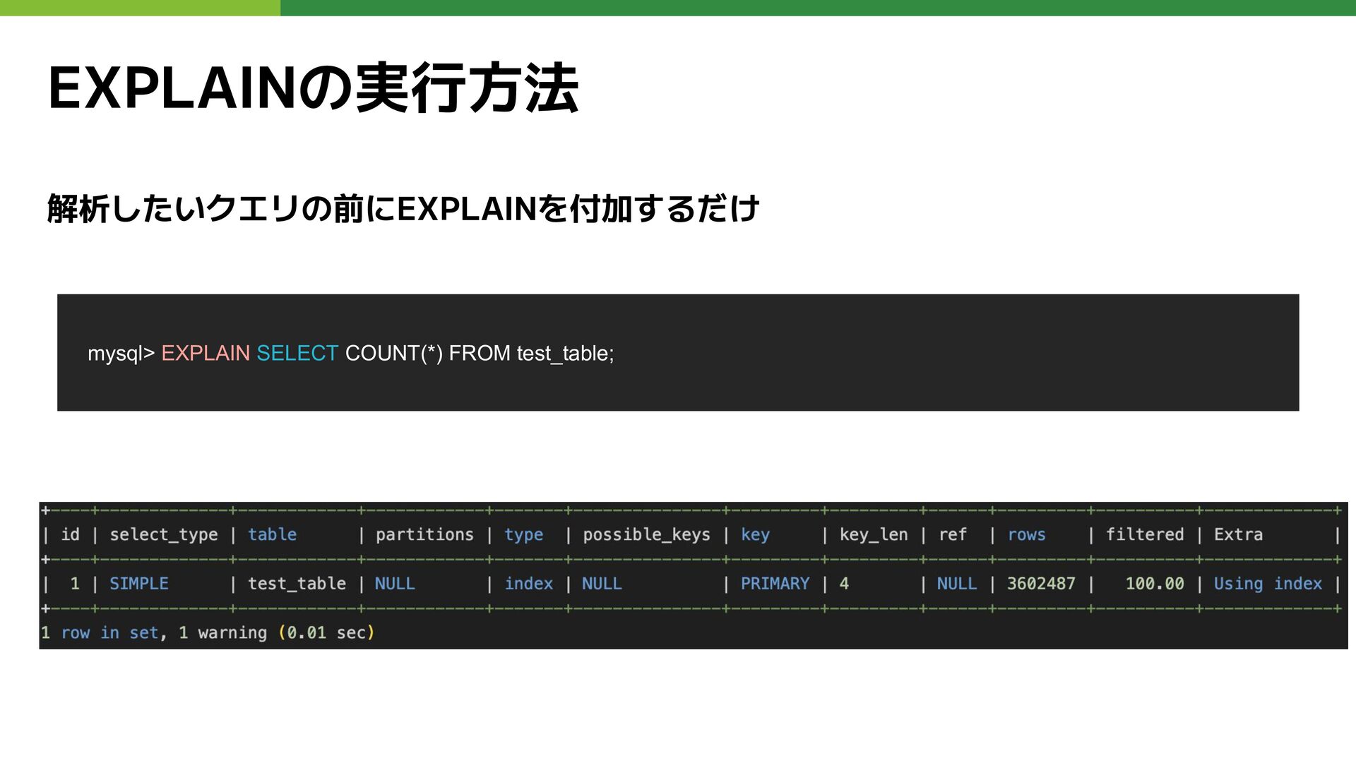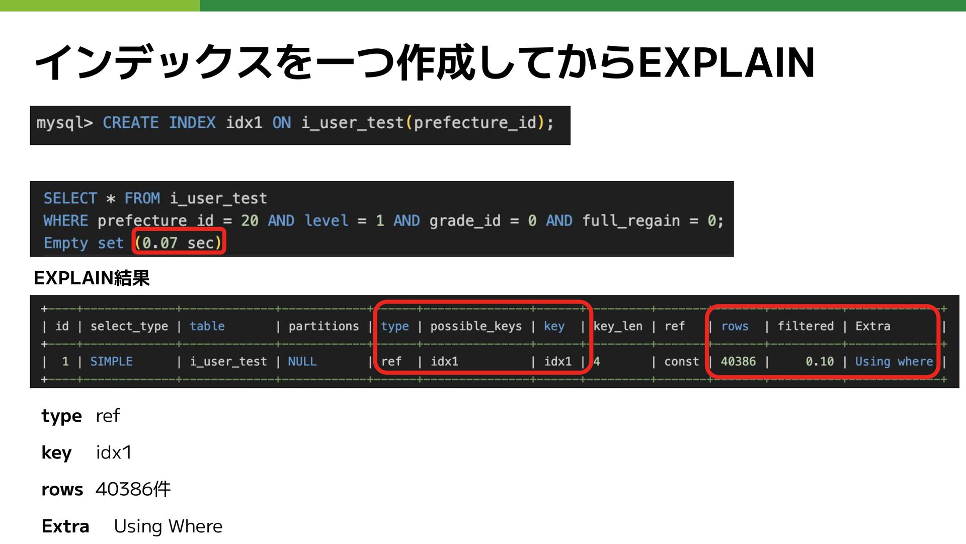 const PRIMARYまたはUNIQUEインデックスを使い一致するレコード数が最大1行の場合(等価検索) eq_ref PRIMARYまたはUNIQUEインデックスを使いJOINしている場合 ref PRIMARYまたはUNIQUEインデックス ではない 等価検索やJOIN fulltext 全文検索インデックスを使っている場合 ref_or_null PRIMARYまたはUNIQUEインデックス ではない 等価検索にOR条件でNULL値の検索した場合 index_merge 複数のインデックスをマージしている場合 unique_subquery サブクエリ内でPRIMARYまたはUNIQUEインデックスを使い等価検索をしている場合 index_subquery サブクエリ内でPRIMARYまたはUNIQUEインデックス ではない 等価検索をしている場合 range インデックスを使用した範囲検索( WHERE <>, >, >=, <, <=や BETWEENやIN )の場合 index インデックスフルスキャン もしくはカバリングインデックスの場合 ALL インデックス不使用のフルテーブルスキャン https://dev.mysql.com/doc/refman/8.0/ja/explain-output.html#explain-join-types 遅い可能性 高速