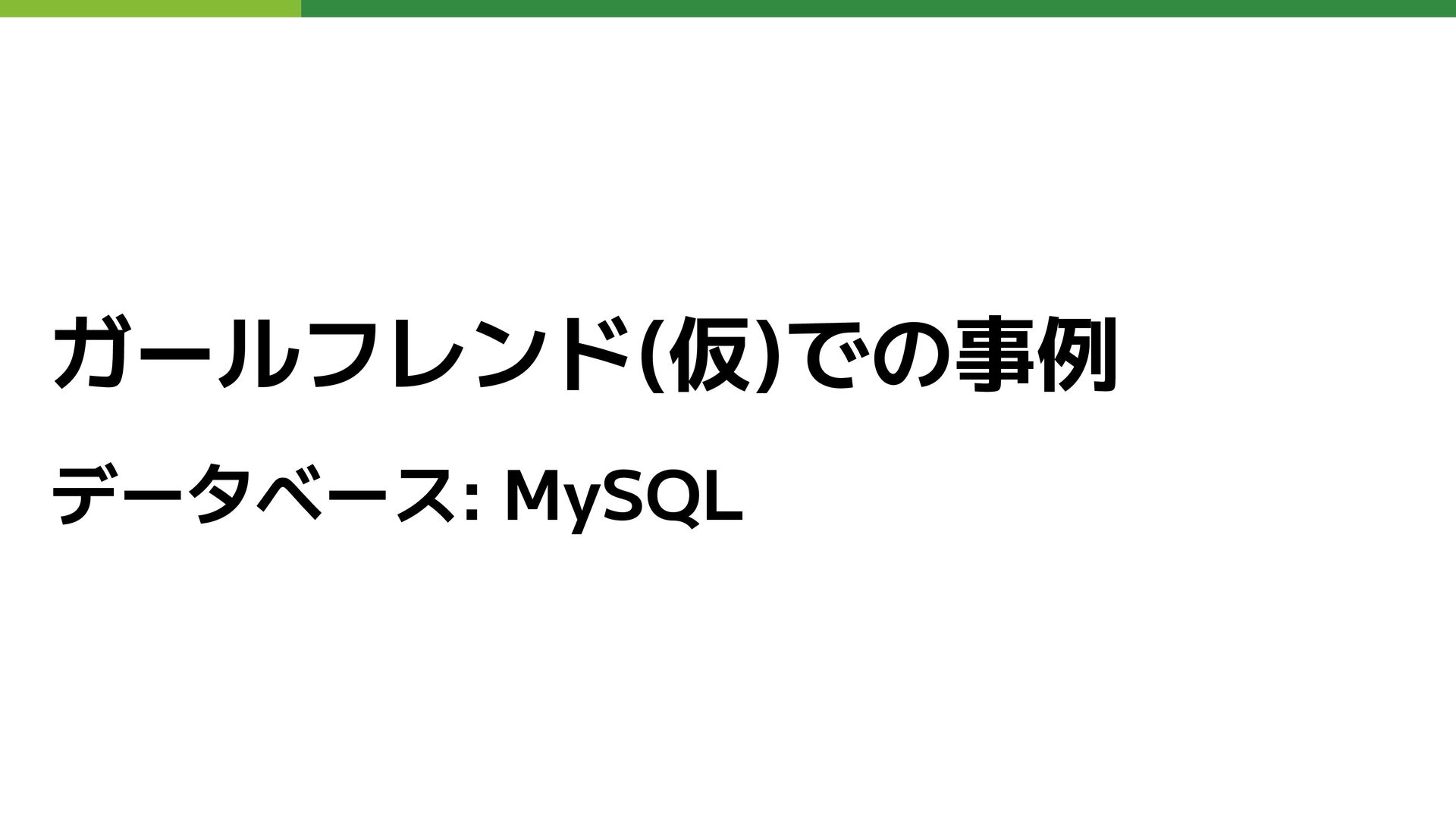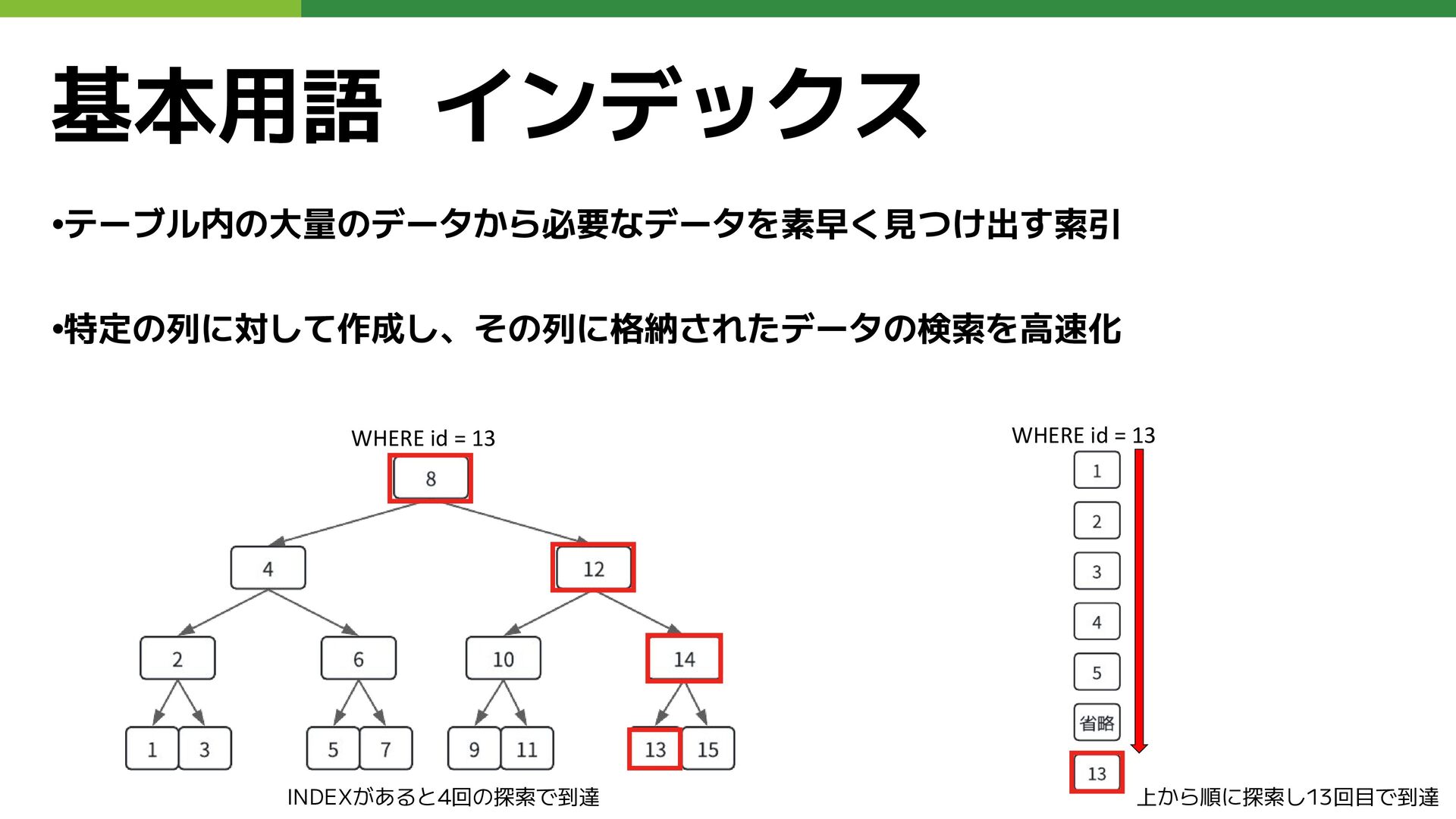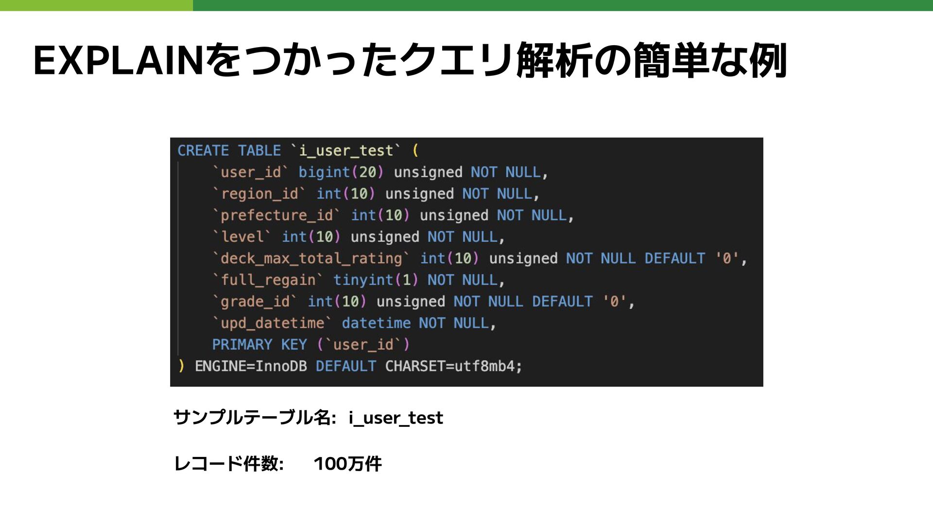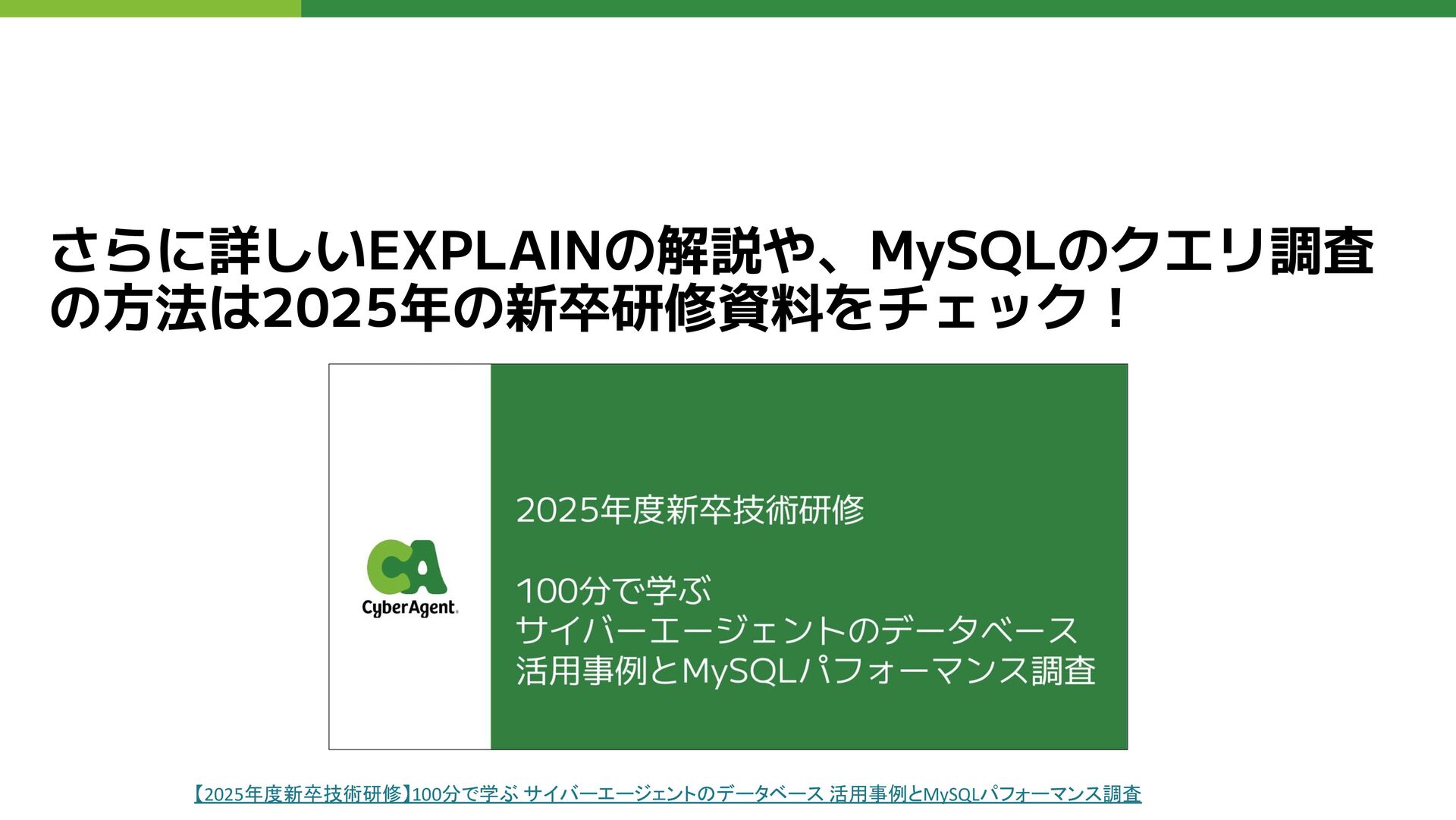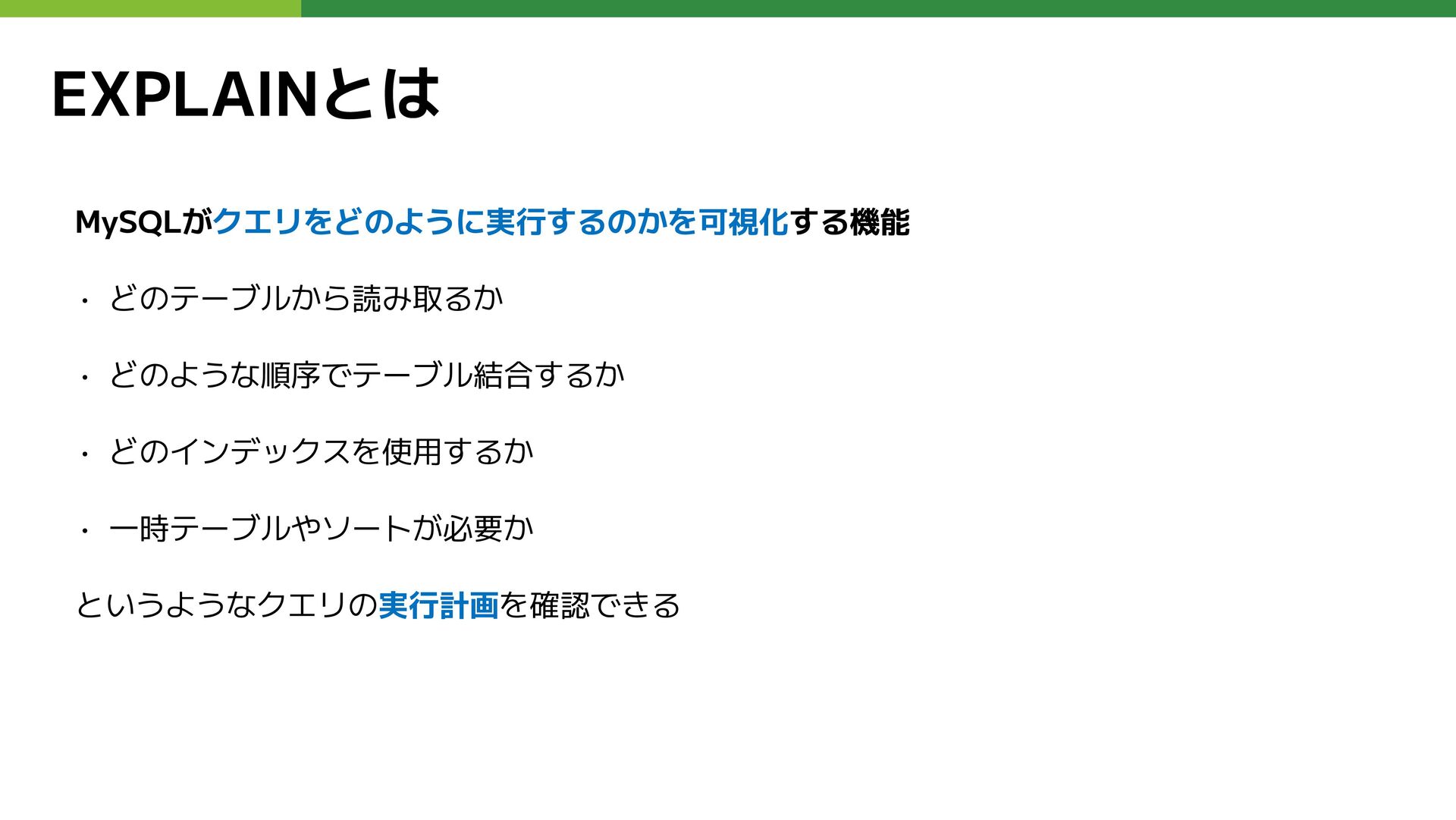 const PRIMARYまたはUNIQUEインデックスを使い一致するレコード数が最大1行の場合(等価検索) eq_ref PRIMARYまたはUNIQUEインデックスを使いJOINしている場合 ref PRIMARYまたはUNIQUEインデックス ではない 等価検索やJOIN fulltext 全文検索インデックスを使っている場合 ref_or_null PRIMARYまたはUNIQUEインデックス ではない 等価検索にOR条件でNULL値の検索した場合 index_merge 複数のインデックスをマージしている場合 unique_subquery サブクエリ内でPRIMARYまたはUNIQUEインデックスを使い等価検索をしている場合 index_subquery サブクエリ内でPRIMARYまたはUNIQUEインデックス ではない 等価検索をしている場合 range インデックスを使用した範囲検索( WHERE <>, >, >=, <, <=や BETWEENやIN )の場合 index インデックスフルスキャン もしくはカバリングインデックスの場合 ALL インデックス不使用のフルテーブルスキャン https://dev.mysql.com/doc/refman/8.0/ja/explain-output.html#explain-join-types 遅い可能性 高速