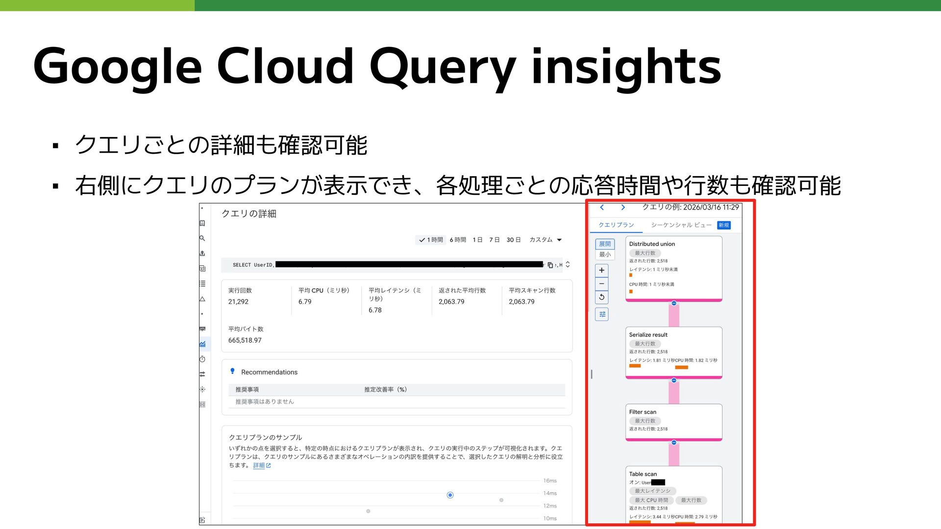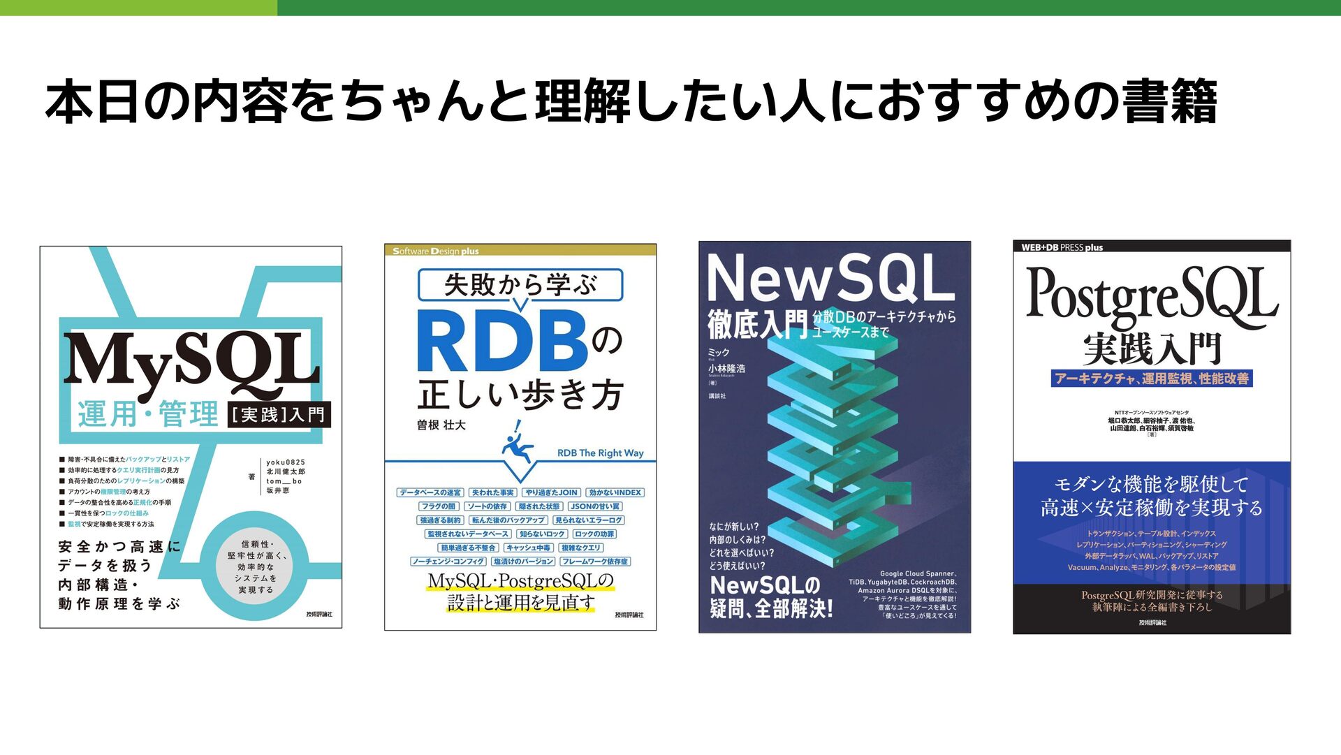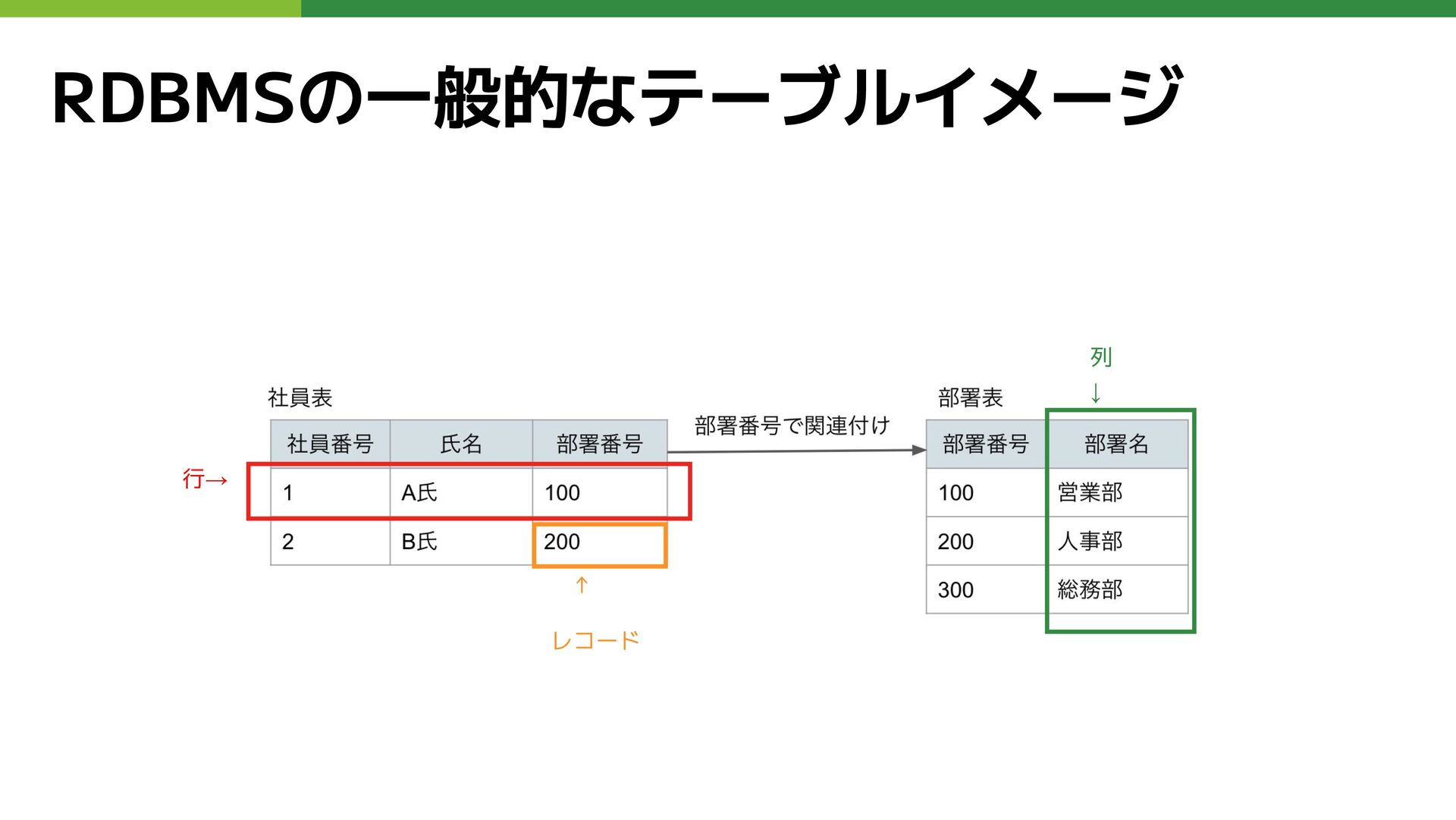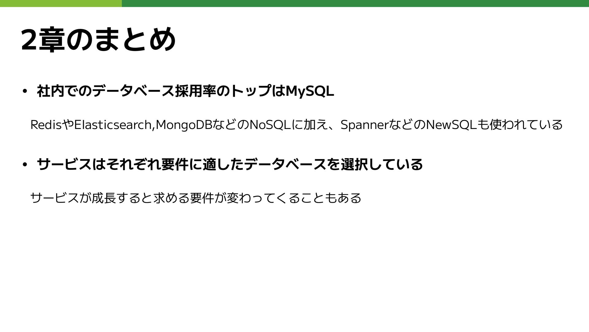 const PRIMARYまたはUNIQUEインデックスを使い一致するレコード数が最大1行の場合(等価検索) eq_ref PRIMARYまたはUNIQUEインデックスを使いJOINしている場合 ref PRIMARYまたはUNIQUEインデックス ではない 等価検索やJOIN fulltext 全文検索インデックスを使っている場合 ref_or_null PRIMARYまたはUNIQUEインデックス ではない 等価検索にOR条件でNULL値の検索した場合 index_merge 複数のインデックスをマージしている場合 unique_subquery サブクエリ内でPRIMARYまたはUNIQUEインデックスを使い等価検索をしている場合 index_subquery サブクエリ内でPRIMARYまたはUNIQUEインデックス ではない 等価検索をしている場合 range インデックスを使用した範囲検索( WHERE <>, >, >=, <, <=や BETWEENやIN )の場合 index インデックスフルスキャン もしくはカバリングインデックスの場合 ALL インデックス不使用のフルテーブルスキャン https://dev.mysql.com/doc/refman/8.0/ja/explain-output.html#explain-join-types 遅い可能性 高速