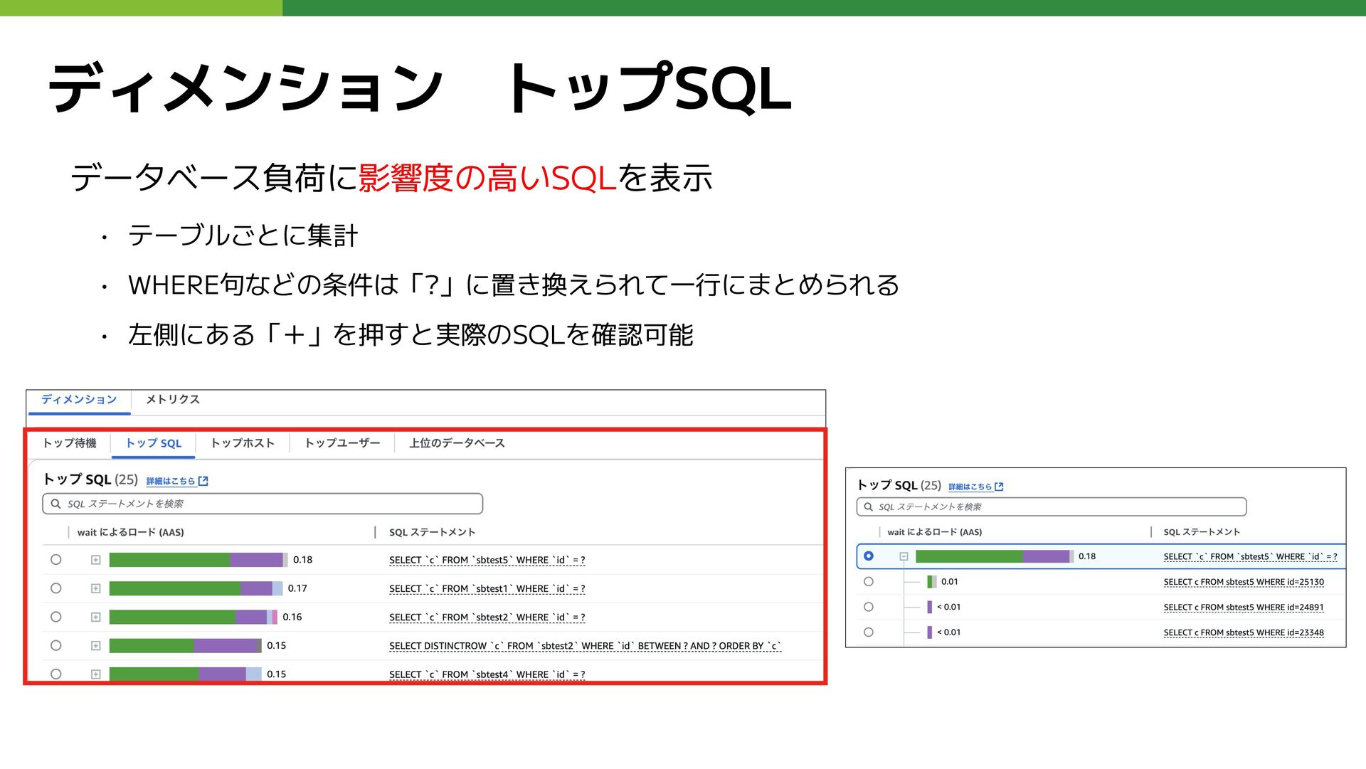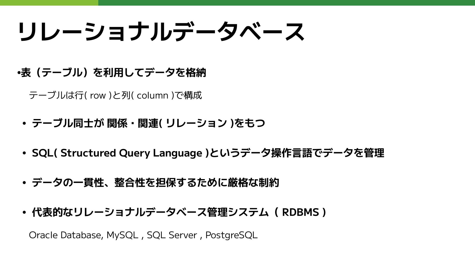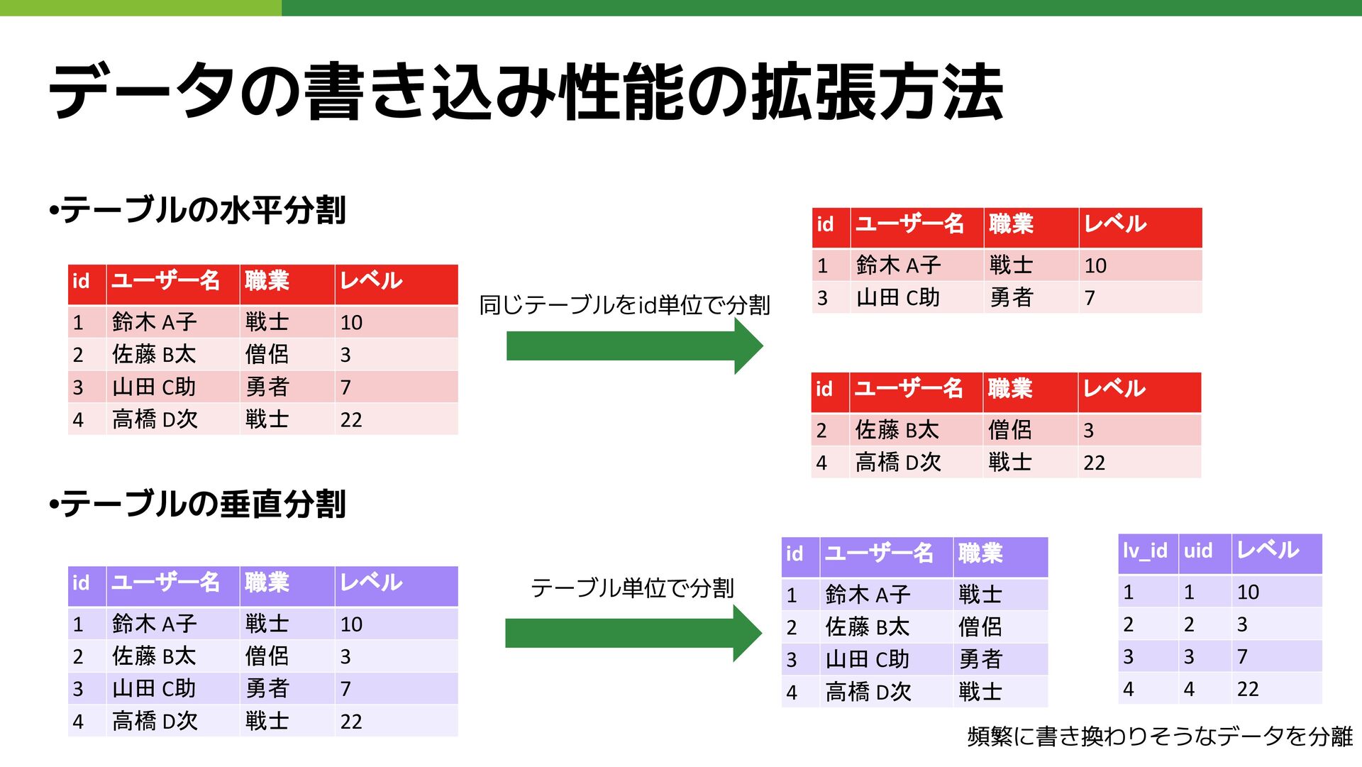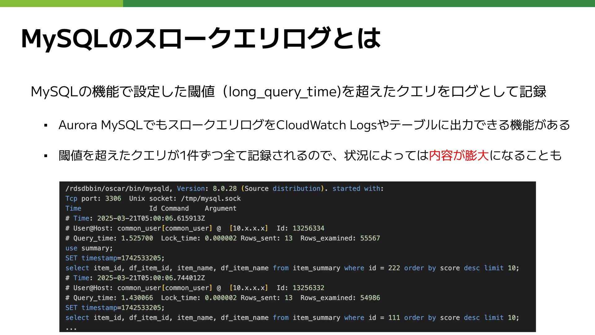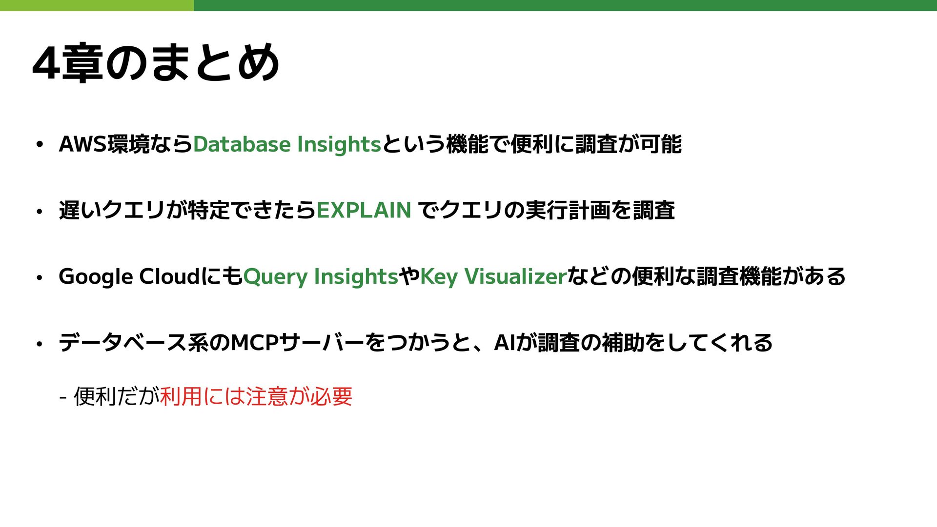 const PRIMARYまたはUNIQUEインデックスを使い一致するレコード数が最大1行の場合(等価検索) eq_ref PRIMARYまたはUNIQUEインデックスを使いJOINしている場合 ref PRIMARYまたはUNIQUEインデックス ではない 等価検索やJOIN fulltext 全文検索インデックスを使っている場合 ref_or_null PRIMARYまたはUNIQUEインデックス ではない 等価検索にOR条件でNULL値の検索した場合 index_merge 複数のインデックスをマージしている場合 unique_subquery サブクエリ内でPRIMARYまたはUNIQUEインデックスを使い等価検索をしている場合 index_subquery サブクエリ内でPRIMARYまたはUNIQUEインデックス ではない 等価検索をしている場合 range インデックスを使用した範囲検索( WHERE <>, >, >=, <, <=や BETWEENやIN )の場合 index インデックスフルスキャン もしくはカバリングインデックスの場合 ALL インデックス不使用のフルテーブルスキャン https://dev.mysql.com/doc/refman/8.0/ja/explain-output.html#explain-join-types 遅い可能性 高速