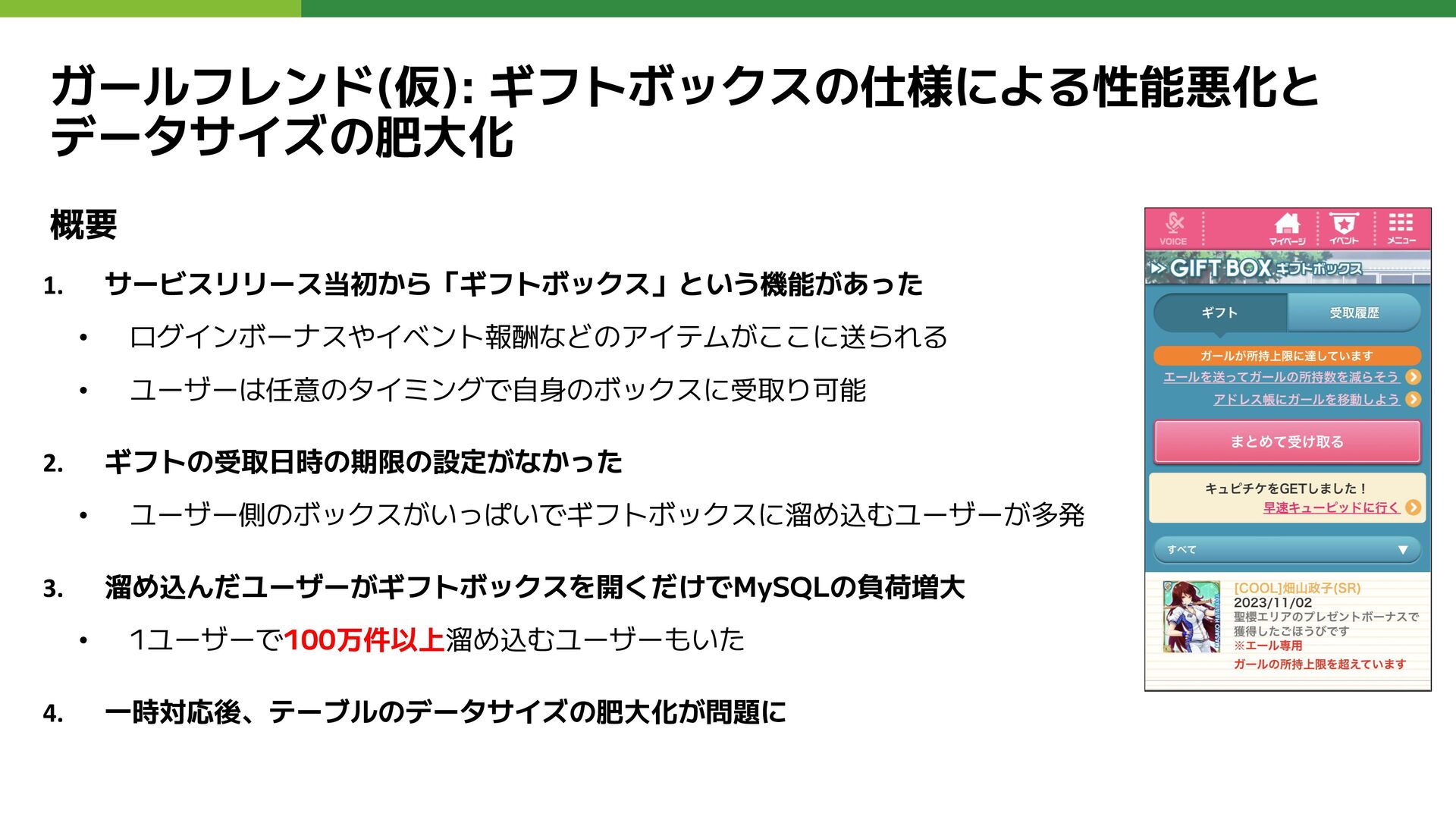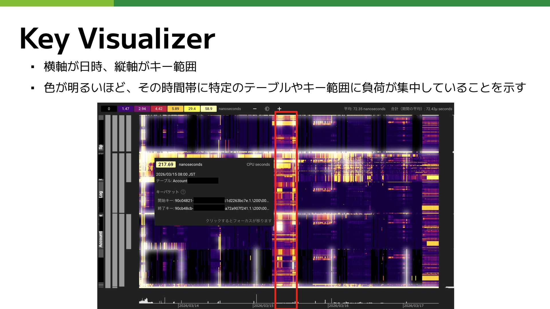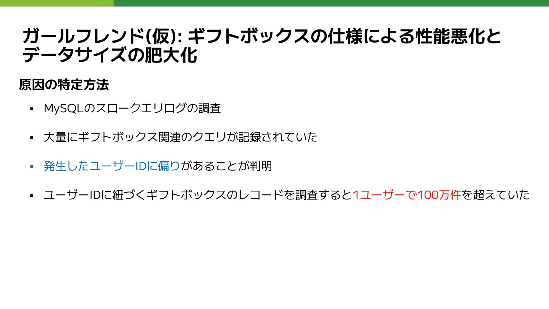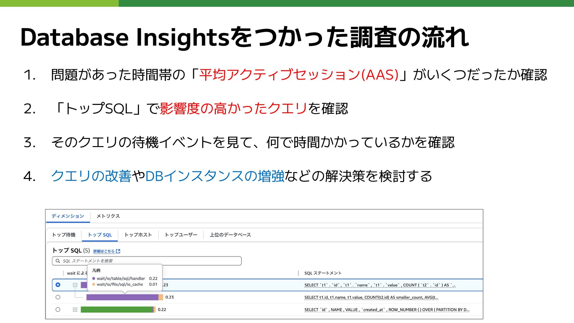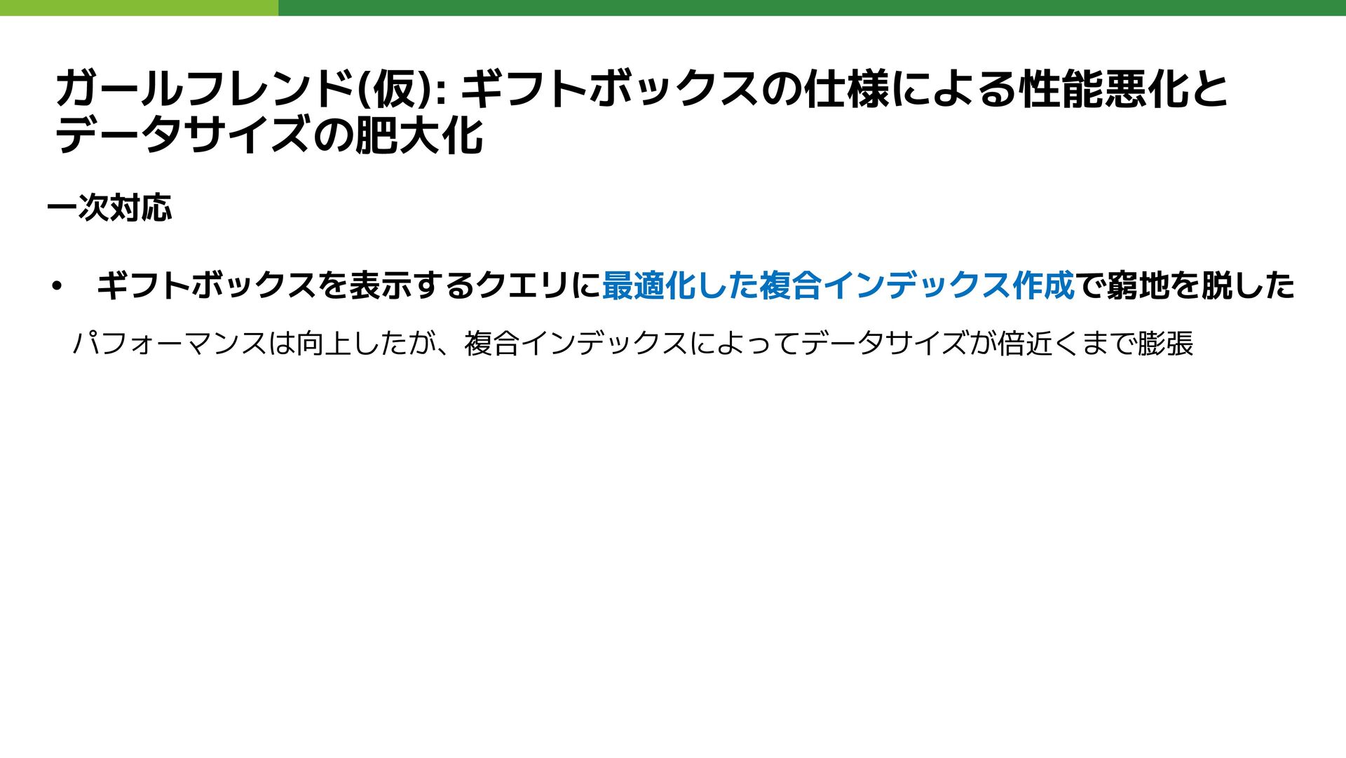 const PRIMARYまたはUNIQUEインデックスを使い一致するレコード数が最大1行の場合(等価検索) eq_ref PRIMARYまたはUNIQUEインデックスを使いJOINしている場合 ref PRIMARYまたはUNIQUEインデックス ではない 等価検索やJOIN fulltext 全文検索インデックスを使っている場合 ref_or_null PRIMARYまたはUNIQUEインデックス ではない 等価検索にOR条件でNULL値の検索した場合 index_merge 複数のインデックスをマージしている場合 unique_subquery サブクエリ内でPRIMARYまたはUNIQUEインデックスを使い等価検索をしている場合 index_subquery サブクエリ内でPRIMARYまたはUNIQUEインデックス ではない 等価検索をしている場合 range インデックスを使用した範囲検索( WHERE <>, >, >=, <, <=や BETWEENやIN )の場合 index インデックスフルスキャン もしくはカバリングインデックスの場合 ALL インデックス不使用のフルテーブルスキャン https://dev.mysql.com/doc/refman/8.0/ja/explain-output.html#explain-join-types 遅い可能性 高速