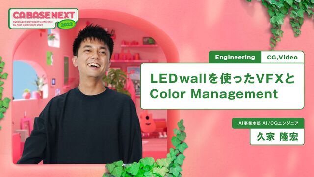CyberHuman Productions(以下,CHP)では横幅5m,高さ3mにも及ぶ巨大なLEDスクリーンであるLEDwallを保有しております。昨今の情勢を受けて海外や遠征地での撮影が困難になる中,LEDwallにロケ地の風景や背景を投影することにより疑似的にスタジオ内で撮影を行う撮影方法(=In-Camera VFX)が普及しました。映画などの映像業界では一般的な手法であるIn-Camera VFXですが,本技術を広告撮影にも活用することによってより一層撮影のコスト低減および効率化を図ることが可能です。本セッションでは,CHPでのLEDwall活用事例やIn-Camera VFXの技術概要を紹介させて頂きます。また,撮影時にはLEDwall・カメラ・出力モニタなどの様々な機材を媒介する必要があり,それらのプロセスの中で生じる「色の食い違い」を解消する取り組み(=Color Management,色管理)に関しても触れさせて頂きます。