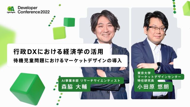 AI Lab経済学社会実装チームは経済学やデータサイエンスの知見を用いてビジネスや社会課題を解決することをミッションとしています。マーケットデザインにおける、資源の効率的な配分や公平性の担保といった目的に応じた市場のルールやアルゴリズムに関する知見を用いて待機児童問題の解決に取り組んだ経緯やそれによって得た知見についてお話しします。また、後半では、待機児童問題に限らないマーケットデザインの応用分野について東京大学マーケットデザインセンターの小田原氏に解説してもらいます。