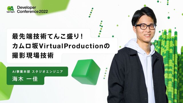 VirtualProducitionとは最近日本でも流行りつつあるCGなどを使った最先端の撮影技術です。サイバーエージェントでは、VirtualProductionのために高精細大型LED、リアルタイム合成システム、トラッキングシステムなどを他所と比べてもいち早く導入し、カムロ坂スタジオにて開発・運用し、そして成長させ続けてきました。