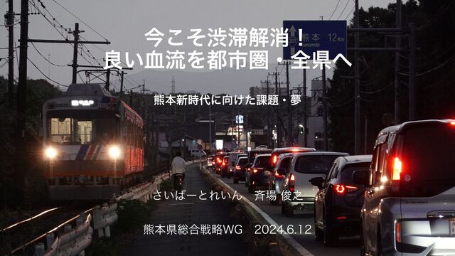 県民としてみなさんに望み、一緒に議論したいこと ①熊本の交通問題は「解決可能」であり、「今」すべきことであること 行政施策全体の中での優先順位を上げ、交通という「血流」を良くすることが交通だけでなく環境や安全など 他の県民課題の解決やさらなる地域価値の向上、創造につながる近道であることを県民・事業者・行政が共有 できる状況を作りましょう。 ②「あるべき姿」をぶらさず考えること 担い手問題など障壁がありますが、現実に萎縮して目標や計画を小さく作ることを避けましょう。 (=永遠に課題解決しない) 課題解決のためには「何を」「どう」「どれだけ」すればよいのかを考えていきましょう。 ③「お金の問題」から逃げないこと