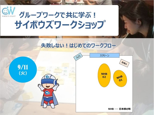 1 グループワークで共に学ぶ! サイボウズワークショップ 失敗しない!はじめてのワークフロー 9/11 (火) スクリーン NHB 02 NHB