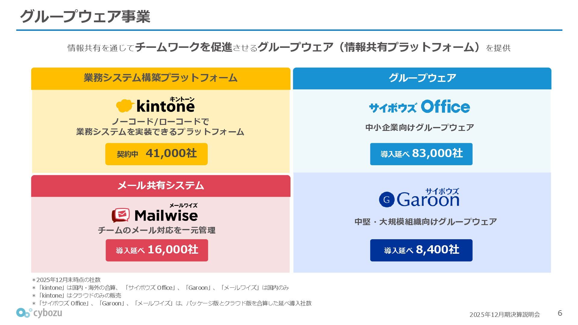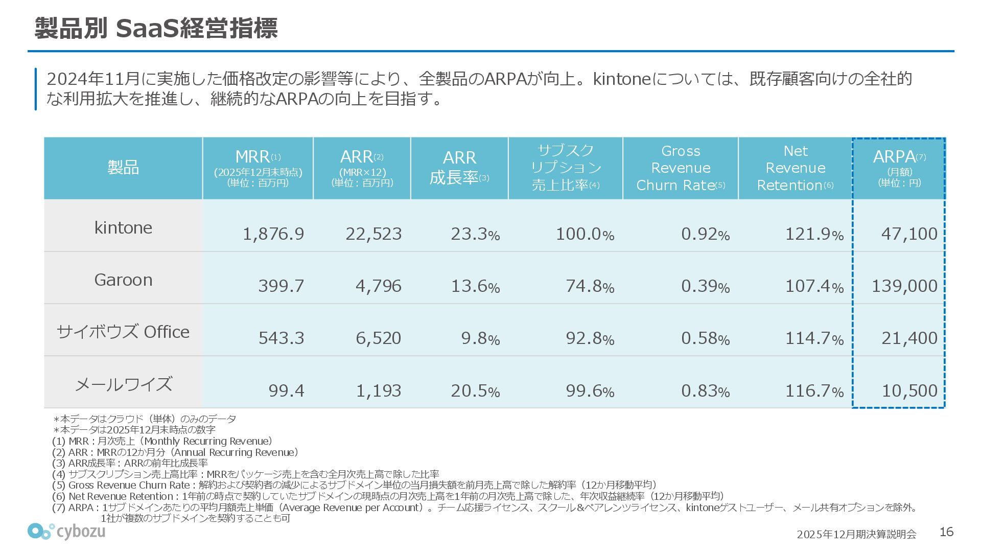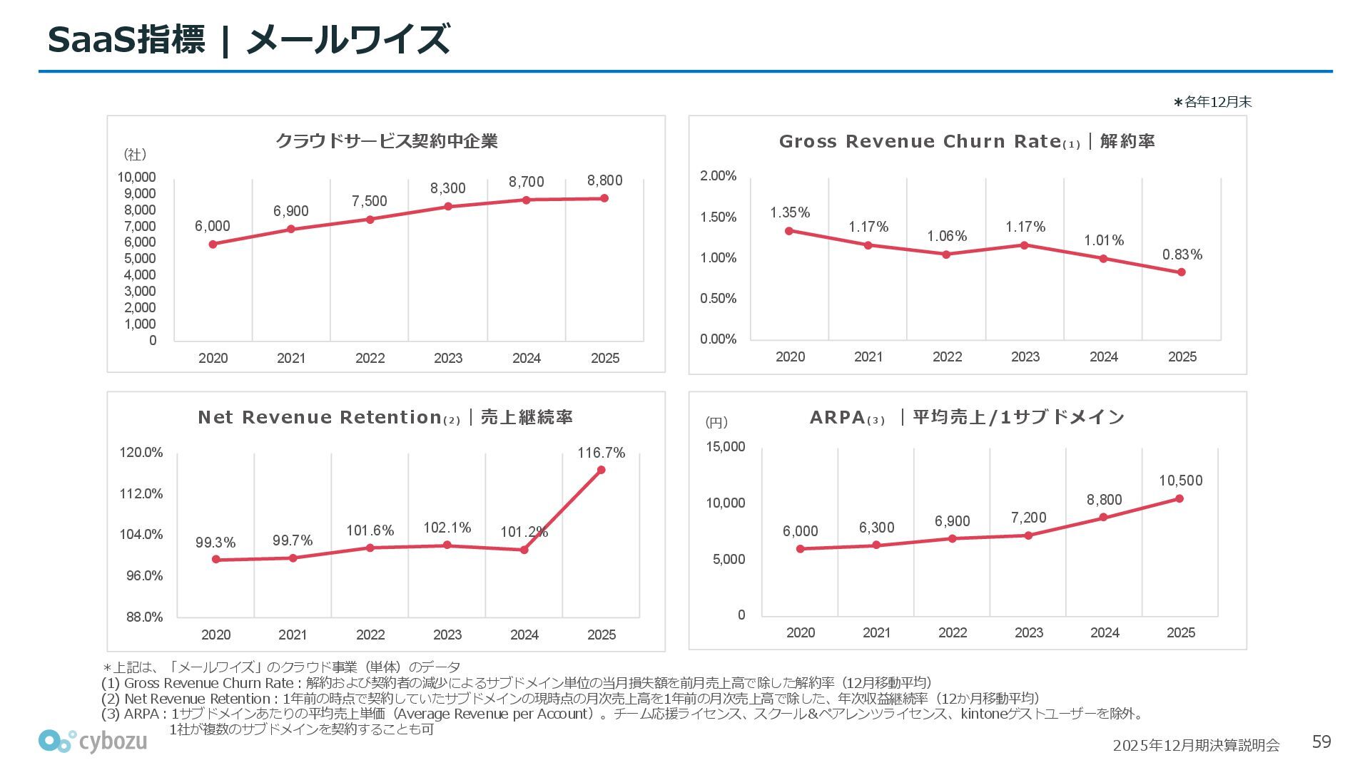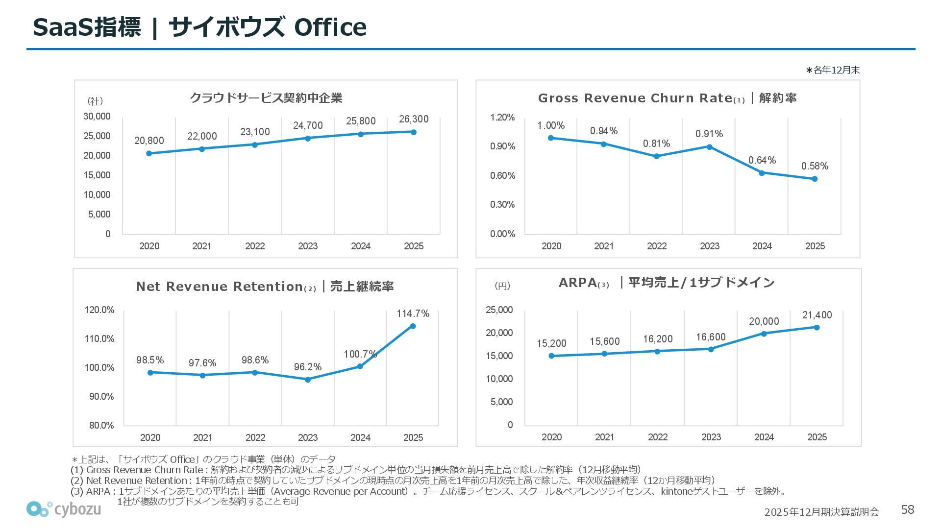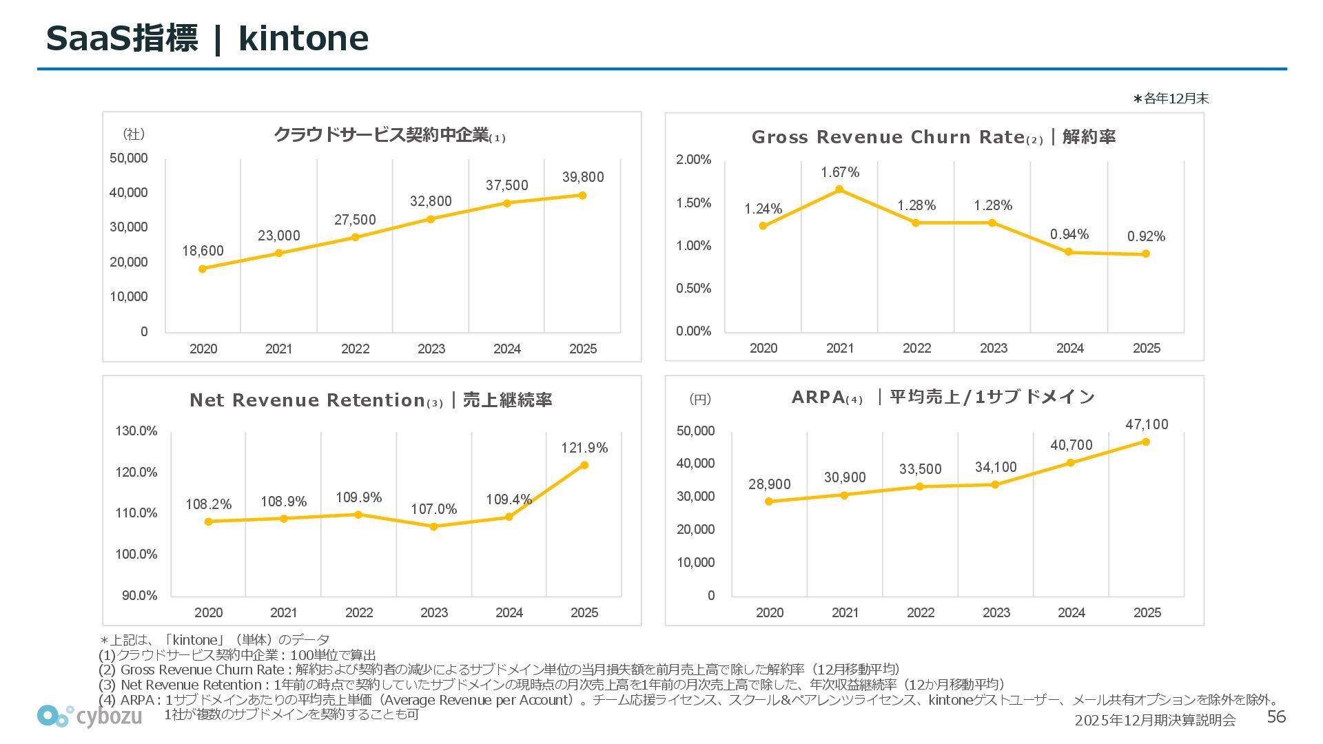 Rate:解約および契約者の減少によるサブドメイン単位の当月損失額を前月売上高で除した解約率(12月移動平均) (2) Net Revenue Retention:1年前の時点で契約していたサブドメインの現時点の月次売上高を1年前の月次売上高で除した、年次収益継続率(12か月移動平均) (3) ARPA:1サブドメインあたりの平均売上単価(Average Revenue per Account)。チーム応援ライセンス、スクール&ペアレンツライセンス、kintoneゲストユーザーを除外。 1社が複数のサブドメインを契約することも可 *各年12月末 (社) (円) 6,000 6,900 7,500 8,300 8,700 8,800 0 1,000 2,000 3,000 4,000 5,000 6,000 7,000 8,000 9,000 10,000 2020 2021 2022 2023 2024 2025 クラウドサービス契約中企業 6,000 6,300 6,900 7,200 8,800 10,500 0 5,000 10,000 15,000 2020 2021 2022 2023 2024 2025 ARPA( 3 ) |平均売上/1サブドメイン 1.35% 1.17% 1.06% 1.17% 1.01% 0.83% 0.00% 0.50% 1.00% 1.50% 2.00% 2020 2021 2022 2023 2024 2025 Gross Revenue Churn Rate( 1 ) |解約率 99.3% 99.7% 101.6% 102.1% 101.2% 116.7% 88.0% 96.0% 104.0% 112.0% 120.0% 2020 2021 2022 2023 2024 2025 Net Revenue Retention( 2 ) |売上継続率