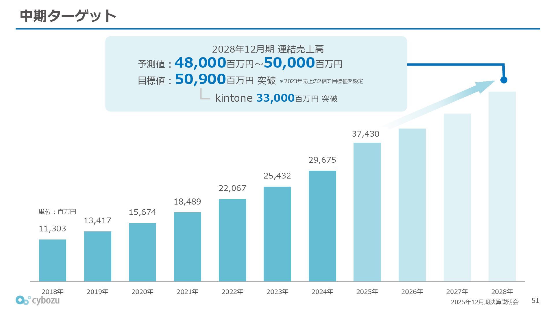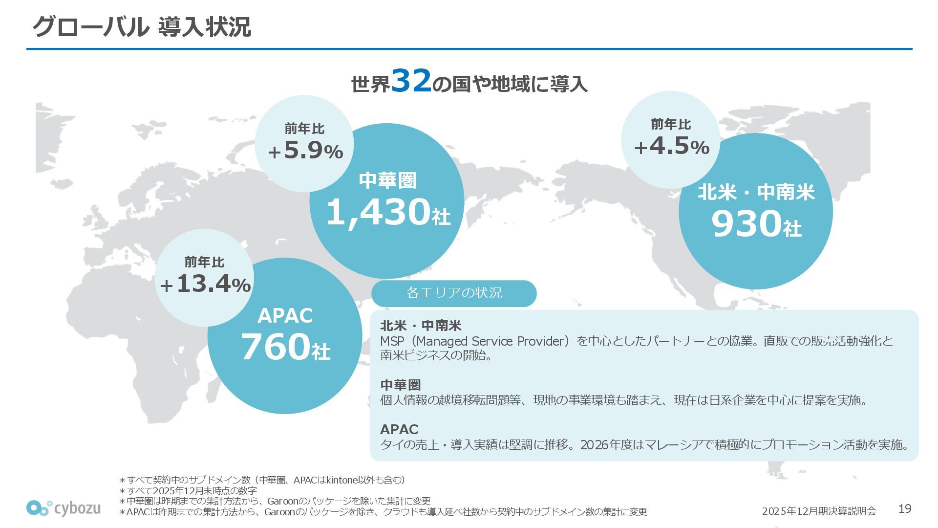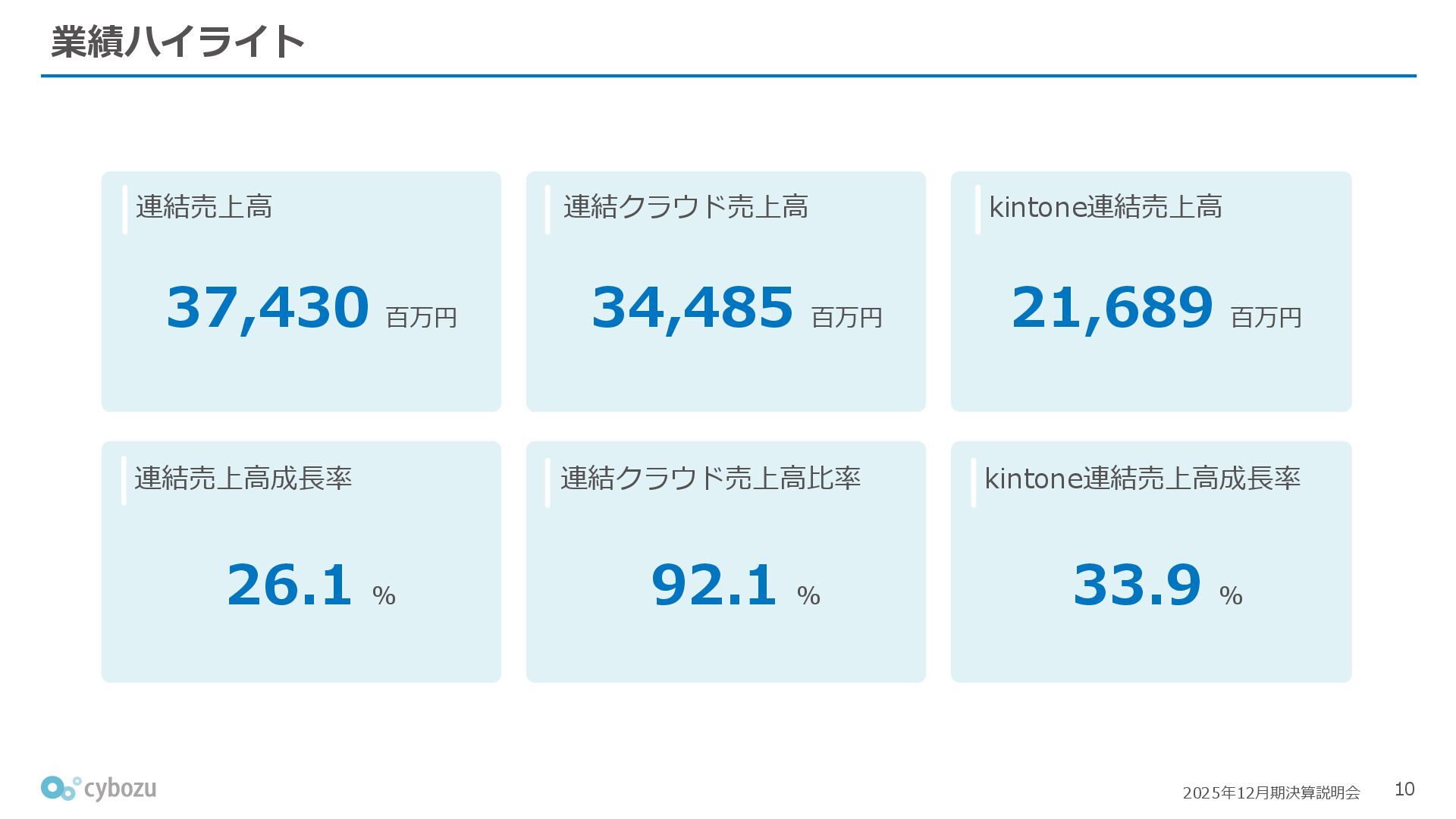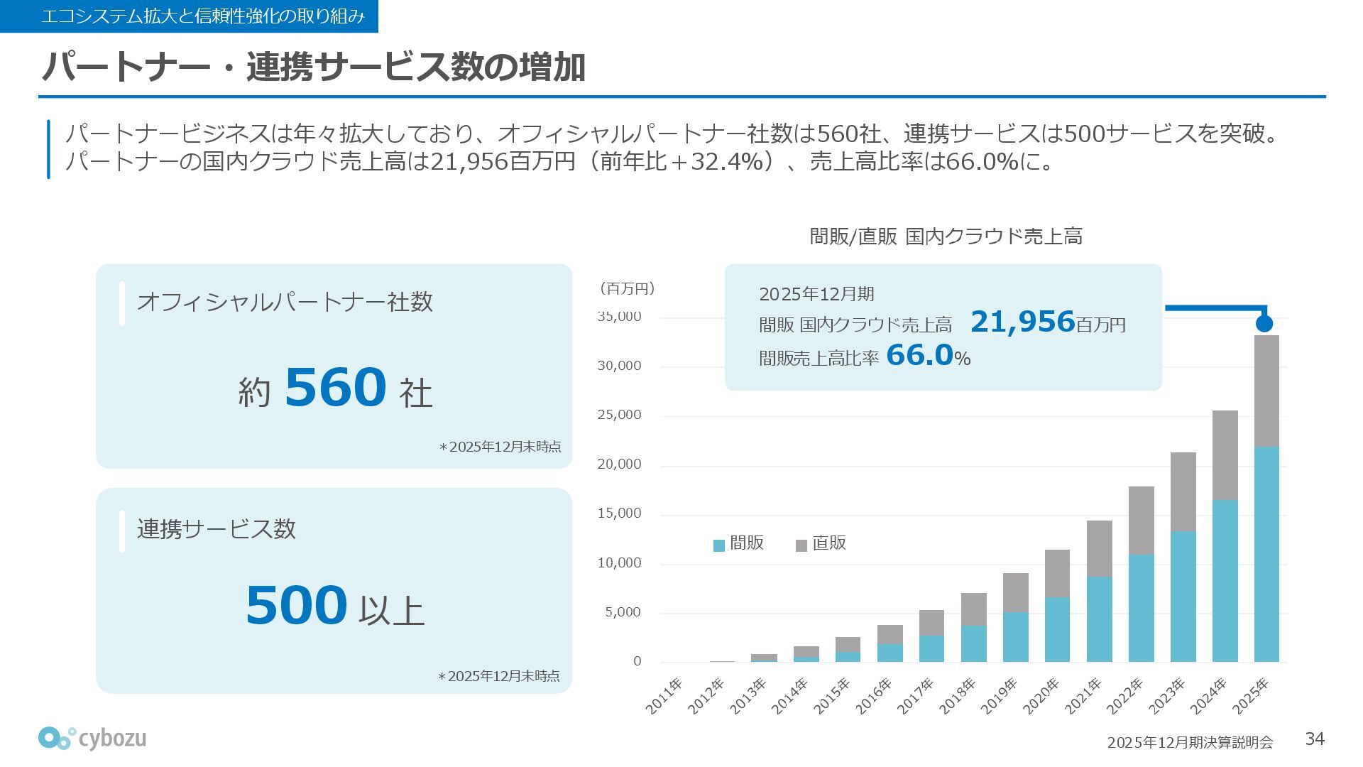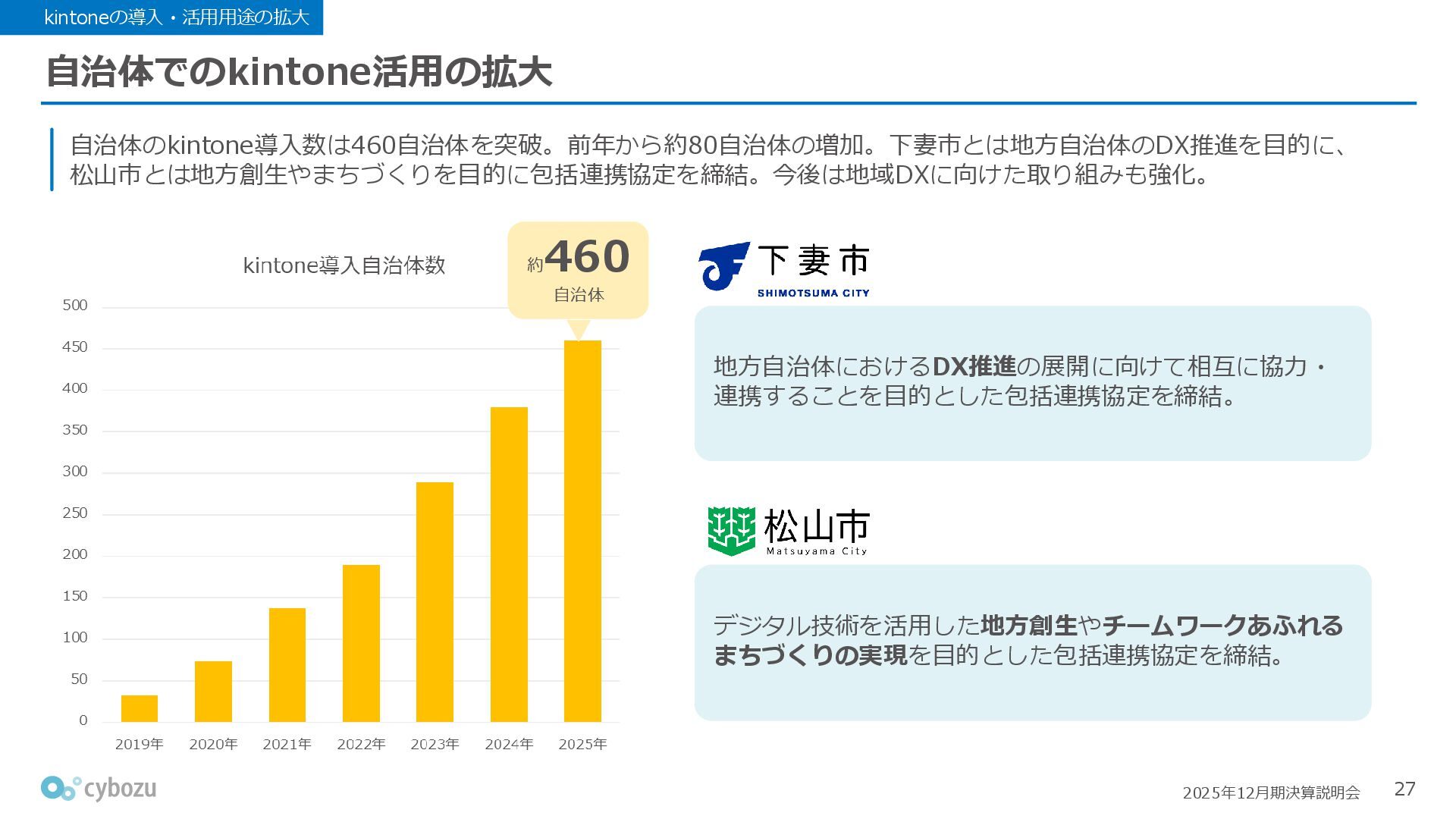 Rate:解約および契約者の減少によるサブドメイン単位の当月損失額を前月売上高で除した解約率(12月移動平均) (2) Net Revenue Retention:1年前の時点で契約していたサブドメインの現時点の月次売上高を1年前の月次売上高で除した、年次収益継続率(12か月移動平均) (3) ARPA:1サブドメインあたりの平均売上単価(Average Revenue per Account)。チーム応援ライセンス、スクール&ペアレンツライセンス、kintoneゲストユーザーを除外。 1社が複数のサブドメインを契約することも可 *各年12月末 (社) (円) 6,000 6,900 7,500 8,300 8,700 8,800 0 1,000 2,000 3,000 4,000 5,000 6,000 7,000 8,000 9,000 10,000 2020 2021 2022 2023 2024 2025 クラウドサービス契約中企業 6,000 6,300 6,900 7,200 8,800 10,500 0 5,000 10,000 15,000 2020 2021 2022 2023 2024 2025 ARPA( 3 ) |平均売上/1サブドメイン 1.35% 1.17% 1.06% 1.17% 1.01% 0.83% 0.00% 0.50% 1.00% 1.50% 2.00% 2020 2021 2022 2023 2024 2025 Gross Revenue Churn Rate( 1 ) |解約率 99.3% 99.7% 101.6% 102.1% 101.2% 116.7% 88.0% 96.0% 104.0% 112.0% 120.0% 2020 2021 2022 2023 2024 2025 Net Revenue Retention( 2 ) |売上継続率