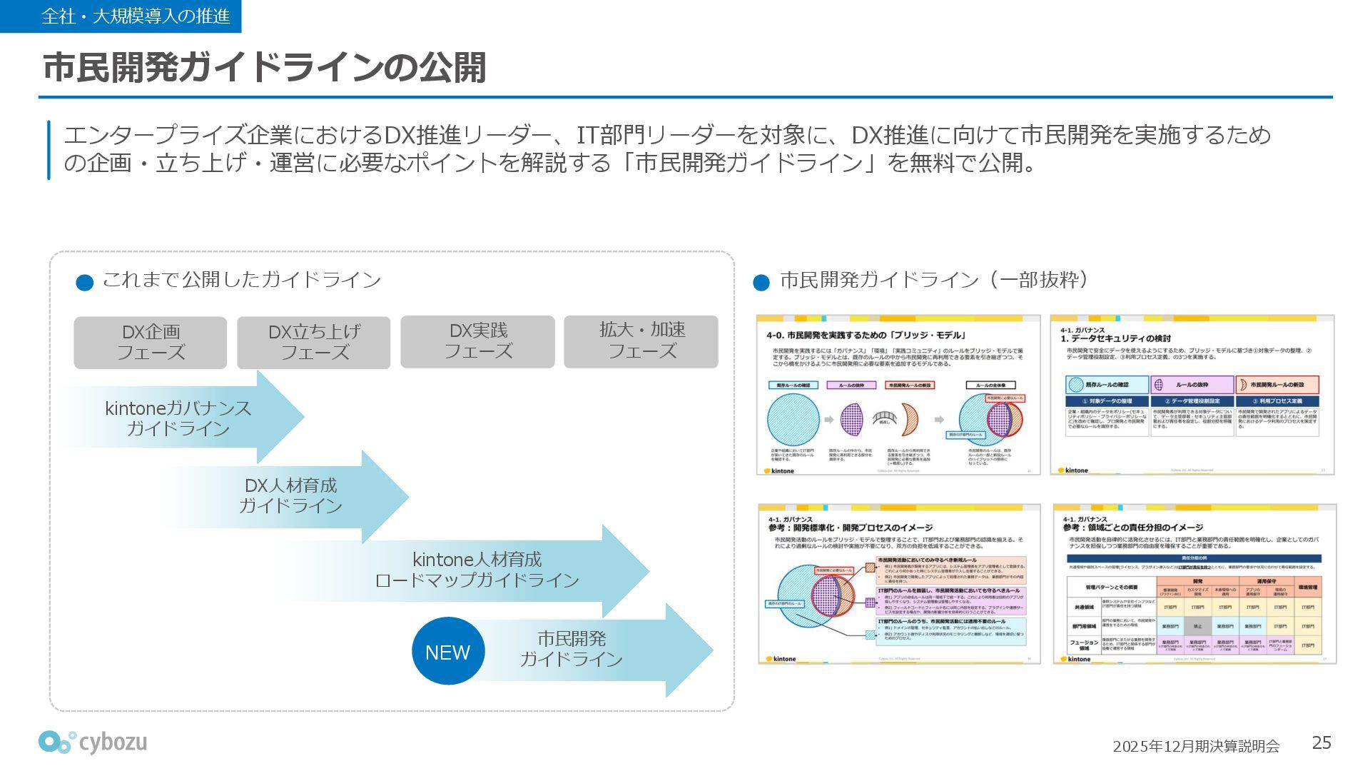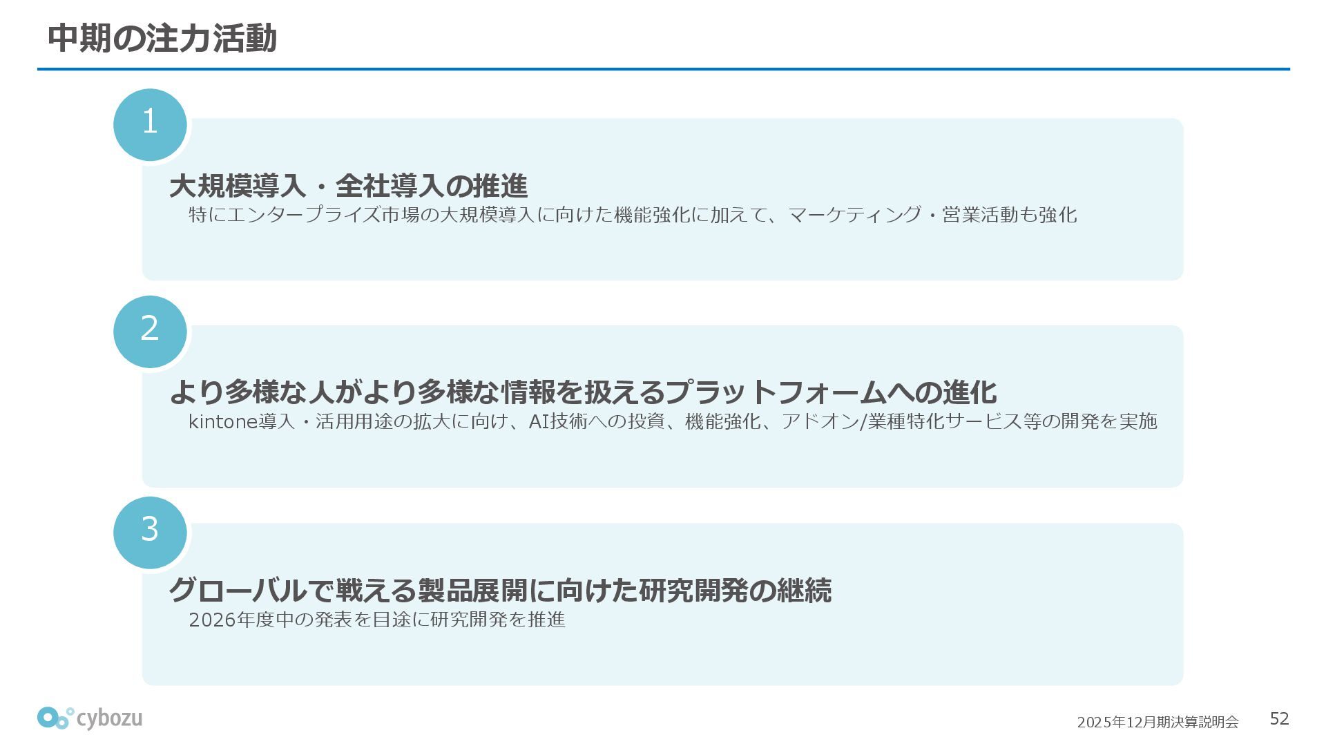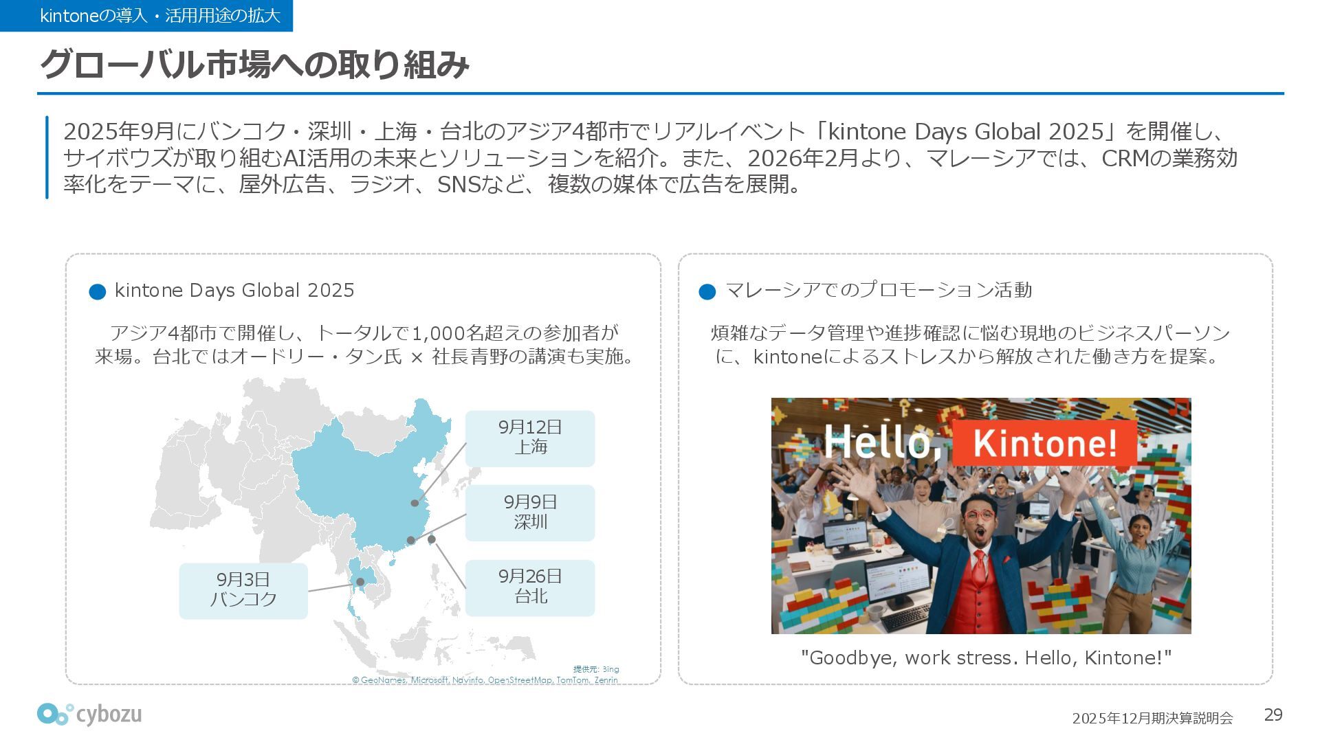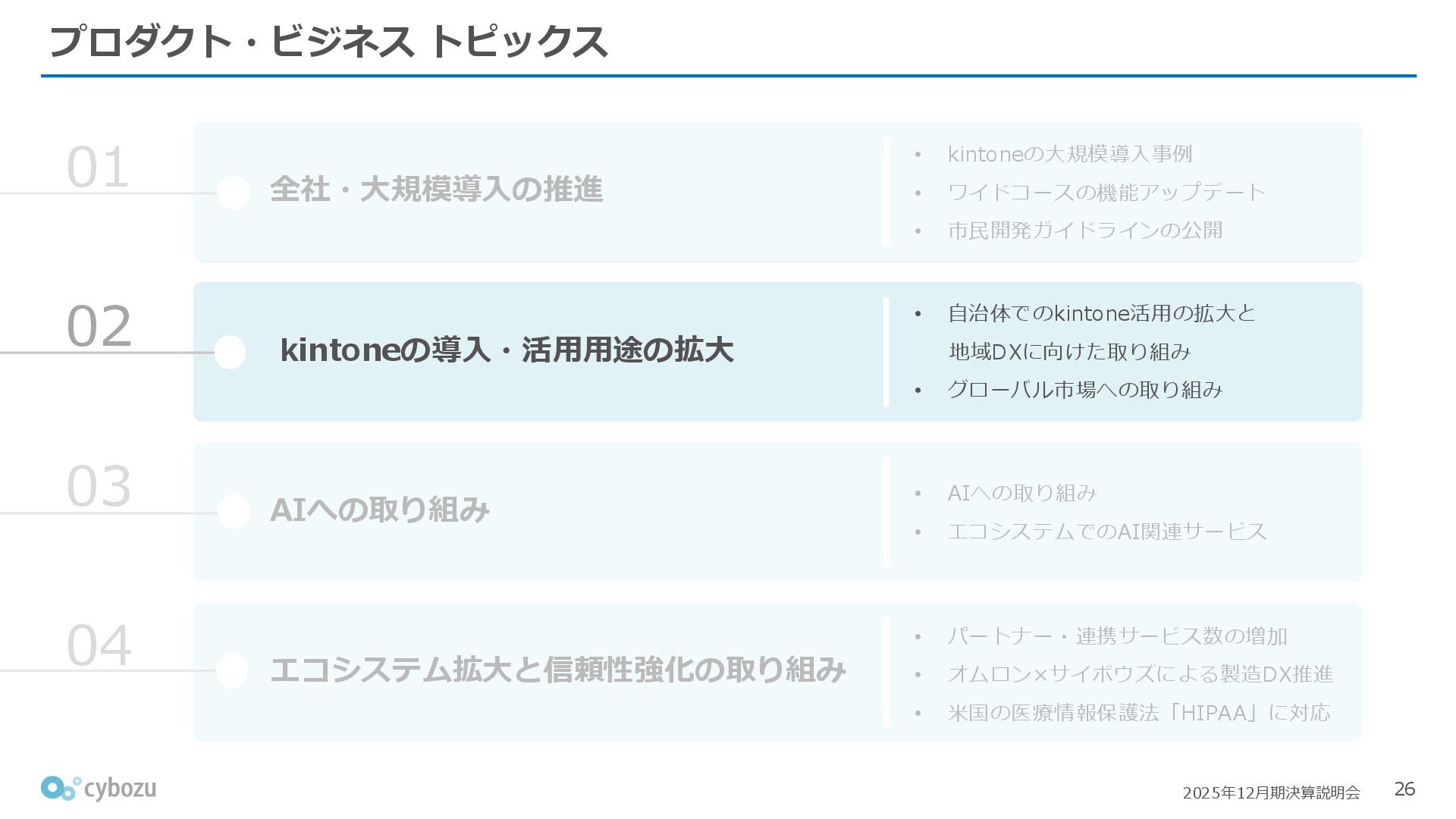 Rate:解約および契約者の減少によるサブドメイン単位の当月損失額を前月売上高で除した解約率(12月移動平均) (2) Net Revenue Retention:1年前の時点で契約していたサブドメインの現時点の月次売上高を1年前の月次売上高で除した、年次収益継続率(12か月移動平均) (3) ARPA:1サブドメインあたりの平均売上単価(Average Revenue per Account)。チーム応援ライセンス、スクール&ペアレンツライセンス、kintoneゲストユーザーを除外。 1社が複数のサブドメインを契約することも可 *各年12月末 (社) (円) 6,000 6,900 7,500 8,300 8,700 8,800 0 1,000 2,000 3,000 4,000 5,000 6,000 7,000 8,000 9,000 10,000 2020 2021 2022 2023 2024 2025 クラウドサービス契約中企業 6,000 6,300 6,900 7,200 8,800 10,500 0 5,000 10,000 15,000 2020 2021 2022 2023 2024 2025 ARPA( 3 ) |平均売上/1サブドメイン 1.35% 1.17% 1.06% 1.17% 1.01% 0.83% 0.00% 0.50% 1.00% 1.50% 2.00% 2020 2021 2022 2023 2024 2025 Gross Revenue Churn Rate( 1 ) |解約率 99.3% 99.7% 101.6% 102.1% 101.2% 116.7% 88.0% 96.0% 104.0% 112.0% 120.0% 2020 2021 2022 2023 2024 2025 Net Revenue Retention( 2 ) |売上継続率
