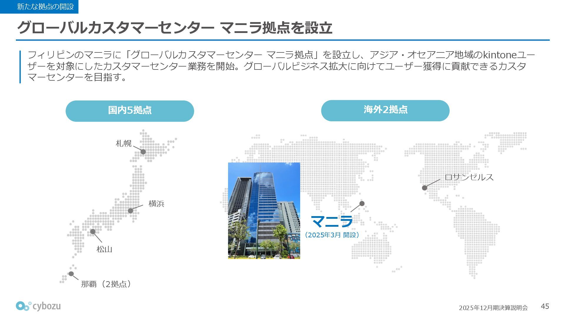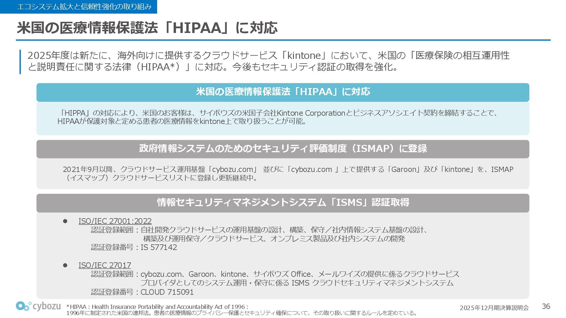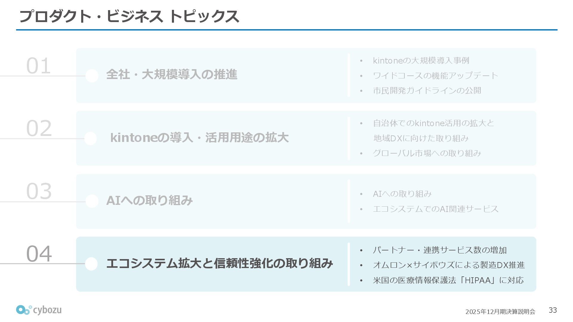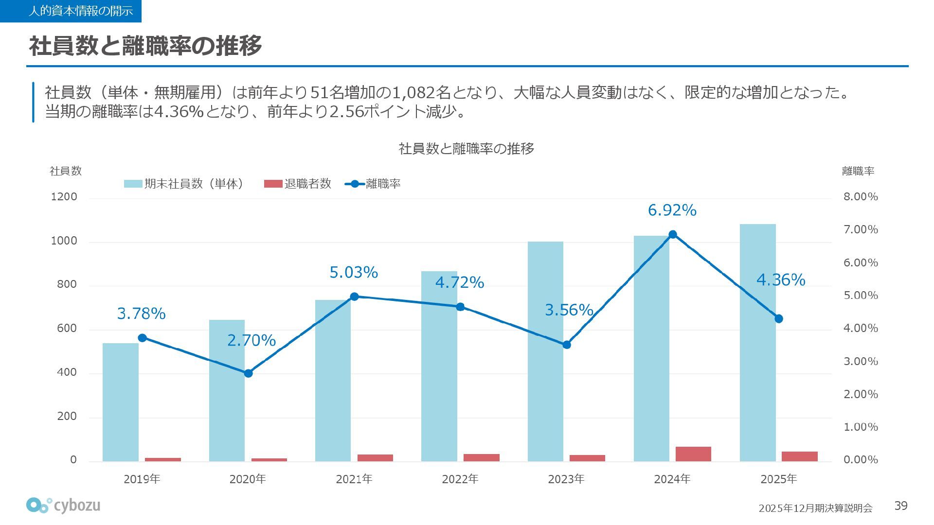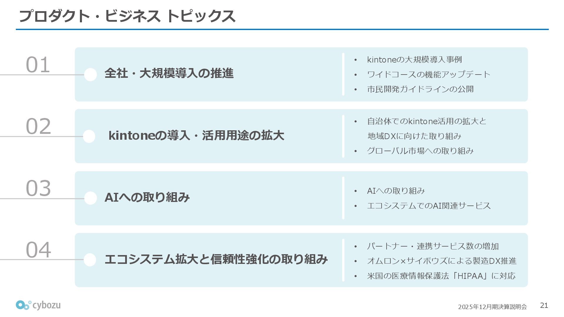 Rate:解約および契約者の減少によるサブドメイン単位の当月損失額を前月売上高で除した解約率(12月移動平均) (2) Net Revenue Retention:1年前の時点で契約していたサブドメインの現時点の月次売上高を1年前の月次売上高で除した、年次収益継続率(12か月移動平均) (3) ARPA:1サブドメインあたりの平均売上単価(Average Revenue per Account)。チーム応援ライセンス、スクール&ペアレンツライセンス、kintoneゲストユーザーを除外。 1社が複数のサブドメインを契約することも可 *各年12月末 (社) (円) 6,000 6,900 7,500 8,300 8,700 8,800 0 1,000 2,000 3,000 4,000 5,000 6,000 7,000 8,000 9,000 10,000 2020 2021 2022 2023 2024 2025 クラウドサービス契約中企業 6,000 6,300 6,900 7,200 8,800 10,500 0 5,000 10,000 15,000 2020 2021 2022 2023 2024 2025 ARPA( 3 ) |平均売上/1サブドメイン 1.35% 1.17% 1.06% 1.17% 1.01% 0.83% 0.00% 0.50% 1.00% 1.50% 2.00% 2020 2021 2022 2023 2024 2025 Gross Revenue Churn Rate( 1 ) |解約率 99.3% 99.7% 101.6% 102.1% 101.2% 116.7% 88.0% 96.0% 104.0% 112.0% 120.0% 2020 2021 2022 2023 2024 2025 Net Revenue Retention( 2 ) |売上継続率
