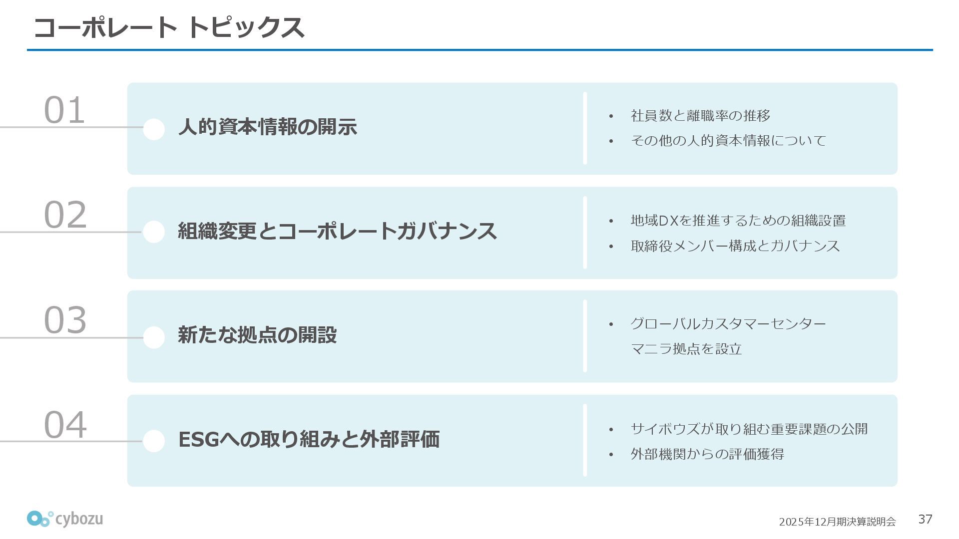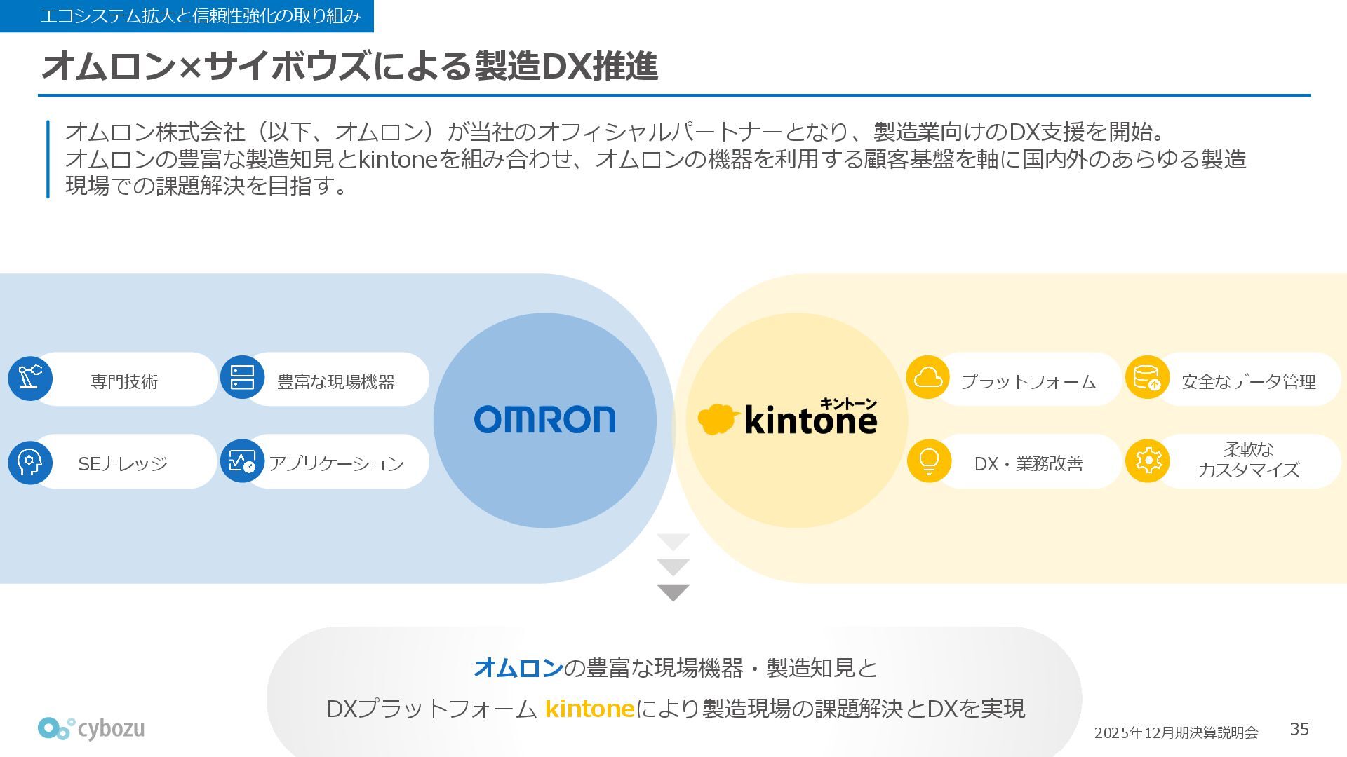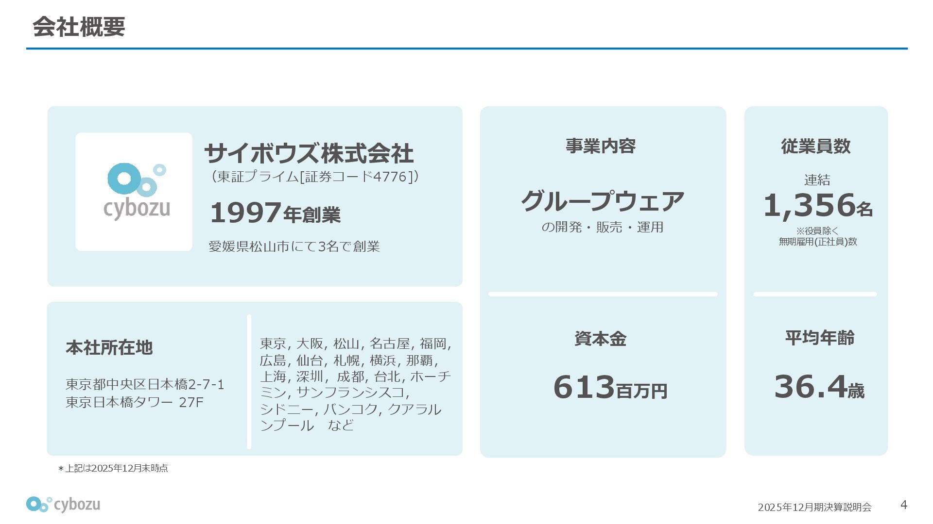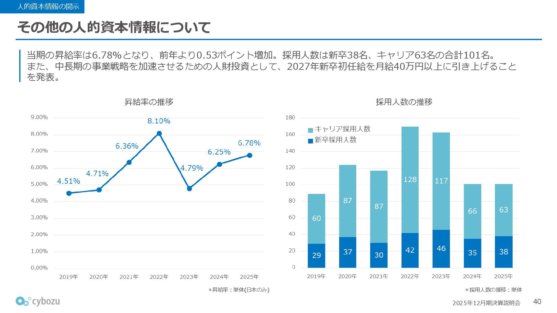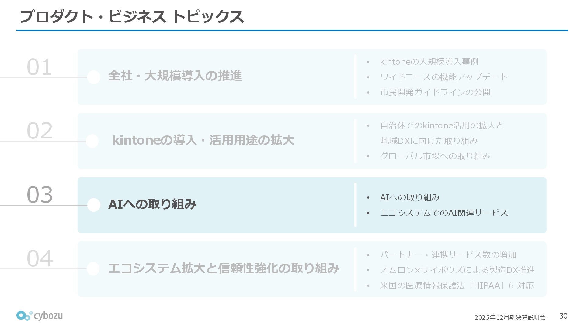 Rate:解約および契約者の減少によるサブドメイン単位の当月損失額を前月売上高で除した解約率(12月移動平均) (2) Net Revenue Retention:1年前の時点で契約していたサブドメインの現時点の月次売上高を1年前の月次売上高で除した、年次収益継続率(12か月移動平均) (3) ARPA:1サブドメインあたりの平均売上単価(Average Revenue per Account)。チーム応援ライセンス、スクール&ペアレンツライセンス、kintoneゲストユーザーを除外。 1社が複数のサブドメインを契約することも可 *各年12月末 (社) (円) 6,000 6,900 7,500 8,300 8,700 8,800 0 1,000 2,000 3,000 4,000 5,000 6,000 7,000 8,000 9,000 10,000 2020 2021 2022 2023 2024 2025 クラウドサービス契約中企業 6,000 6,300 6,900 7,200 8,800 10,500 0 5,000 10,000 15,000 2020 2021 2022 2023 2024 2025 ARPA( 3 ) |平均売上/1サブドメイン 1.35% 1.17% 1.06% 1.17% 1.01% 0.83% 0.00% 0.50% 1.00% 1.50% 2.00% 2020 2021 2022 2023 2024 2025 Gross Revenue Churn Rate( 1 ) |解約率 99.3% 99.7% 101.6% 102.1% 101.2% 116.7% 88.0% 96.0% 104.0% 112.0% 120.0% 2020 2021 2022 2023 2024 2025 Net Revenue Retention( 2 ) |売上継続率