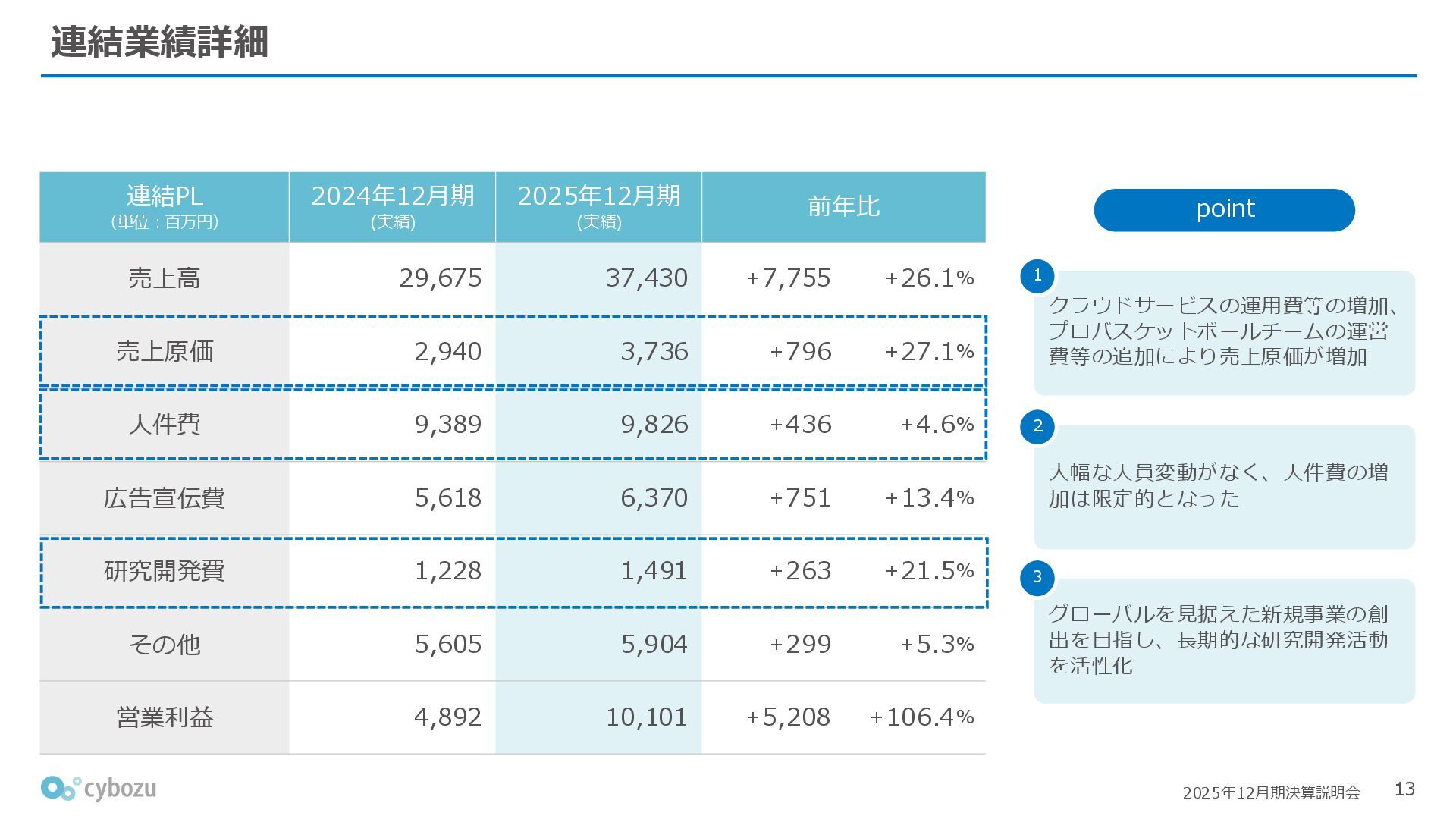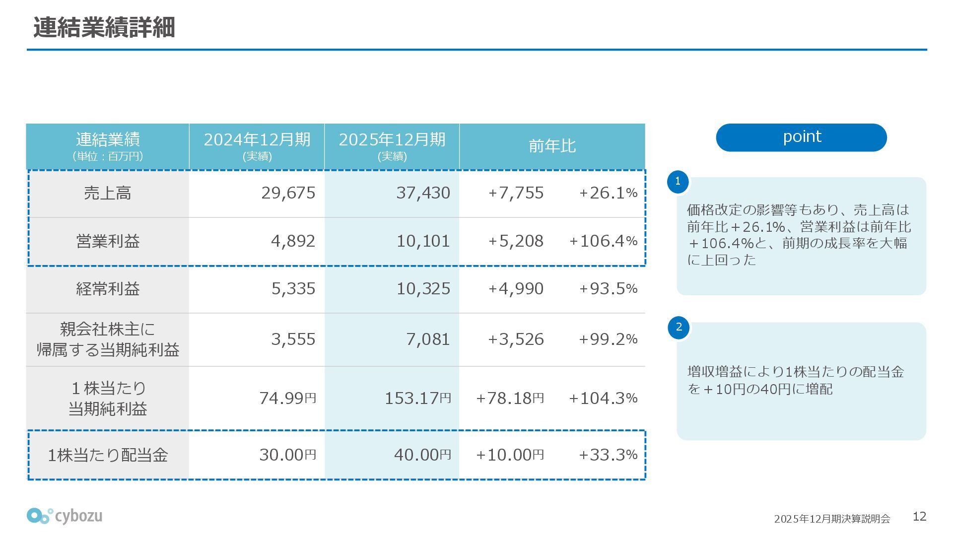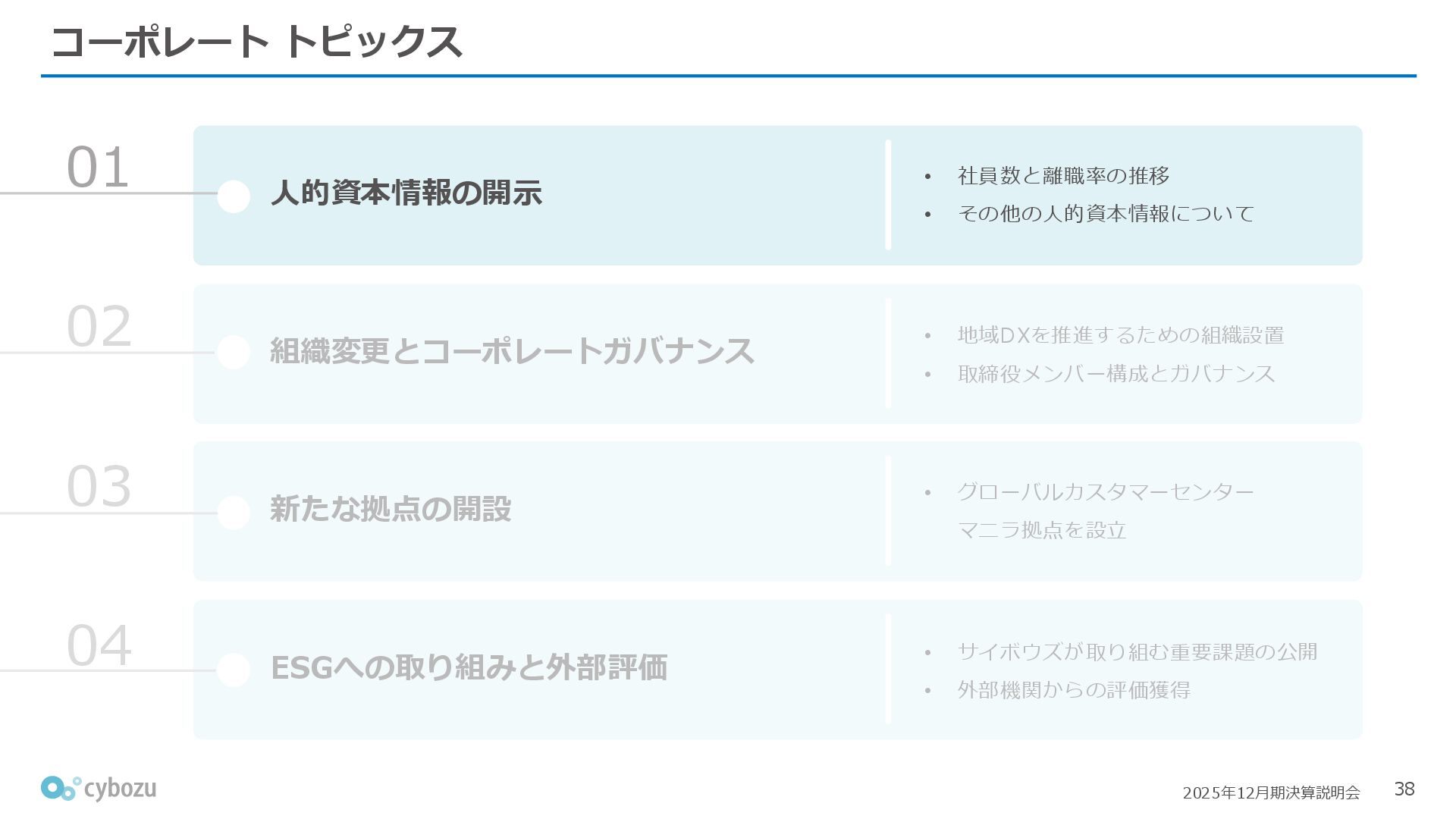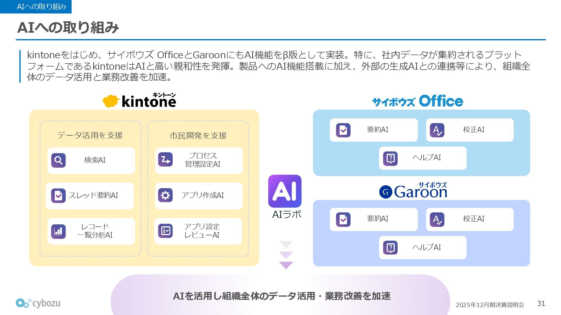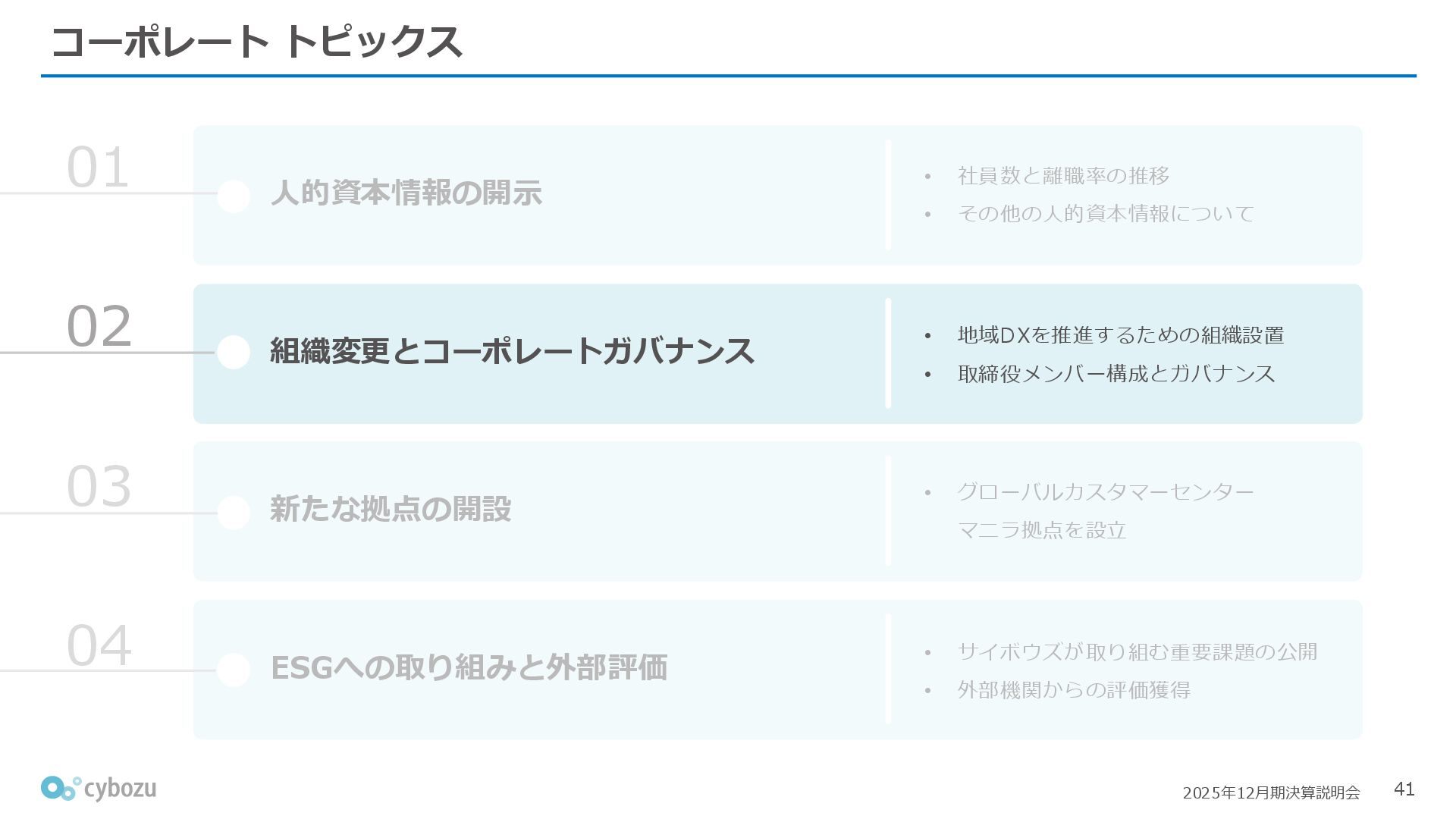 Rate:解約および契約者の減少によるサブドメイン単位の当月損失額を前月売上高で除した解約率(12月移動平均) (2) Net Revenue Retention:1年前の時点で契約していたサブドメインの現時点の月次売上高を1年前の月次売上高で除した、年次収益継続率(12か月移動平均) (3) ARPA:1サブドメインあたりの平均売上単価(Average Revenue per Account)。チーム応援ライセンス、スクール&ペアレンツライセンス、kintoneゲストユーザーを除外。 1社が複数のサブドメインを契約することも可 *各年12月末 (社) (円) 6,000 6,900 7,500 8,300 8,700 8,800 0 1,000 2,000 3,000 4,000 5,000 6,000 7,000 8,000 9,000 10,000 2020 2021 2022 2023 2024 2025 クラウドサービス契約中企業 6,000 6,300 6,900 7,200 8,800 10,500 0 5,000 10,000 15,000 2020 2021 2022 2023 2024 2025 ARPA( 3 ) |平均売上/1サブドメイン 1.35% 1.17% 1.06% 1.17% 1.01% 0.83% 0.00% 0.50% 1.00% 1.50% 2.00% 2020 2021 2022 2023 2024 2025 Gross Revenue Churn Rate( 1 ) |解約率 99.3% 99.7% 101.6% 102.1% 101.2% 116.7% 88.0% 96.0% 104.0% 112.0% 120.0% 2020 2021 2022 2023 2024 2025 Net Revenue Retention( 2 ) |売上継続率