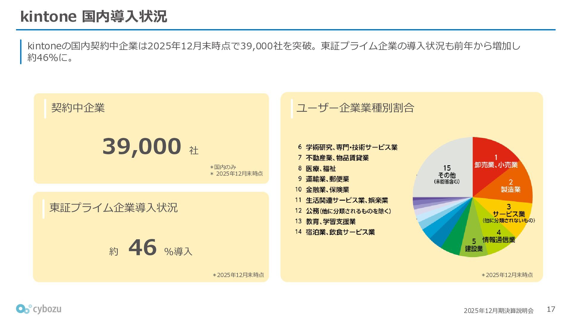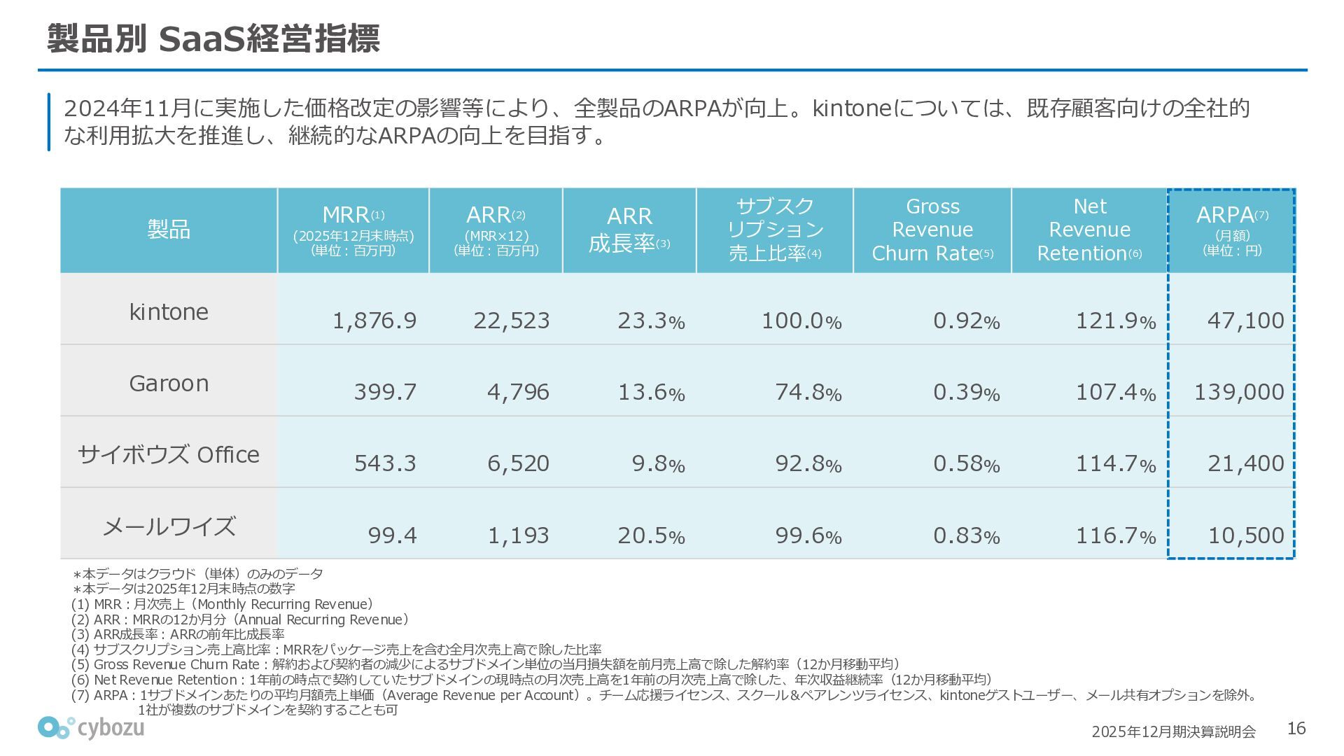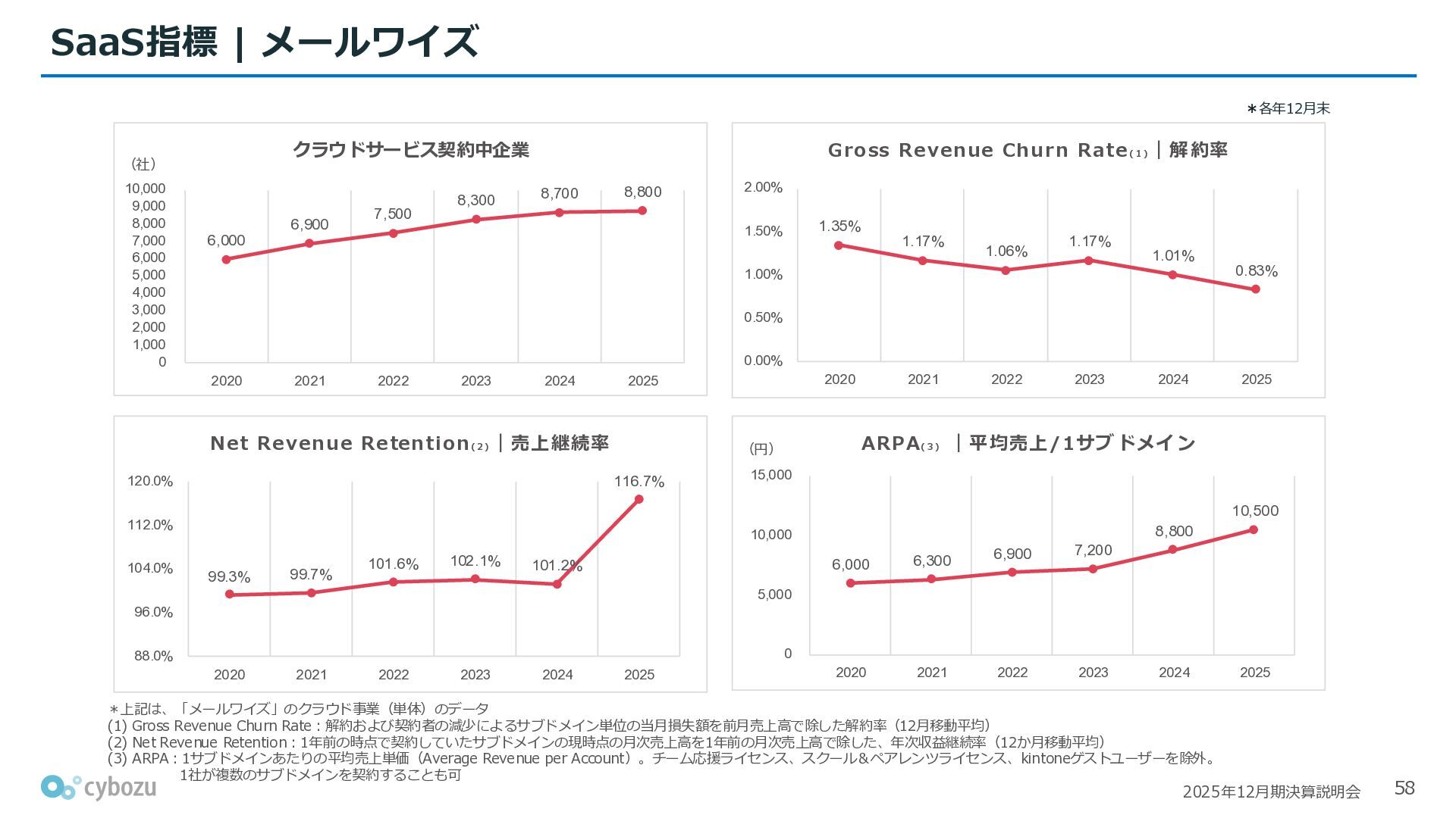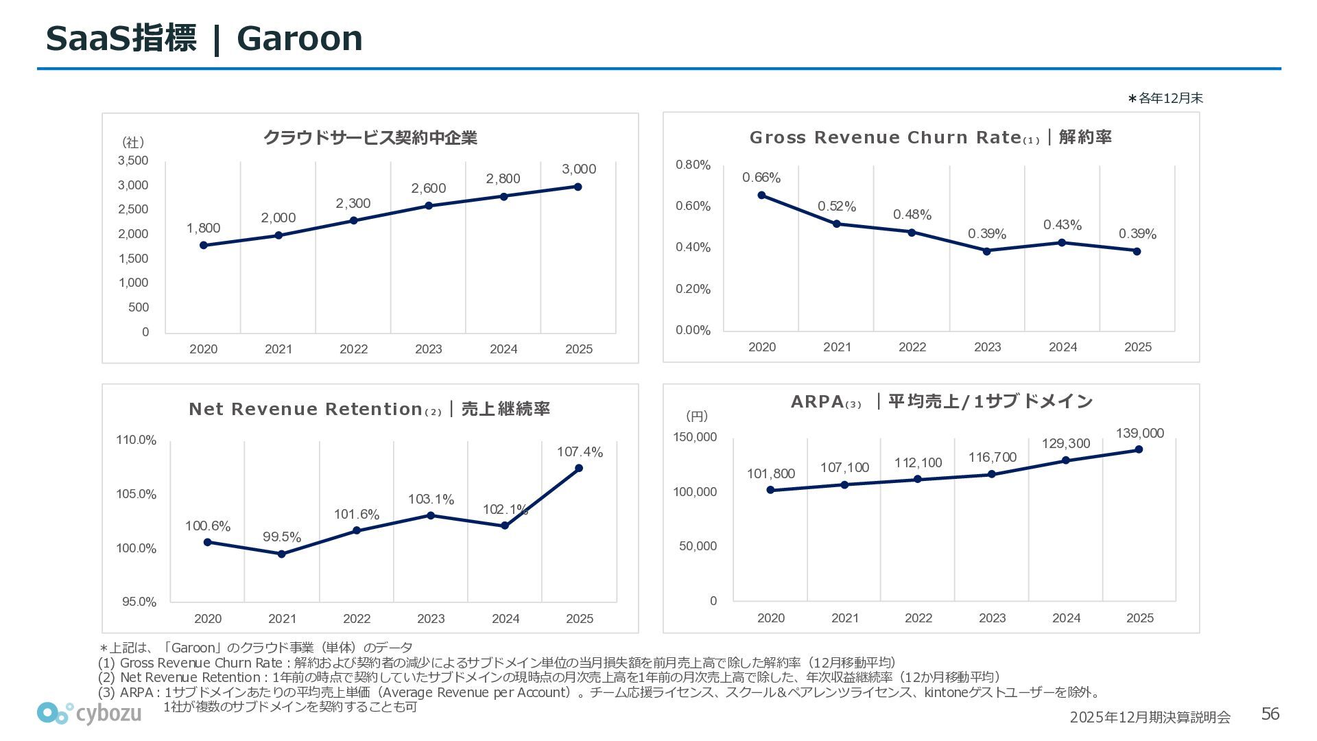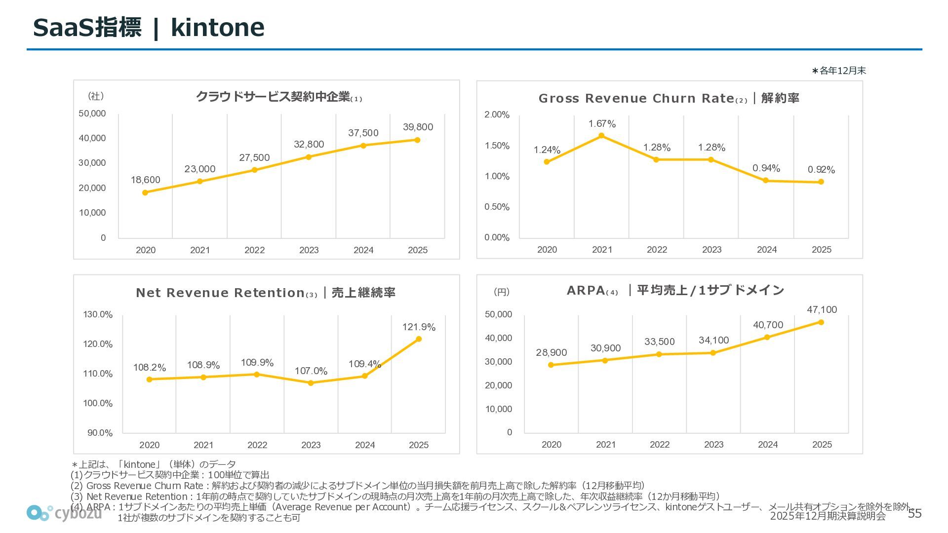 Rate:解約および契約者の減少によるサブドメイン単位の当月損失額を前月売上高で除した解約率(12月移動平均) (2) Net Revenue Retention:1年前の時点で契約していたサブドメインの現時点の月次売上高を1年前の月次売上高で除した、年次収益継続率(12か月移動平均) (3) ARPA:1サブドメインあたりの平均売上単価(Average Revenue per Account)。チーム応援ライセンス、スクール&ペアレンツライセンス、kintoneゲストユーザーを除外。 1社が複数のサブドメインを契約することも可 *各年12月末 (社) (円) 6,000 6,900 7,500 8,300 8,700 8,800 0 1,000 2,000 3,000 4,000 5,000 6,000 7,000 8,000 9,000 10,000 2020 2021 2022 2023 2024 2025 クラウドサービス契約中企業 6,000 6,300 6,900 7,200 8,800 10,500 0 5,000 10,000 15,000 2020 2021 2022 2023 2024 2025 ARPA( 3 ) |平均売上/1サブドメイン 1.35% 1.17% 1.06% 1.17% 1.01% 0.83% 0.00% 0.50% 1.00% 1.50% 2.00% 2020 2021 2022 2023 2024 2025 Gross Revenue Churn Rate( 1 ) |解約率 99.3% 99.7% 101.6% 102.1% 101.2% 116.7% 88.0% 96.0% 104.0% 112.0% 120.0% 2020 2021 2022 2023 2024 2025 Net Revenue Retention( 2 ) |売上継続率