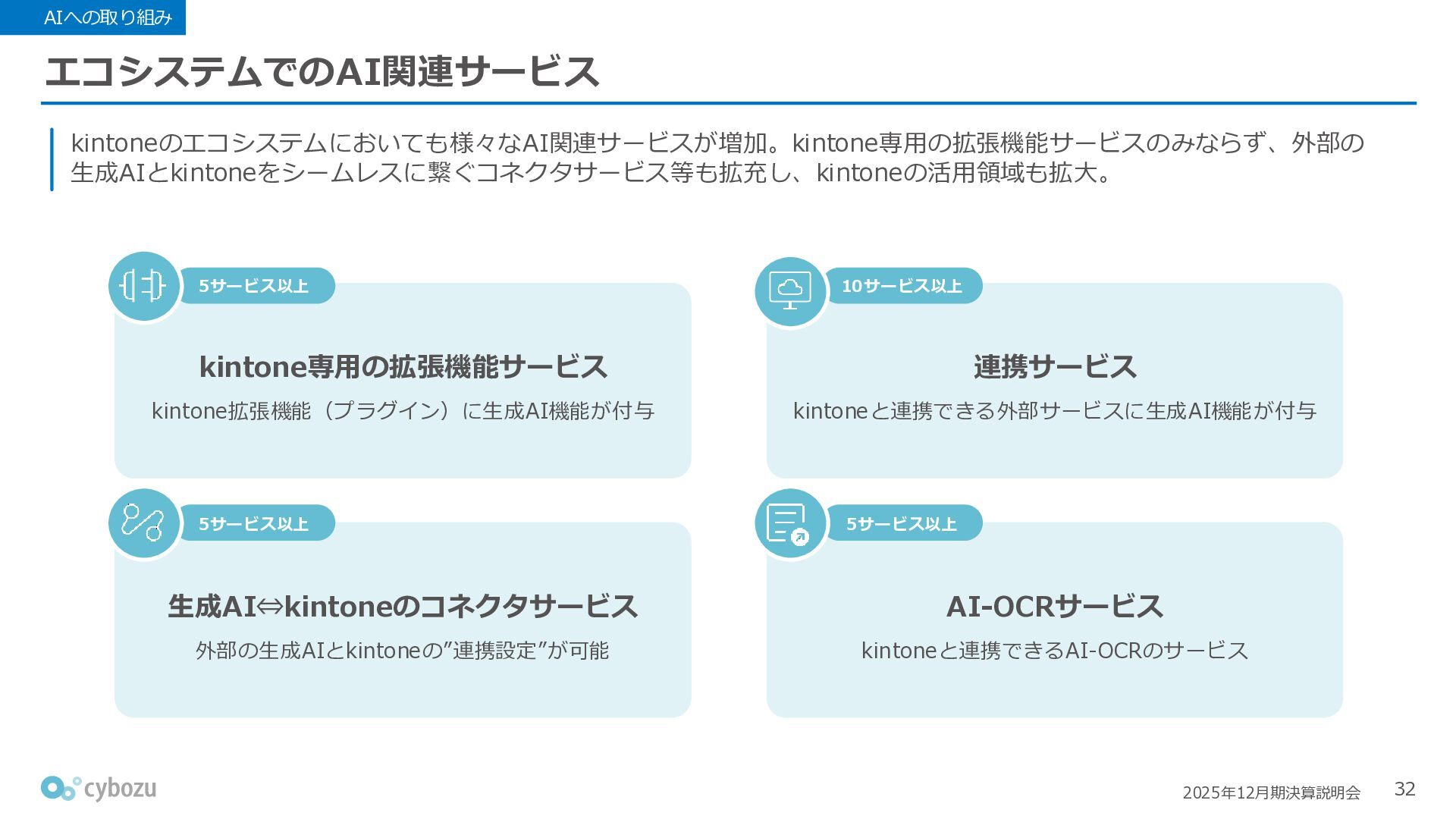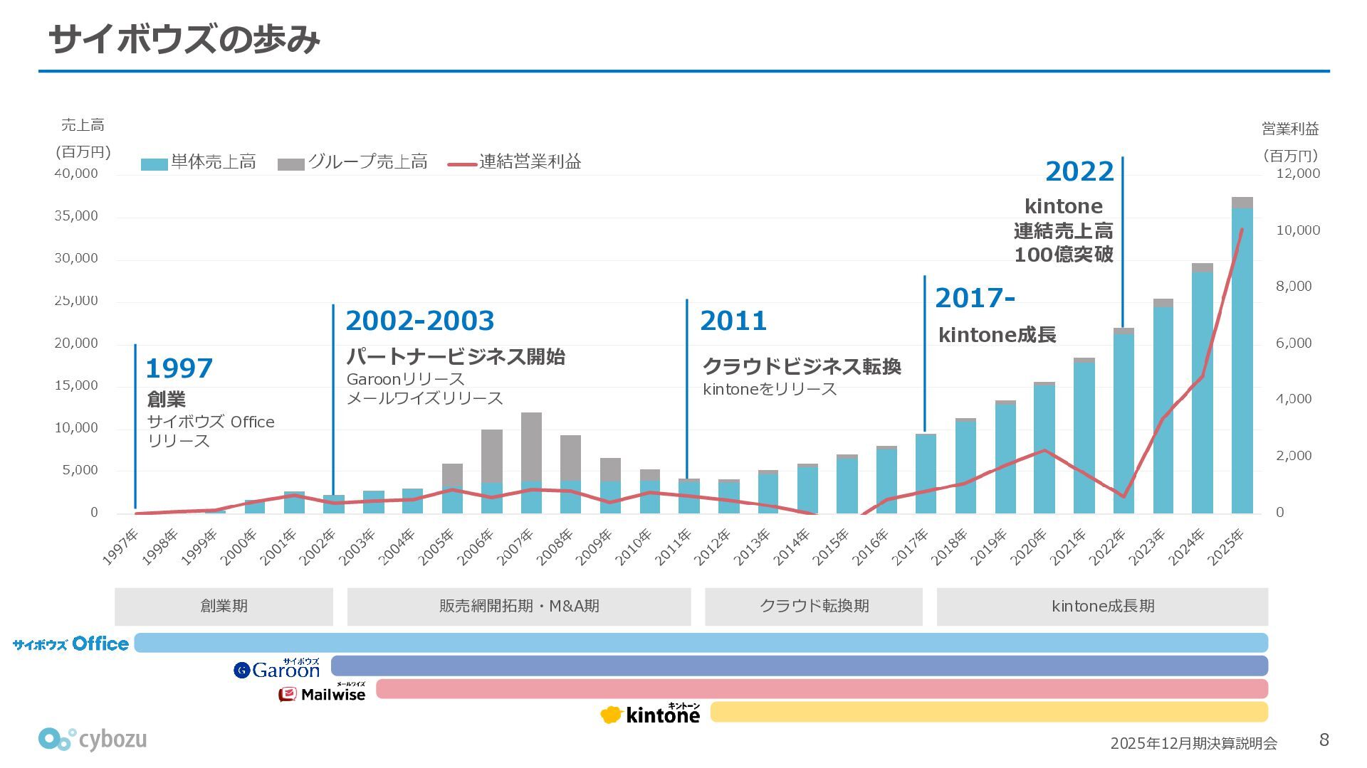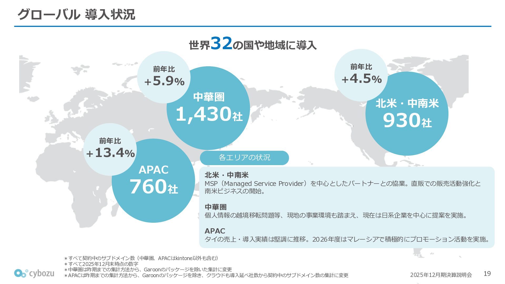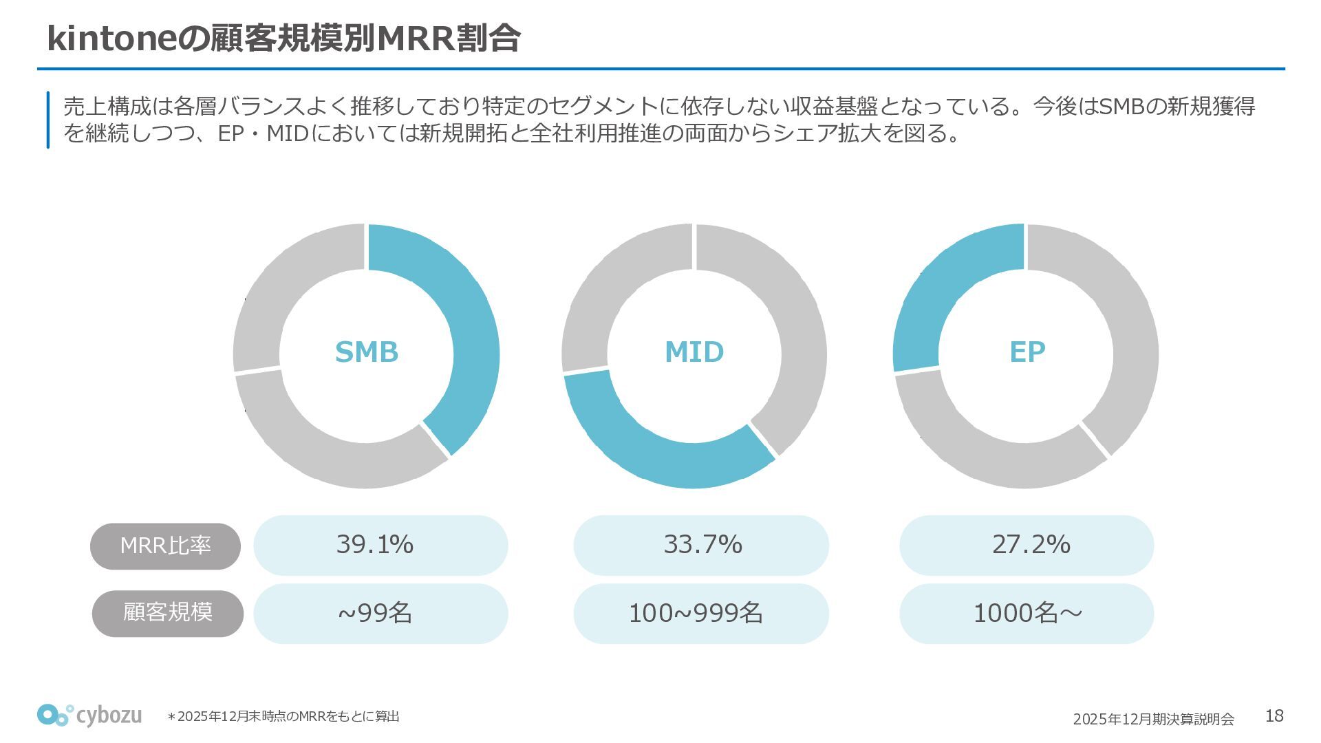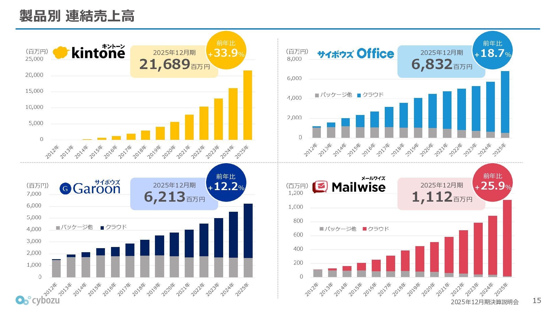 Rate:解約および契約者の減少によるサブドメイン単位の当月損失額を前月売上高で除した解約率(12月移動平均) (2) Net Revenue Retention:1年前の時点で契約していたサブドメインの現時点の月次売上高を1年前の月次売上高で除した、年次収益継続率(12か月移動平均) (3) ARPA:1サブドメインあたりの平均売上単価(Average Revenue per Account)。チーム応援ライセンス、スクール&ペアレンツライセンス、kintoneゲストユーザーを除外。 1社が複数のサブドメインを契約することも可 *各年12月末 (社) (円) 6,000 6,900 7,500 8,300 8,700 8,800 0 1,000 2,000 3,000 4,000 5,000 6,000 7,000 8,000 9,000 10,000 2020 2021 2022 2023 2024 2025 クラウドサービス契約中企業 6,000 6,300 6,900 7,200 8,800 10,500 0 5,000 10,000 15,000 2020 2021 2022 2023 2024 2025 ARPA( 3 ) |平均売上/1サブドメイン 1.35% 1.17% 1.06% 1.17% 1.01% 0.83% 0.00% 0.50% 1.00% 1.50% 2.00% 2020 2021 2022 2023 2024 2025 Gross Revenue Churn Rate( 1 ) |解約率 99.3% 99.7% 101.6% 102.1% 101.2% 116.7% 88.0% 96.0% 104.0% 112.0% 120.0% 2020 2021 2022 2023 2024 2025 Net Revenue Retention( 2 ) |売上継続率