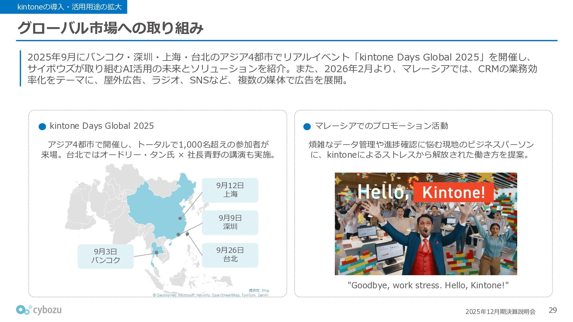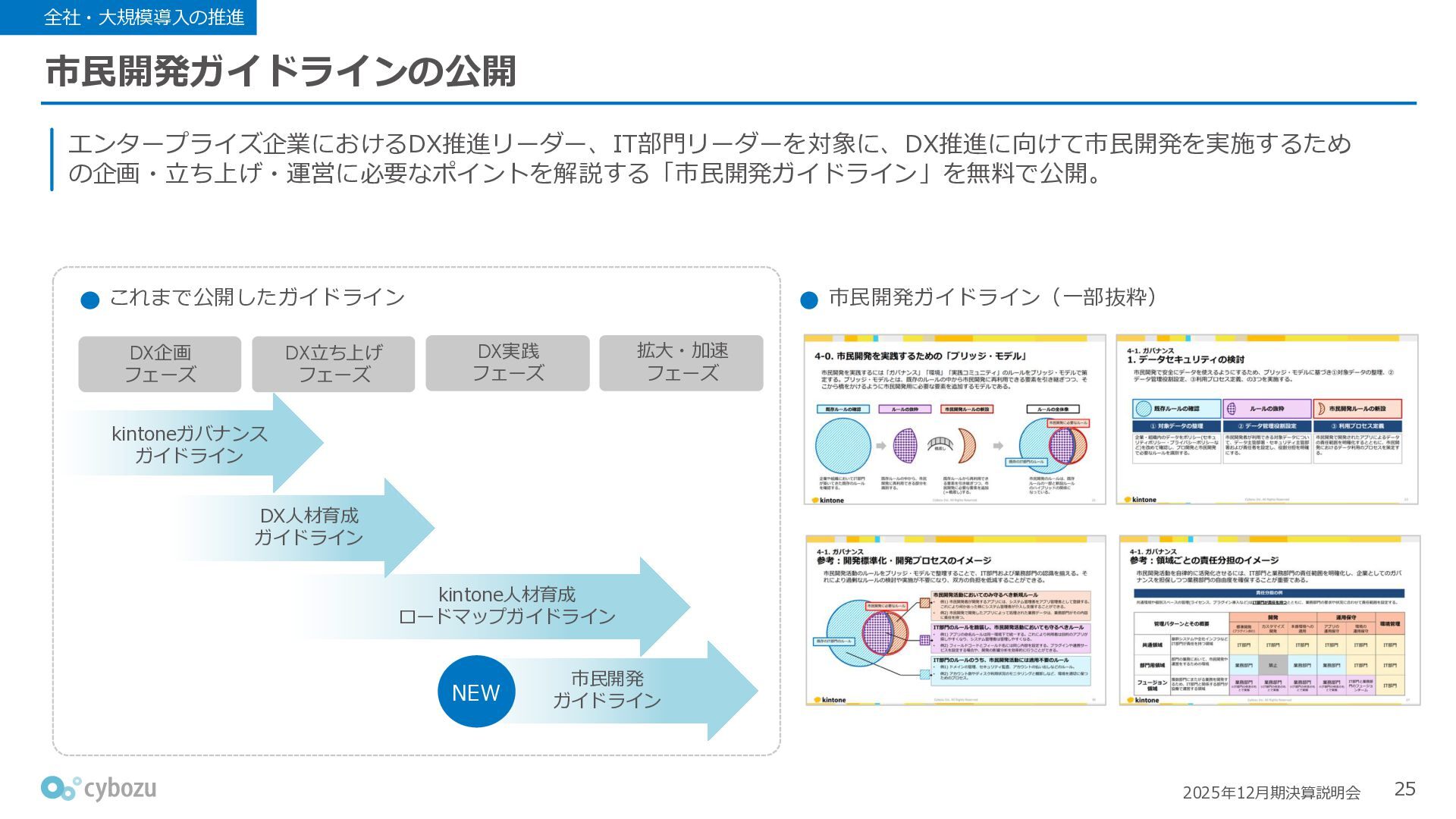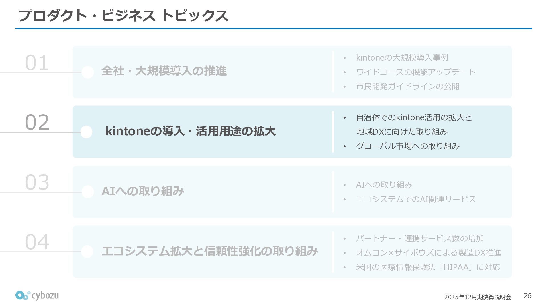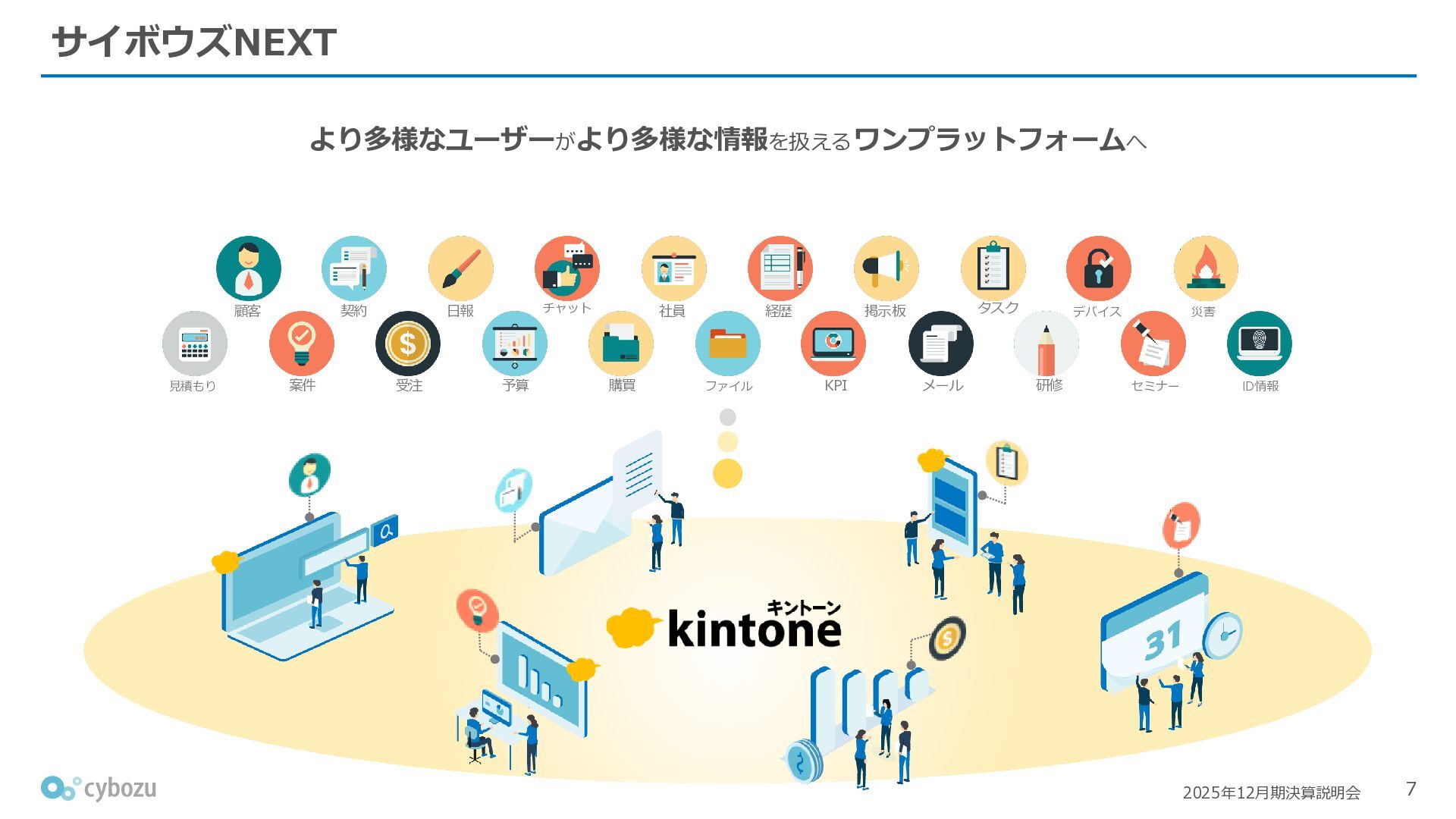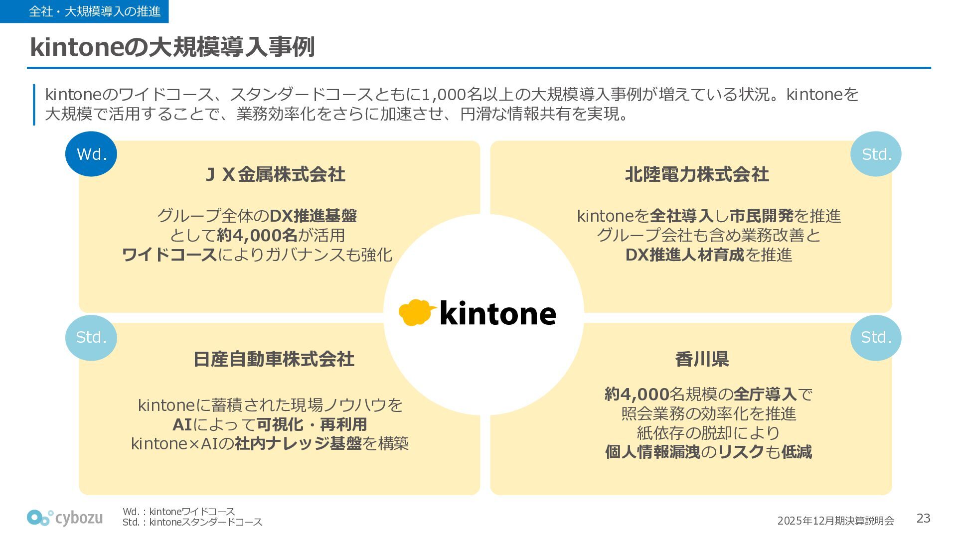 Rate:解約および契約者の減少によるサブドメイン単位の当月損失額を前月売上高で除した解約率(12月移動平均) (2) Net Revenue Retention:1年前の時点で契約していたサブドメインの現時点の月次売上高を1年前の月次売上高で除した、年次収益継続率(12か月移動平均) (3) ARPA:1サブドメインあたりの平均売上単価(Average Revenue per Account)。チーム応援ライセンス、スクール&ペアレンツライセンス、kintoneゲストユーザーを除外。 1社が複数のサブドメインを契約することも可 *各年12月末 (社) (円) 6,000 6,900 7,500 8,300 8,700 8,800 0 1,000 2,000 3,000 4,000 5,000 6,000 7,000 8,000 9,000 10,000 2020 2021 2022 2023 2024 2025 クラウドサービス契約中企業 6,000 6,300 6,900 7,200 8,800 10,500 0 5,000 10,000 15,000 2020 2021 2022 2023 2024 2025 ARPA( 3 ) |平均売上/1サブドメイン 1.35% 1.17% 1.06% 1.17% 1.01% 0.83% 0.00% 0.50% 1.00% 1.50% 2.00% 2020 2021 2022 2023 2024 2025 Gross Revenue Churn Rate( 1 ) |解約率 99.3% 99.7% 101.6% 102.1% 101.2% 116.7% 88.0% 96.0% 104.0% 112.0% 120.0% 2020 2021 2022 2023 2024 2025 Net Revenue Retention( 2 ) |売上継続率