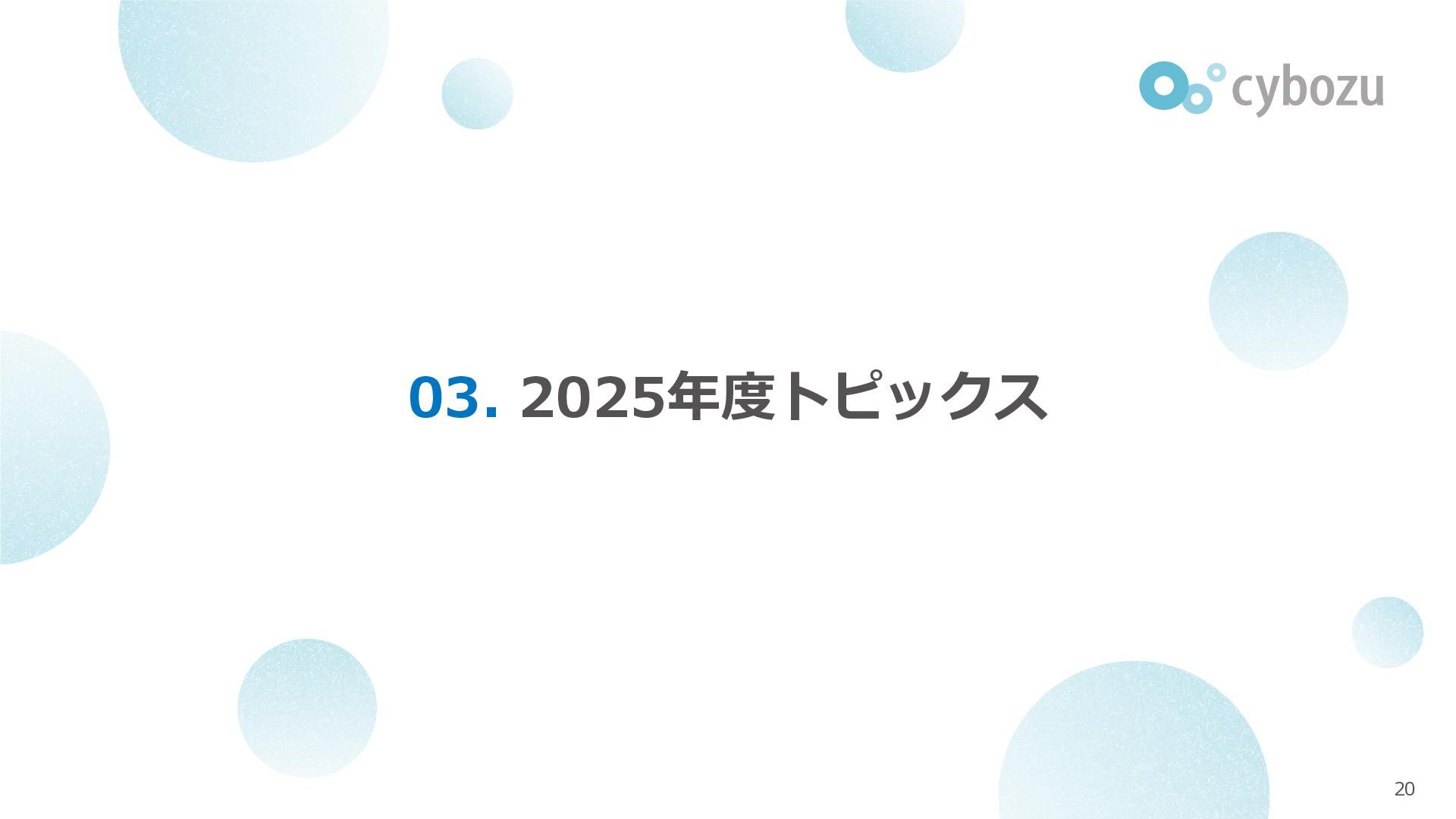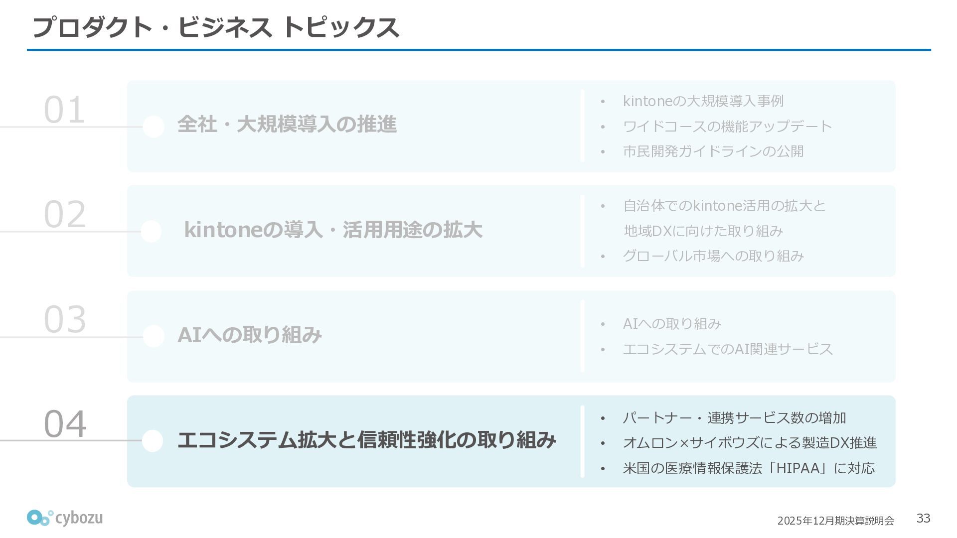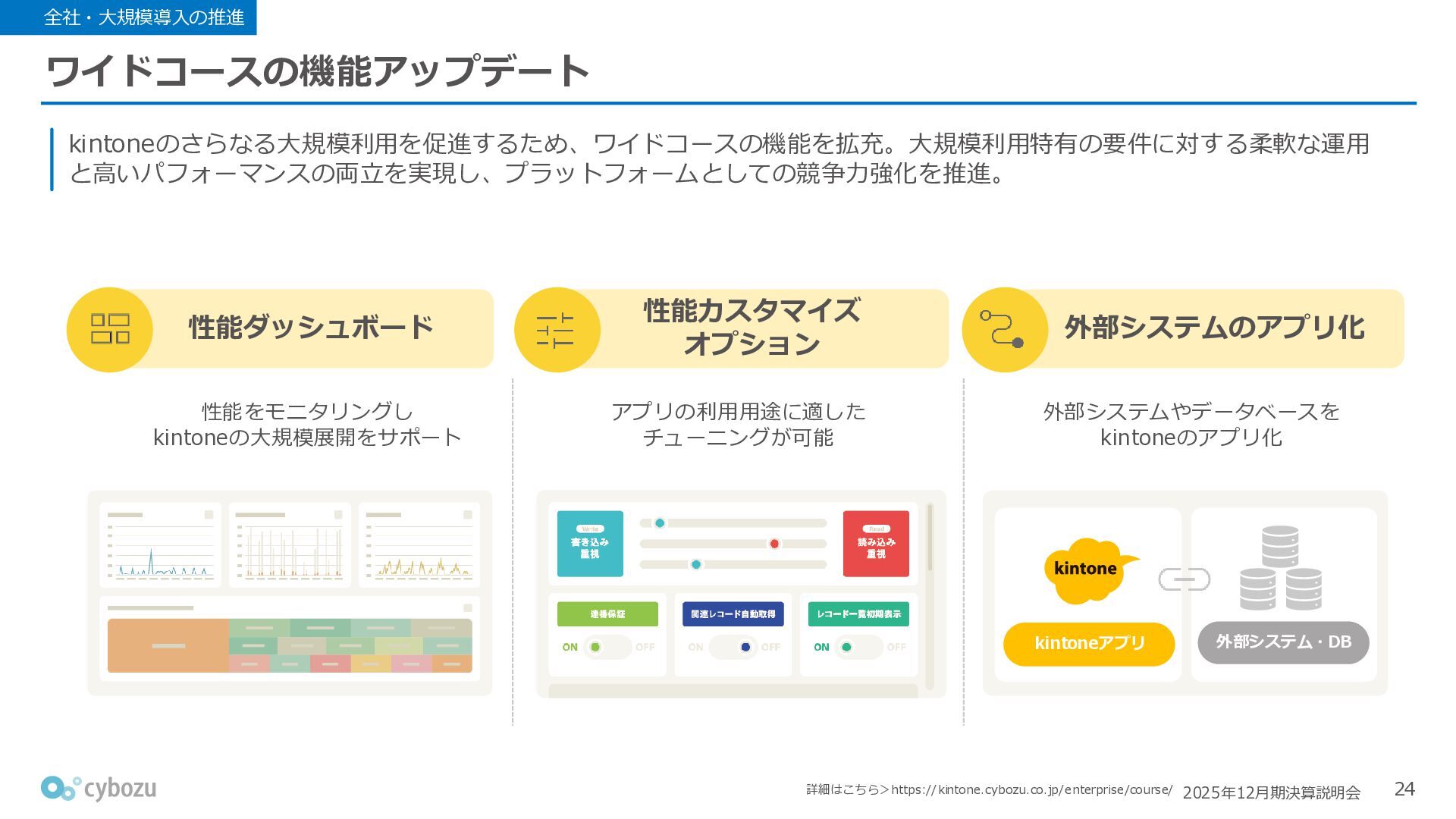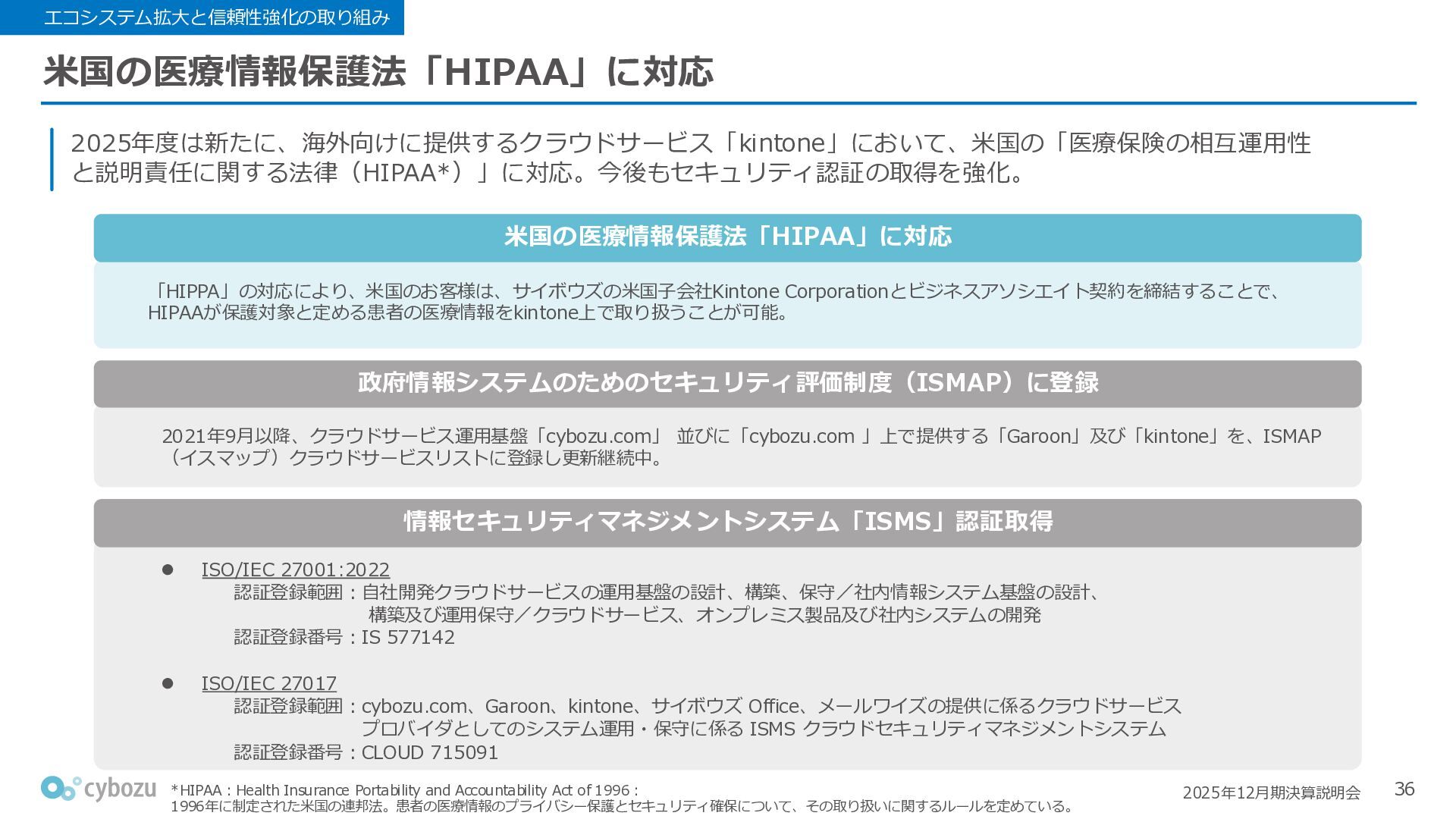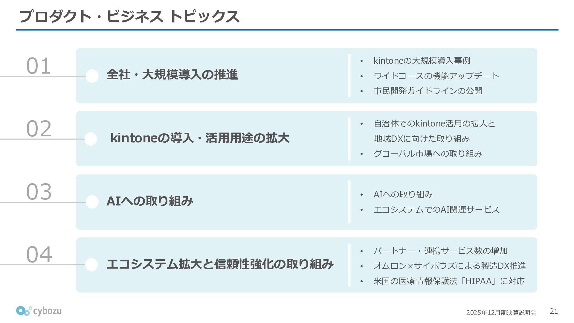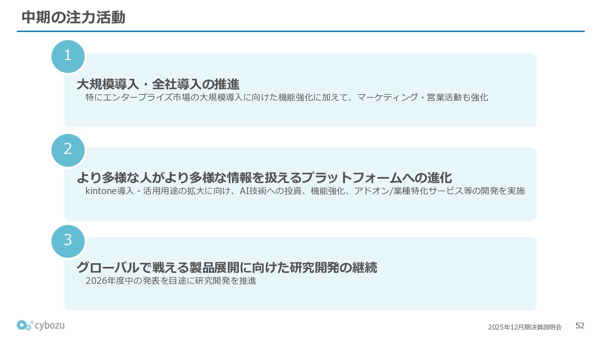 Rate:解約および契約者の減少によるサブドメイン単位の当月損失額を前月売上高で除した解約率(12月移動平均) (2) Net Revenue Retention:1年前の時点で契約していたサブドメインの現時点の月次売上高を1年前の月次売上高で除した、年次収益継続率(12か月移動平均) (3) ARPA:1サブドメインあたりの平均売上単価(Average Revenue per Account)。チーム応援ライセンス、スクール&ペアレンツライセンス、kintoneゲストユーザーを除外。 1社が複数のサブドメインを契約することも可 *各年12月末 (社) (円) 6,000 6,900 7,500 8,300 8,700 8,800 0 1,000 2,000 3,000 4,000 5,000 6,000 7,000 8,000 9,000 10,000 2020 2021 2022 2023 2024 2025 クラウドサービス契約中企業 6,000 6,300 6,900 7,200 8,800 10,500 0 5,000 10,000 15,000 2020 2021 2022 2023 2024 2025 ARPA( 3 ) |平均売上/1サブドメイン 1.35% 1.17% 1.06% 1.17% 1.01% 0.83% 0.00% 0.50% 1.00% 1.50% 2.00% 2020 2021 2022 2023 2024 2025 Gross Revenue Churn Rate( 1 ) |解約率 99.3% 99.7% 101.6% 102.1% 101.2% 116.7% 88.0% 96.0% 104.0% 112.0% 120.0% 2020 2021 2022 2023 2024 2025 Net Revenue Retention( 2 ) |売上継続率