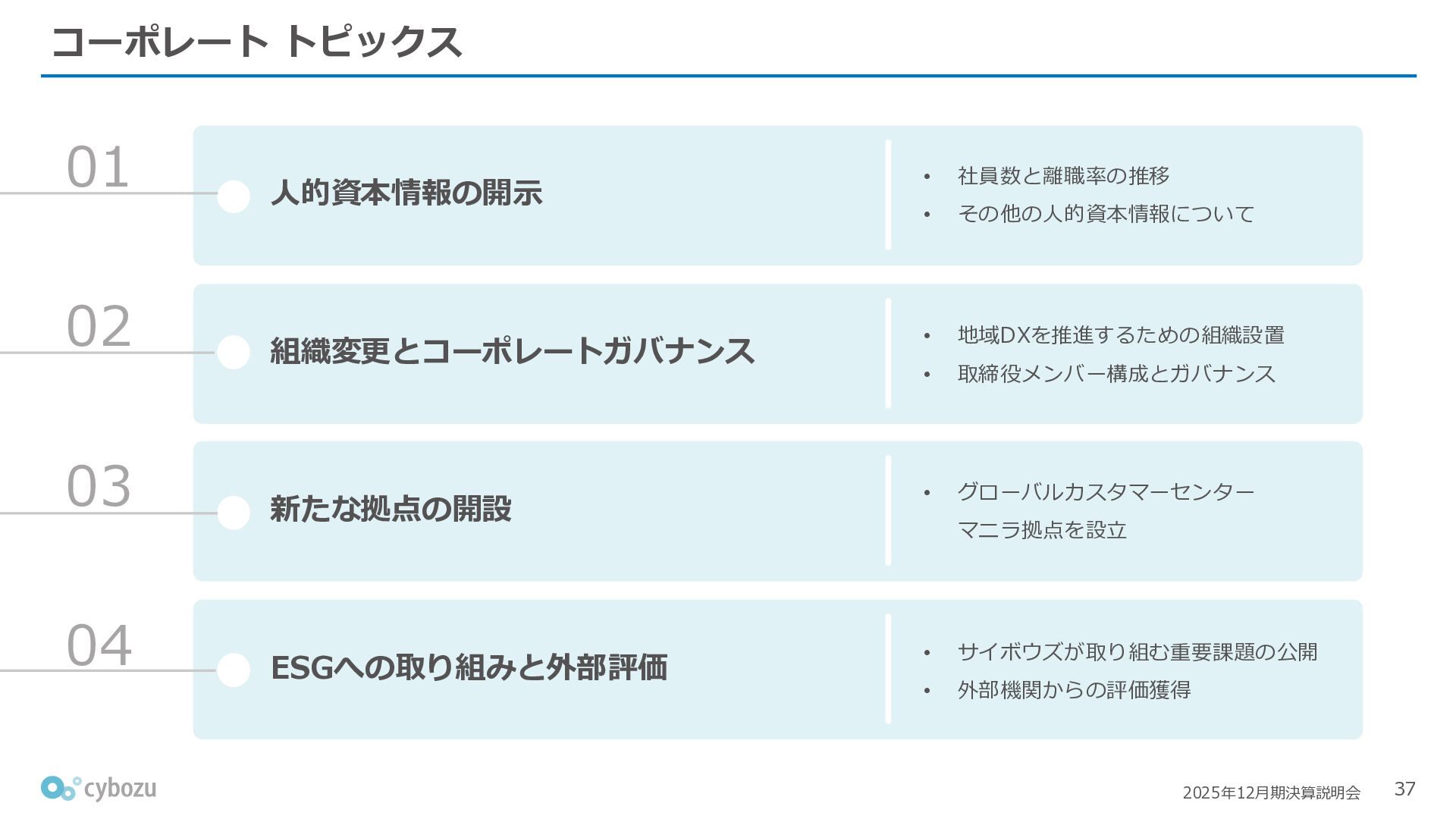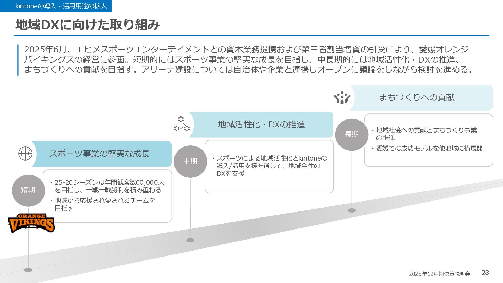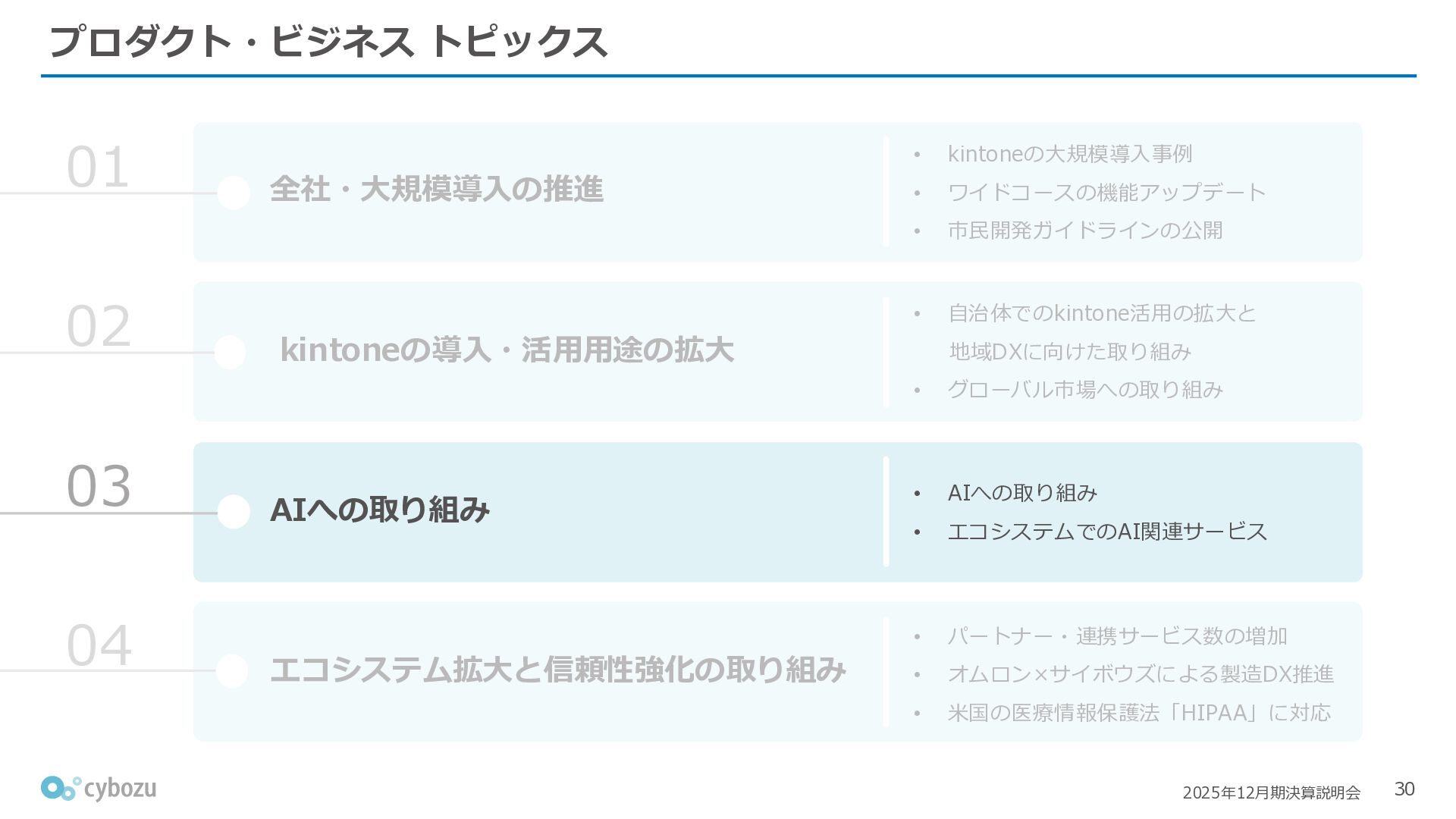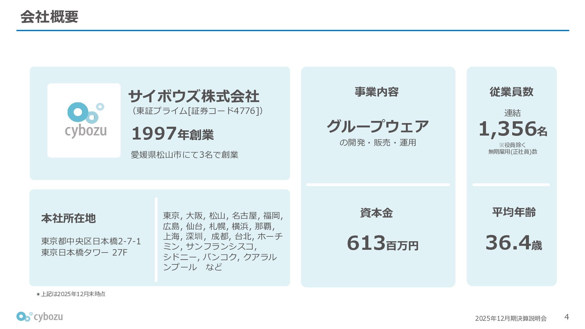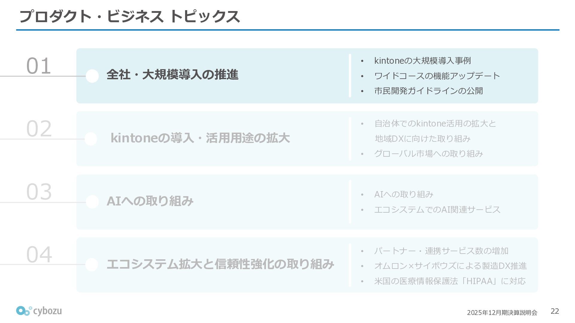 Rate:解約および契約者の減少によるサブドメイン単位の当月損失額を前月売上高で除した解約率(12月移動平均) (2) Net Revenue Retention:1年前の時点で契約していたサブドメインの現時点の月次売上高を1年前の月次売上高で除した、年次収益継続率(12か月移動平均) (3) ARPA:1サブドメインあたりの平均売上単価(Average Revenue per Account)。チーム応援ライセンス、スクール&ペアレンツライセンス、kintoneゲストユーザーを除外。 1社が複数のサブドメインを契約することも可 *各年12月末 (社) (円) 6,000 6,900 7,500 8,300 8,700 8,800 0 1,000 2,000 3,000 4,000 5,000 6,000 7,000 8,000 9,000 10,000 2020 2021 2022 2023 2024 2025 クラウドサービス契約中企業 6,000 6,300 6,900 7,200 8,800 10,500 0 5,000 10,000 15,000 2020 2021 2022 2023 2024 2025 ARPA( 3 ) |平均売上/1サブドメイン 1.35% 1.17% 1.06% 1.17% 1.01% 0.83% 0.00% 0.50% 1.00% 1.50% 2.00% 2020 2021 2022 2023 2024 2025 Gross Revenue Churn Rate( 1 ) |解約率 99.3% 99.7% 101.6% 102.1% 101.2% 116.7% 88.0% 96.0% 104.0% 112.0% 120.0% 2020 2021 2022 2023 2024 2025 Net Revenue Retention( 2 ) |売上継続率
