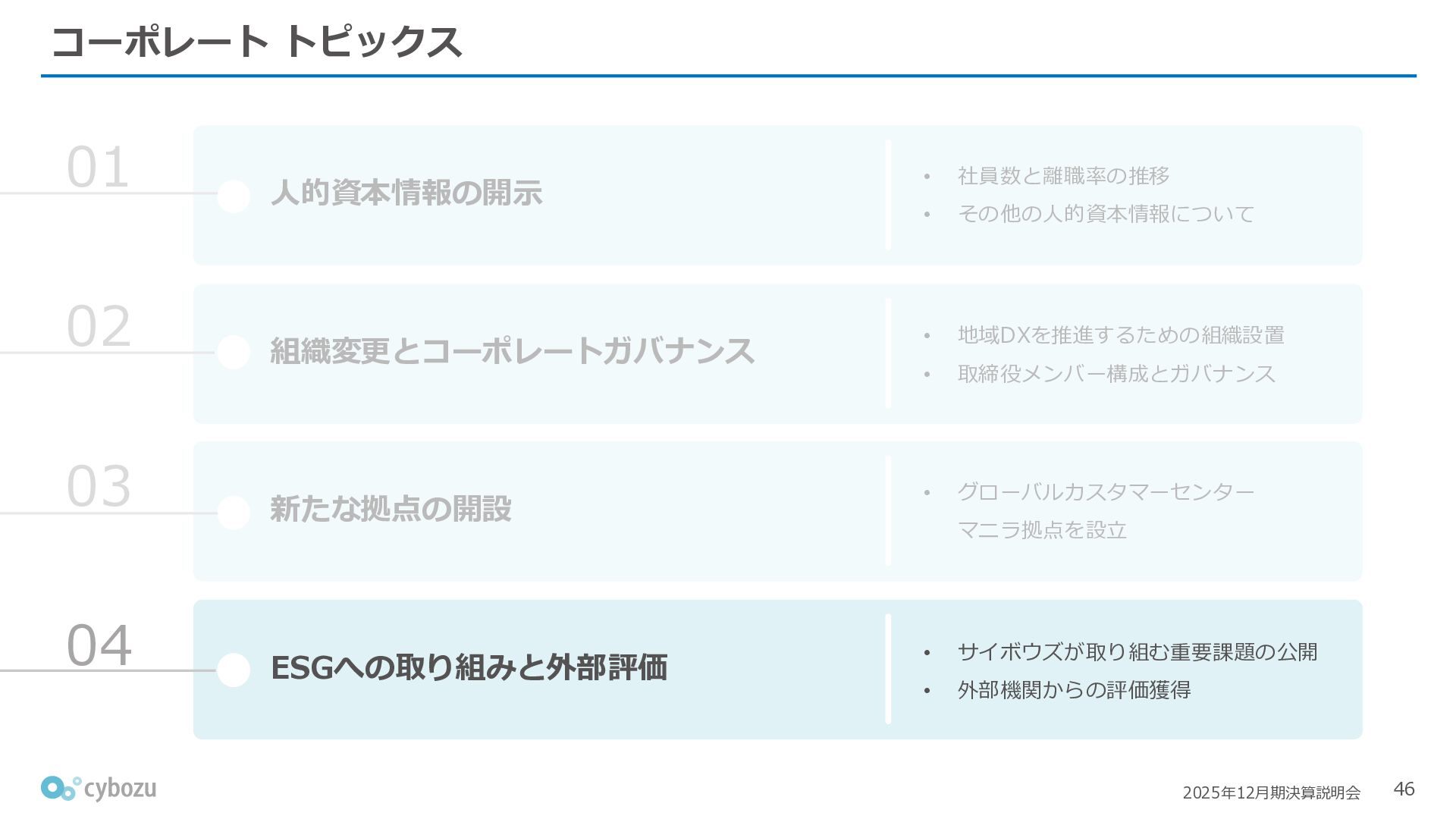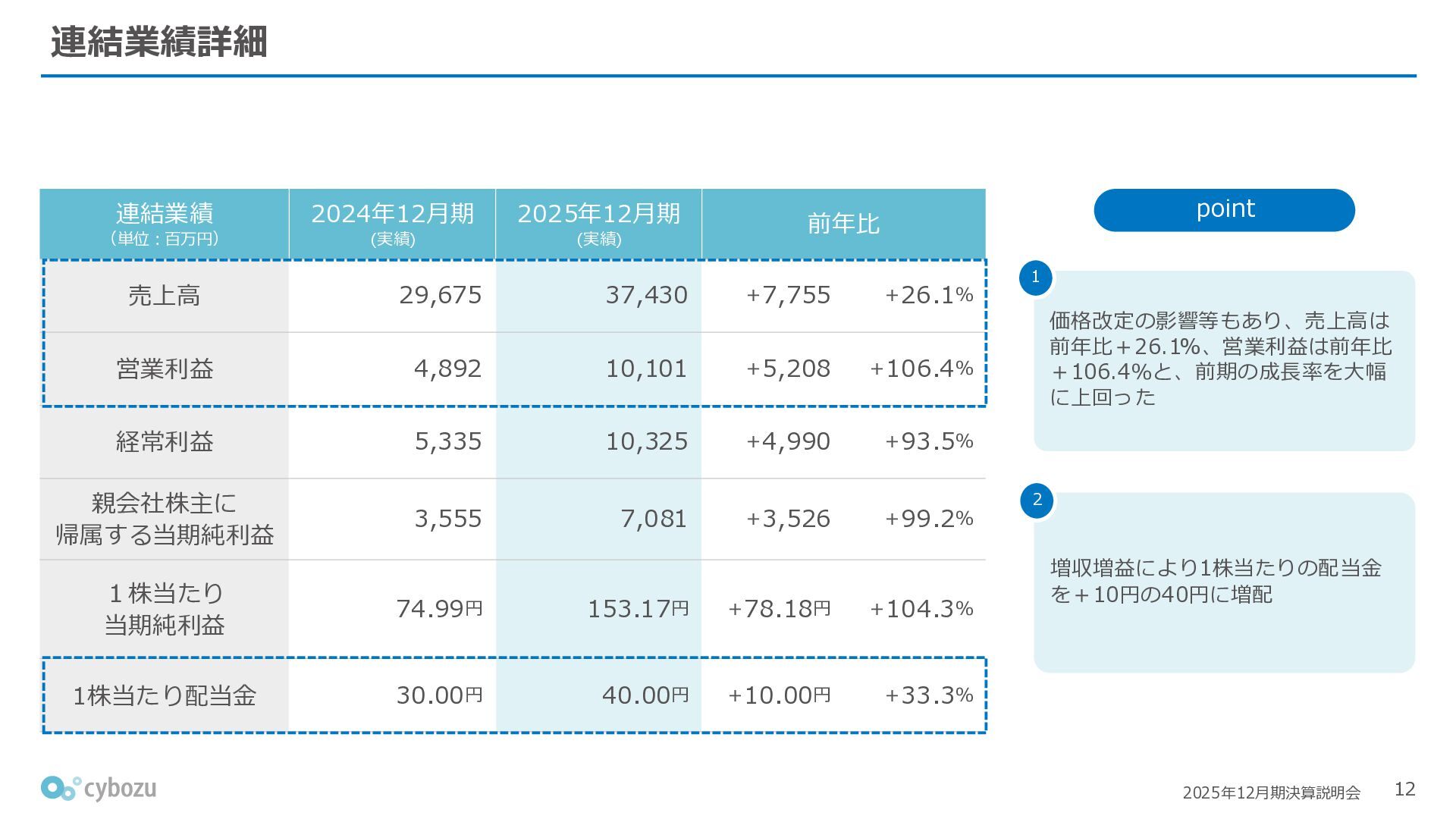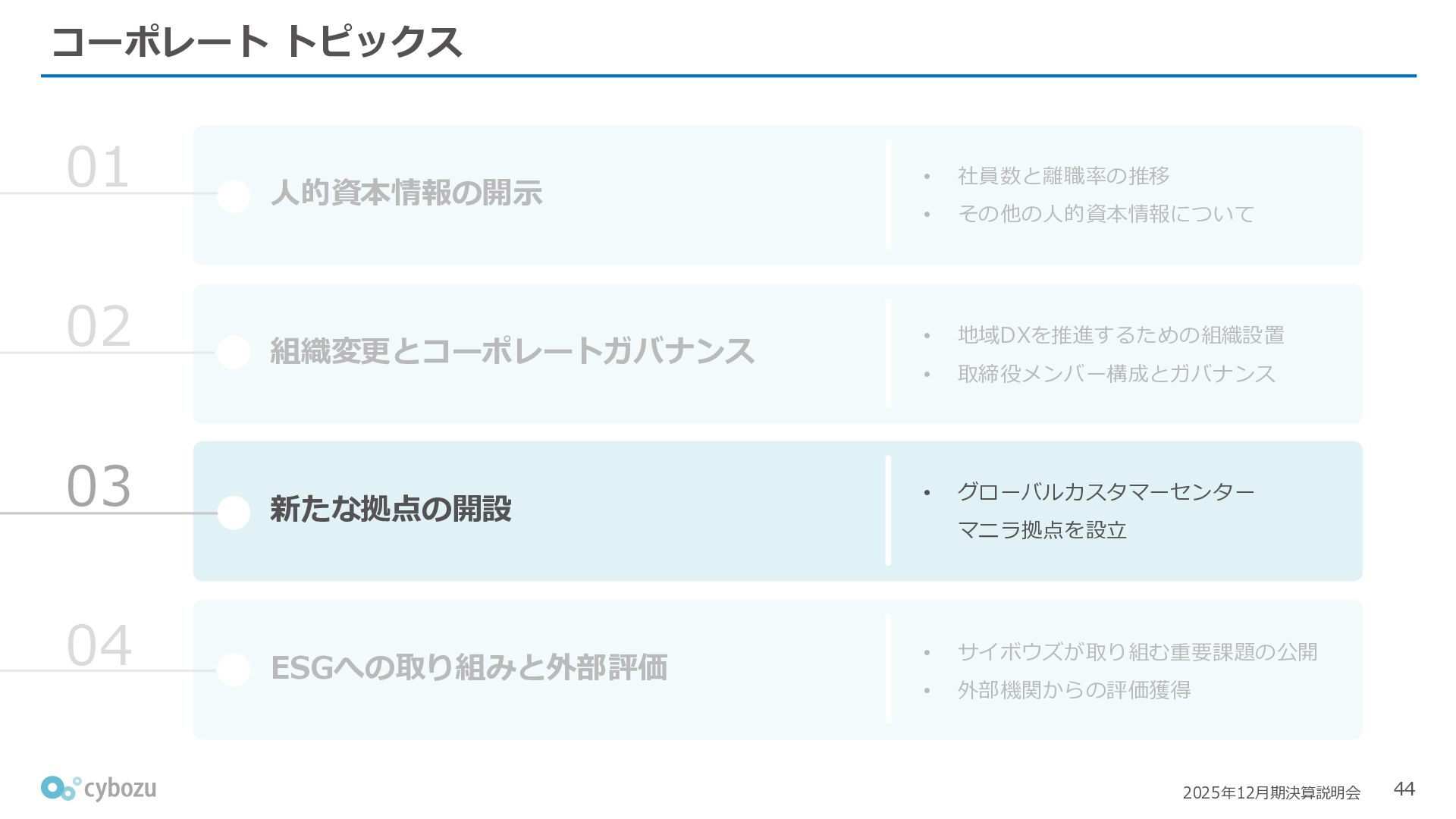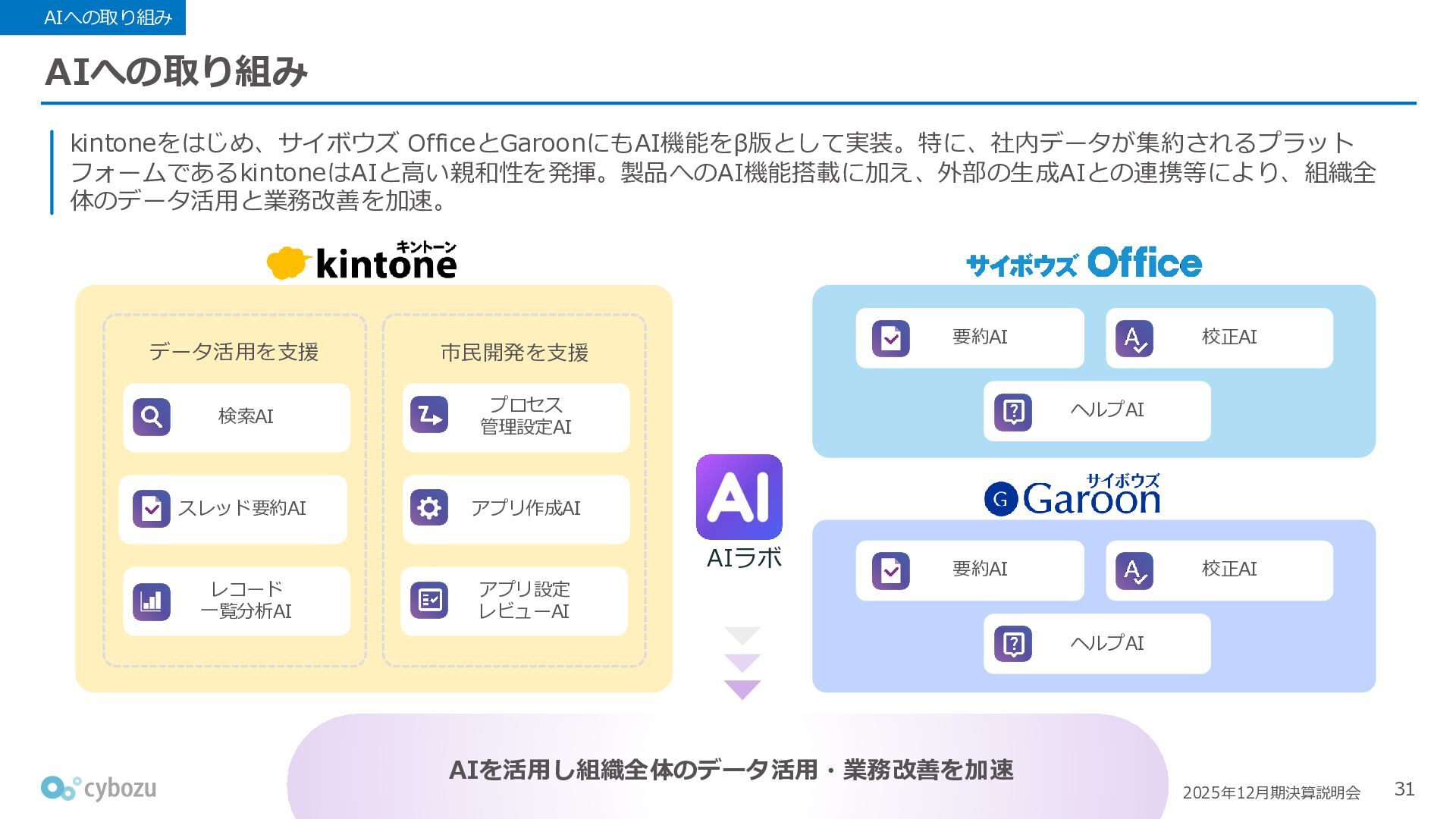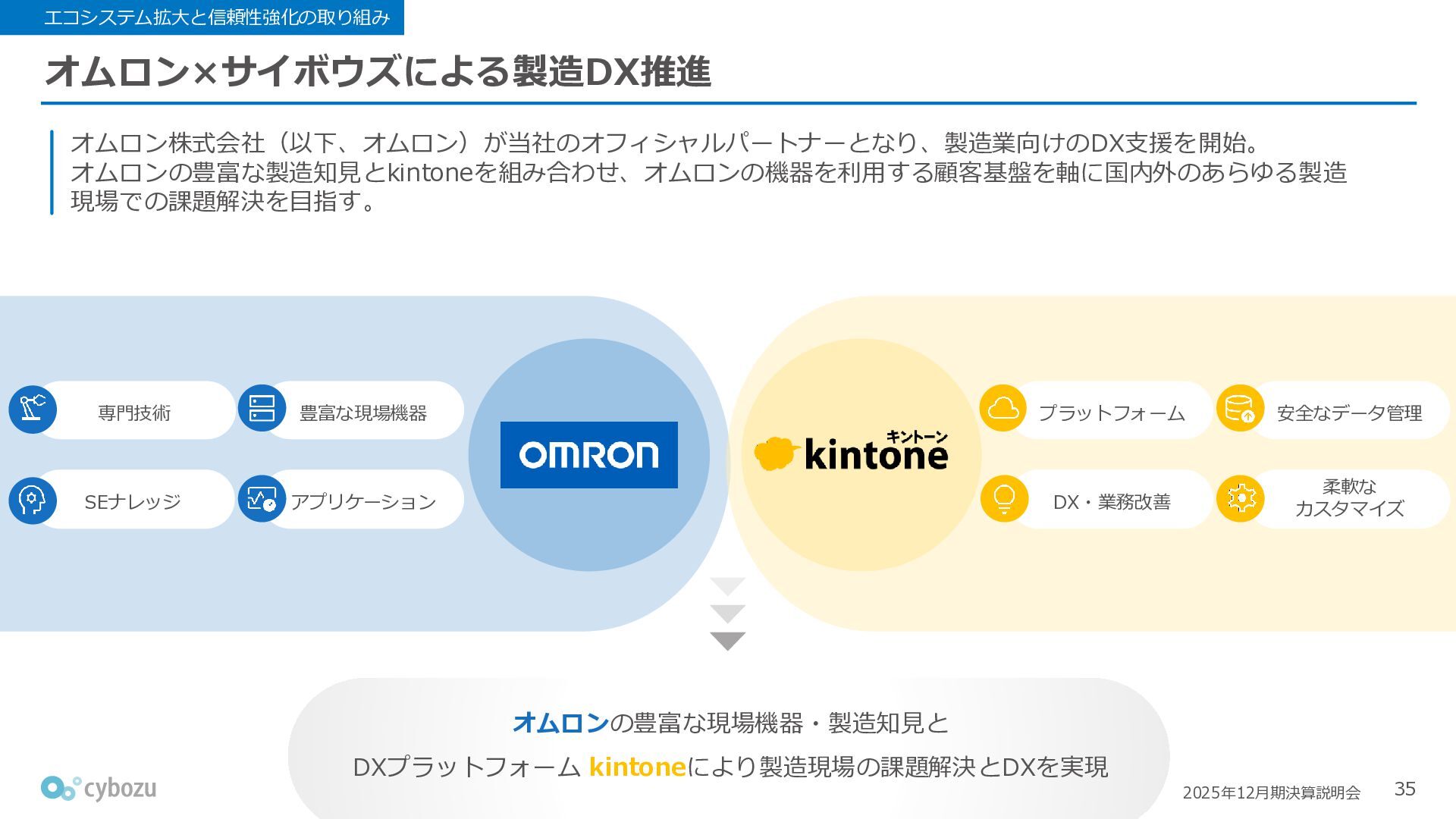Rate:解約および契約者の減少によるサブドメイン単位の当月損失額を前月売上高で除した解約率(12月移動平均) (2) Net Revenue Retention:1年前の時点で契約していたサブドメインの現時点の月次売上高を1年前の月次売上高で除した、年次収益継続率(12か月移動平均) (3) ARPA:1サブドメインあたりの平均売上単価(Average Revenue per Account)。チーム応援ライセンス、スクール&ペアレンツライセンス、kintoneゲストユーザーを除外。 1社が複数のサブドメインを契約することも可 *各年12月末 (社) (円) 6,000 6,900 7,500 8,300 8,700 8,800 0 1,000 2,000 3,000 4,000 5,000 6,000 7,000 8,000 9,000 10,000 2020 2021 2022 2023 2024 2025 クラウドサービス契約中企業 6,000 6,300 6,900 7,200 8,800 10,500 0 5,000 10,000 15,000 2020 2021 2022 2023 2024 2025 ARPA( 3 ) |平均売上/1サブドメイン 1.35% 1.17% 1.06% 1.17% 1.01% 0.83% 0.00% 0.50% 1.00% 1.50% 2.00% 2020 2021 2022 2023 2024 2025 Gross Revenue Churn Rate( 1 ) |解約率 99.3% 99.7% 101.6% 102.1% 101.2% 116.7% 88.0% 96.0% 104.0% 112.0% 120.0% 2020 2021 2022 2023 2024 2025 Net Revenue Retention( 2 ) |売上継続率