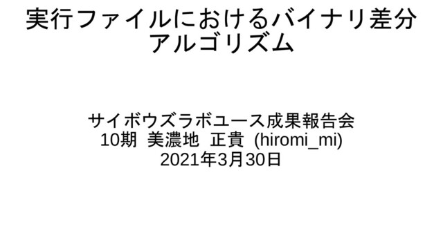 実行ファイルにおけるバイナリ差分 アルゴリズム サイボウズラボユース成果報告会 10期 美濃地 正貴 (hiromi_mi) 2021年3月30日