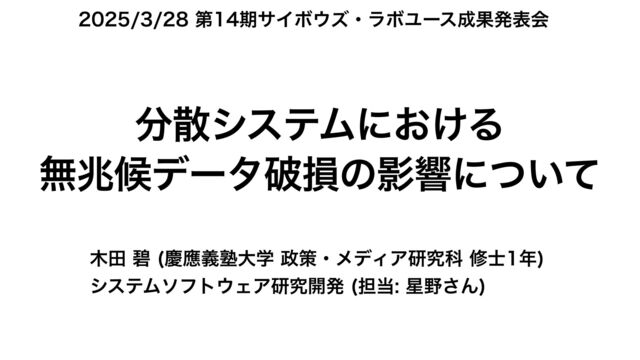 ࢄγεςϜʹ͓͚Δ ແஹީσʔλഁଛͷӨڹʹ͍ͭͯ ୈظαΠϘζɾϥϘϢʔεՌൃදձ ాป ܚጯٛक़େֶࡦɾϝσΟΞݚڀՊम࢜ γεςϜιϑτΣΞݚڀ։ൃ ୲͞Μ