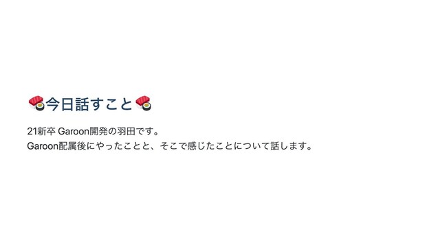 今日話すこと 21新卒 Garoon開発の羽田です。 Garoon配属後にやったことと、そこで感じたことについて話します。