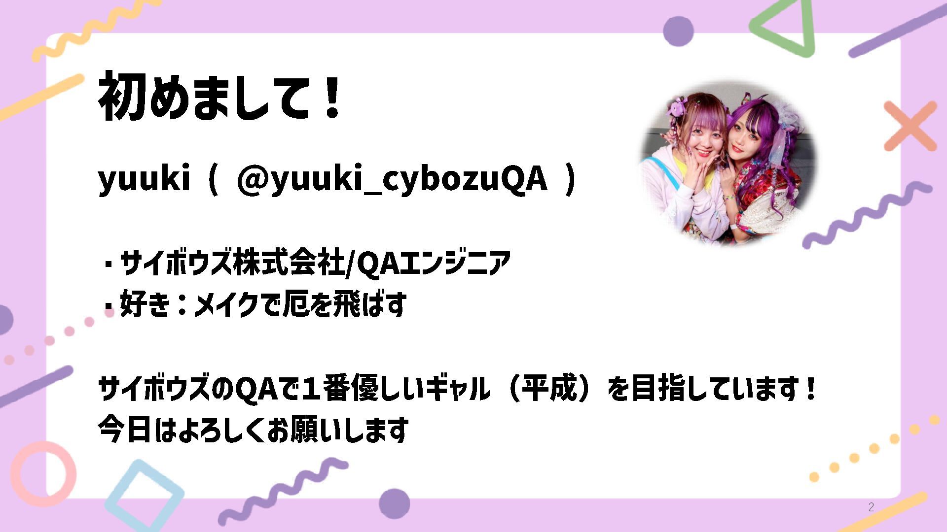 初めまして! yuuki ( @yuuki_cybozuQA ) ・サイボウズ株式会社 /QAエンジニア ・好き:メイクで厄を飛ばす サイボウズの QAで1番優しいギャル(平成)を目指しています!