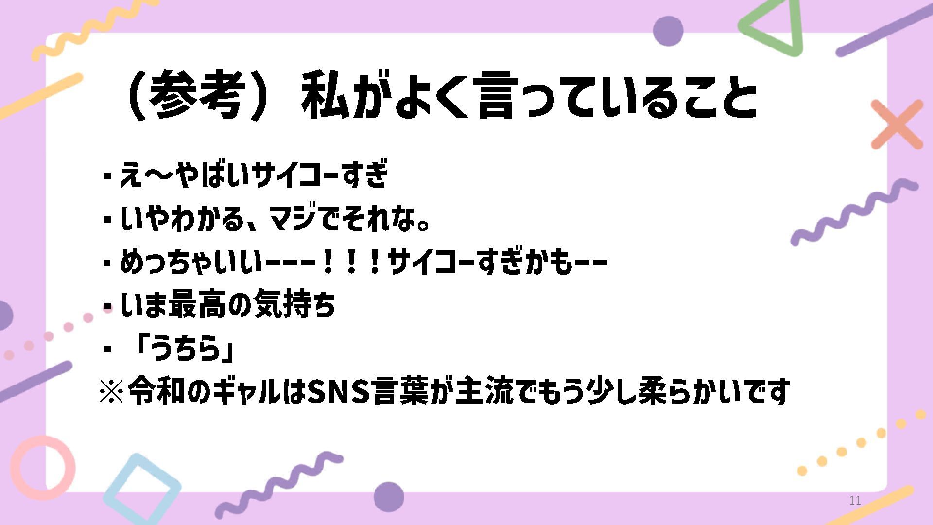 (参考)私がよく言っていること ・え~やばいサイコーすぎ ・いやわかる、マジでそれな。 ・めっちゃいいーーー!!!サイコーすぎかもーー ・いま最高の気持ち ・「うちら」 ※令和のギャルは SNS 言葉が主流でもう少し柔らかいです 11
