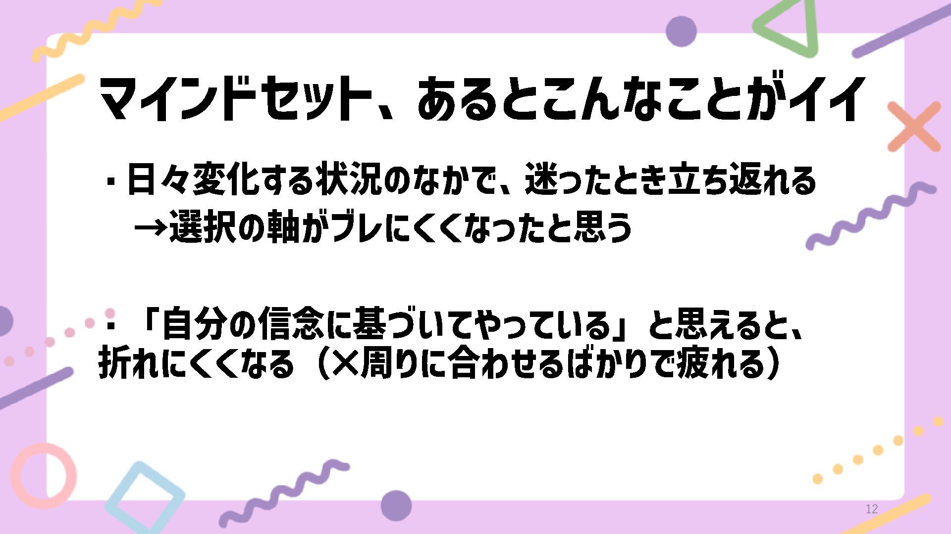 マインドセット、あるとこんなことがイイ ・日々変化する状況のなかで、迷ったとき立ち返れる →選択の軸がブレにくくなったと思う ・「自分の信念に基づいてやっている」と思えると、 折れにくくなる( 周りに合わせるばかりで疲れる) 12