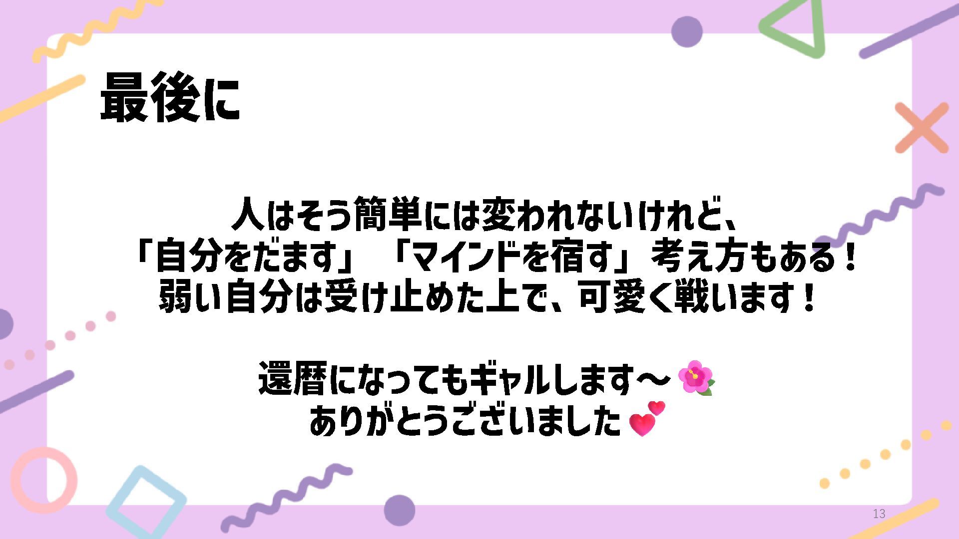 最後に 人はそう簡単には変われないけれど、 「自分をだます」「マインドを宿す」考え方もある! 弱い自分は受け止めた上で、可愛く戦います! 還暦になってもギャルします~ ありがとうございました 13