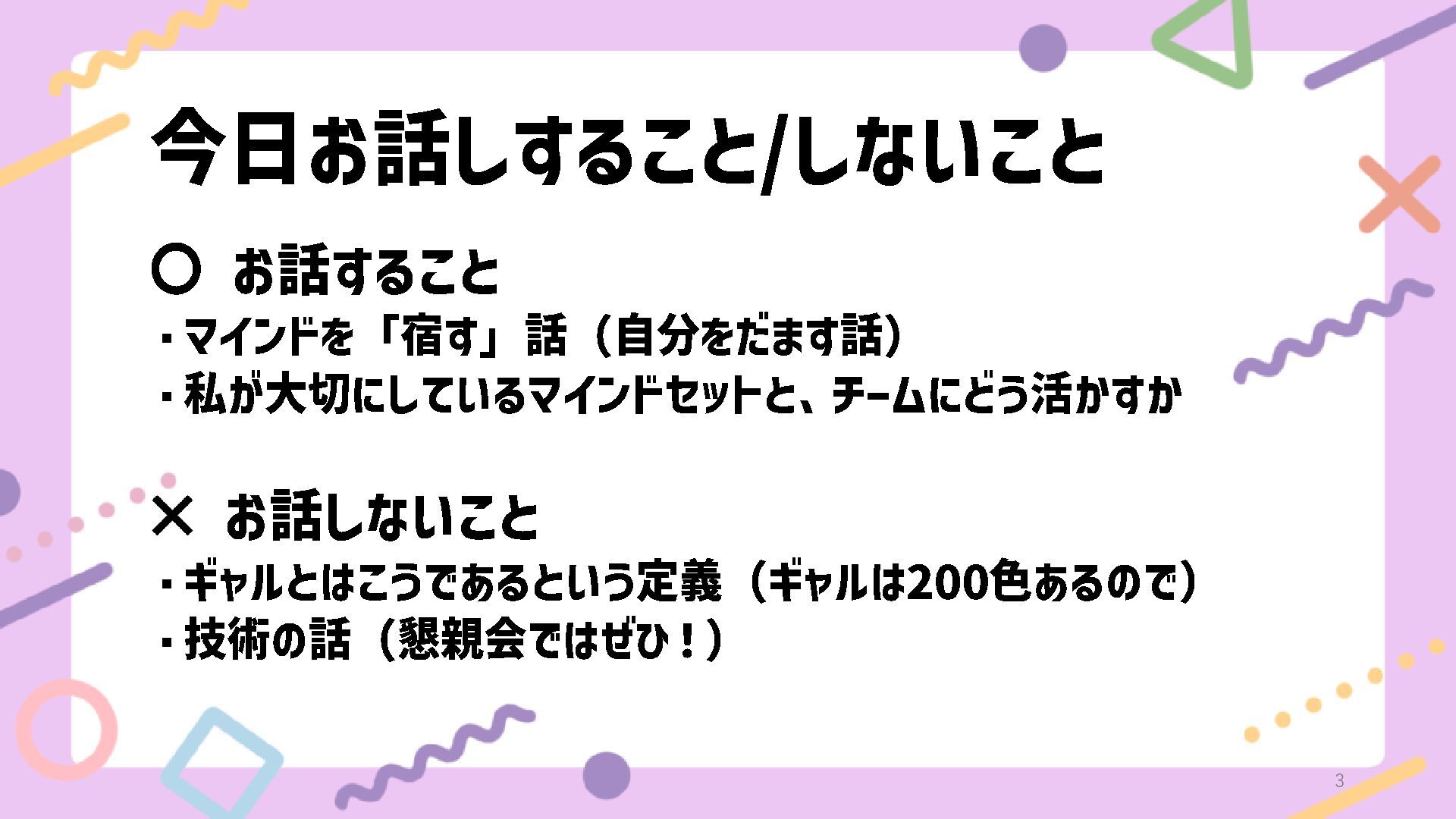 今日お話しすること /しないこと 〇 お話すること ・マインドを「宿す」話(自分をだます話) ・私が大切にしているマインドセットと、チームにどう活かすか お話しないこと ・ギャルとはこうであるという定義(ギャルは 200 色あるので)