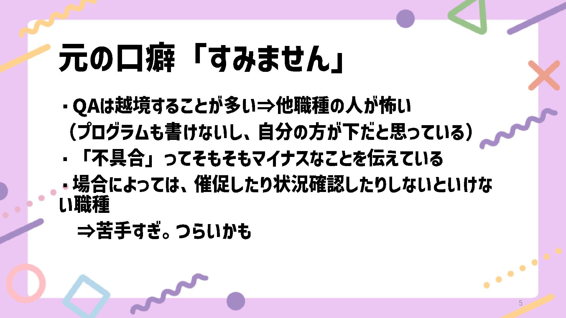 元の口癖「すみません」 ・ QAは越境することが多い ⇒他職種の人が怖い (プログラムも書けないし、自分の方が下だと思っている) ・「不具合」ってそもそもマイナスなことを伝えている ・場合によっては、催促したり状況確認したりしないといけな い職種 ⇒苦手すぎ。つらいかも 5