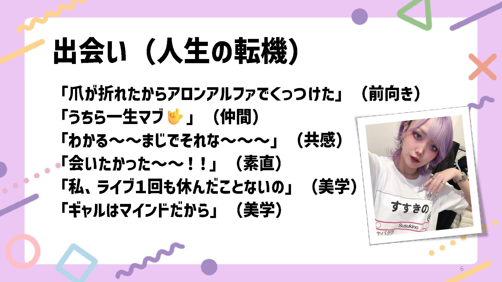 出会い(人生の転機) 「爪が折れたからアロンアルファでくっつけた」(前向き) 「うちら一生マブ 」(仲間) 「わかる~~まじでそれな~~~」(共感) 「会いたかった~~!!」(素直) 「私、ライブ1回も休んだことないの」(美学) 「ギャルはマインドだから」(美学) 6