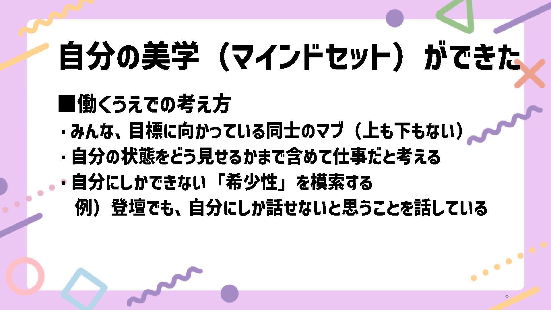 自分の美学(マインドセット)ができた ▪働くうえでの考え方 ・みんな、目標に向かっている同士のマブ(上も下もない) ・自分の状態をどう見せるかまで含めて仕事だと考える ・自分にしかできない「希少性」を模索する 例)登壇でも、自分にしか話せないと思うことを話している 8