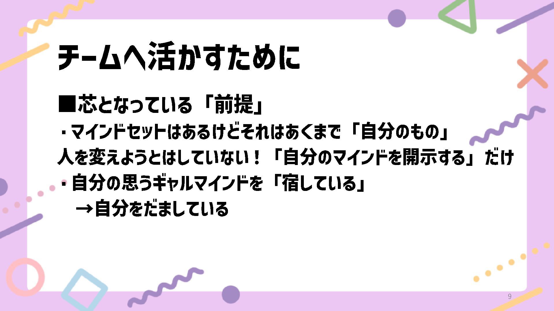 チームへ活かすために ▪芯となっている「前提」 ・マインドセットはあるけどそれはあくまで「自分のもの」 人を変えようとはしていない!「自分のマインドを開示する」だけ ・自分の思うギャルマインドを「宿している」 →自分をだましている 9