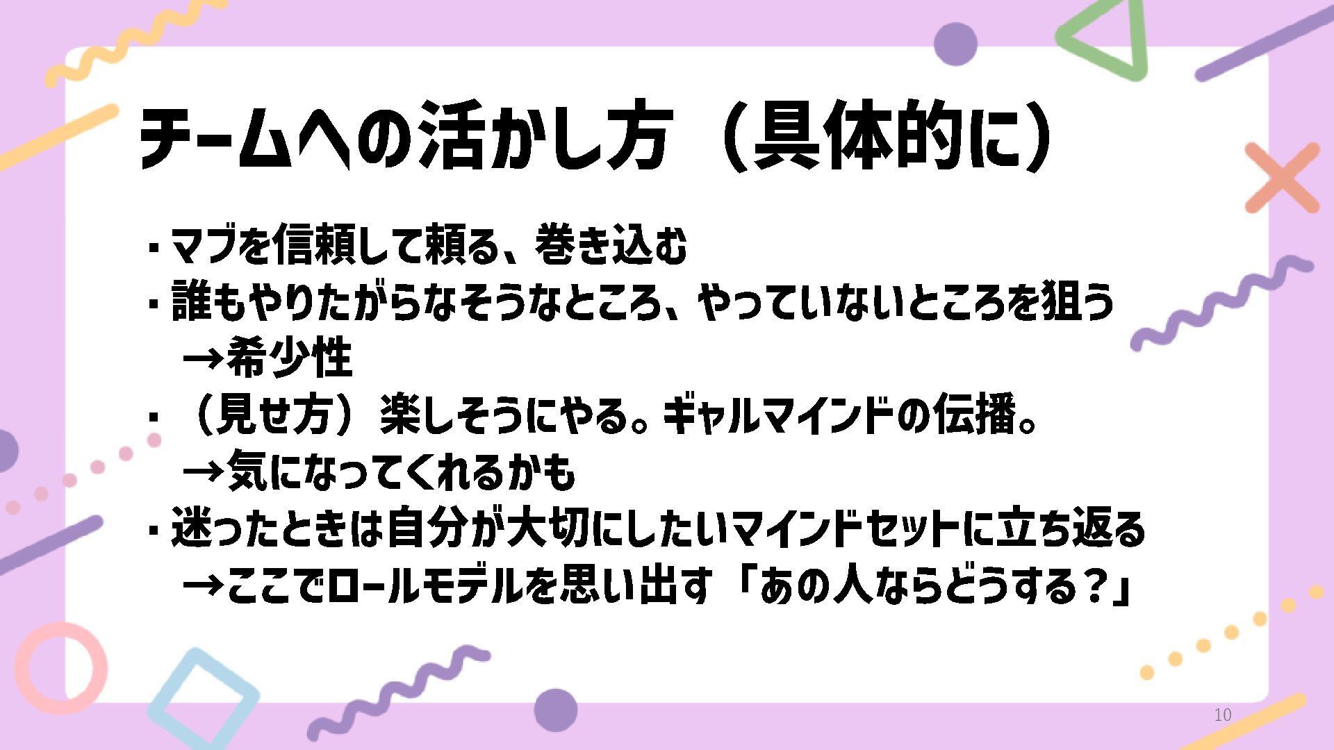 チームへの活かし方(具体的に) ・マブを信頼して頼る、巻き込む ・誰もやりたがらなそうなところ、やっていないところを狙う →希少性 ・(見せ方)楽しそうにやる。ギャルマインドの伝播。 →気になってくれるかも ・迷ったときは自分が大切にしたいマインドセットに立ち返る →ここでロールモデルを思い出す「あの人ならどうする?」 10