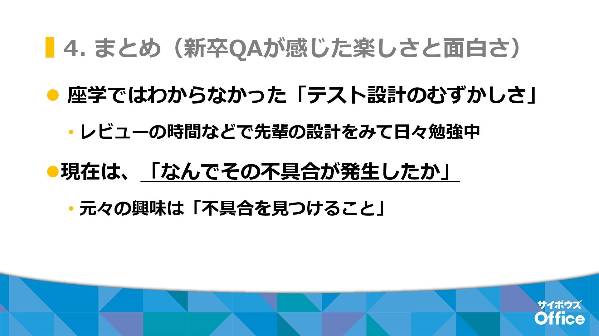 4. まとめ(新卒QAが感じた楽しさと面白さ) ⚫ 座学ではわからなかった「テスト設計のむずかしさ」 • レビューの時間などで先輩の設計をみて日々勉強中 ⚫現在は、「なんでその不具合が発生したか」 • 元々の興味は「不具合を見つけること」